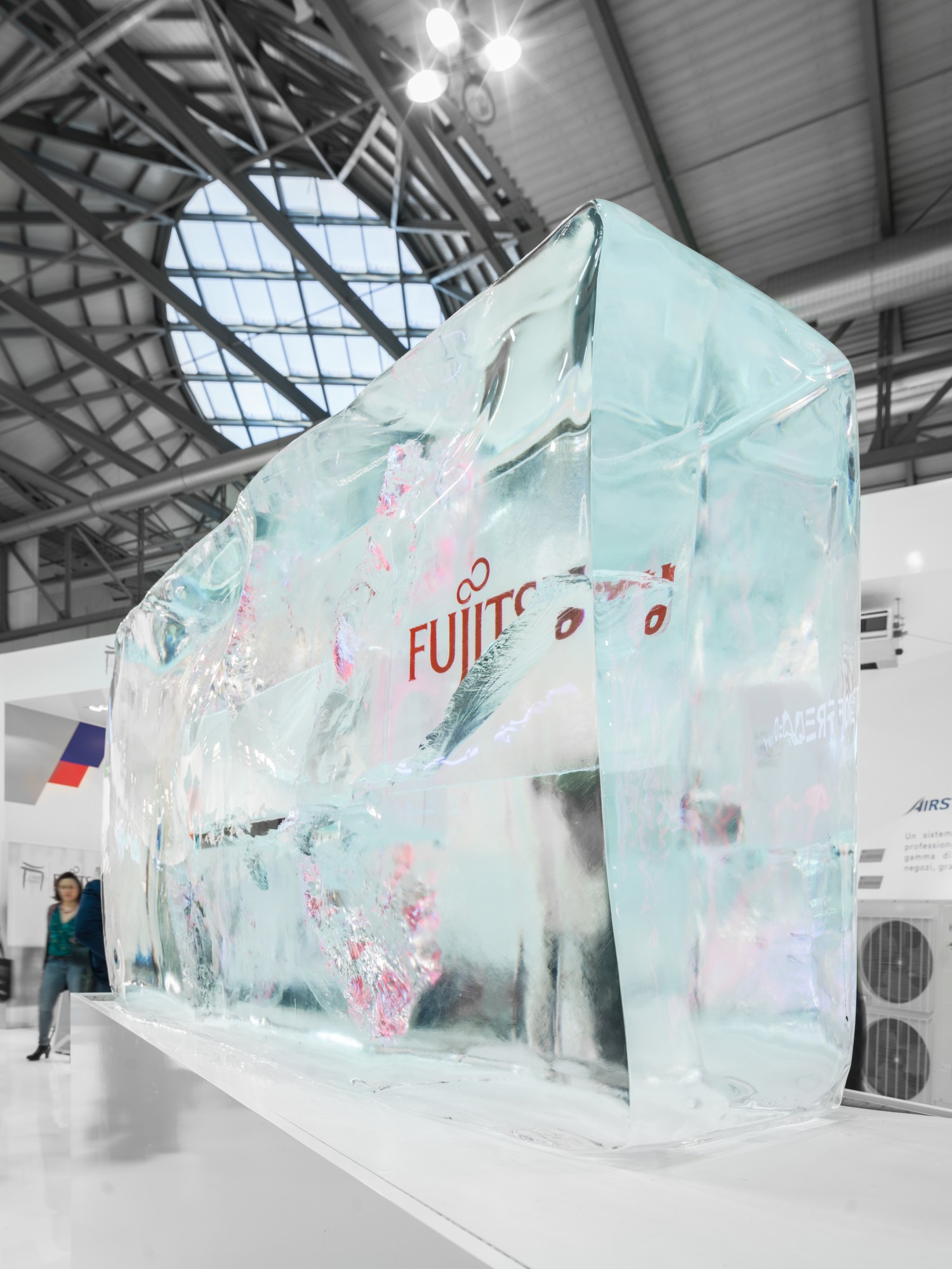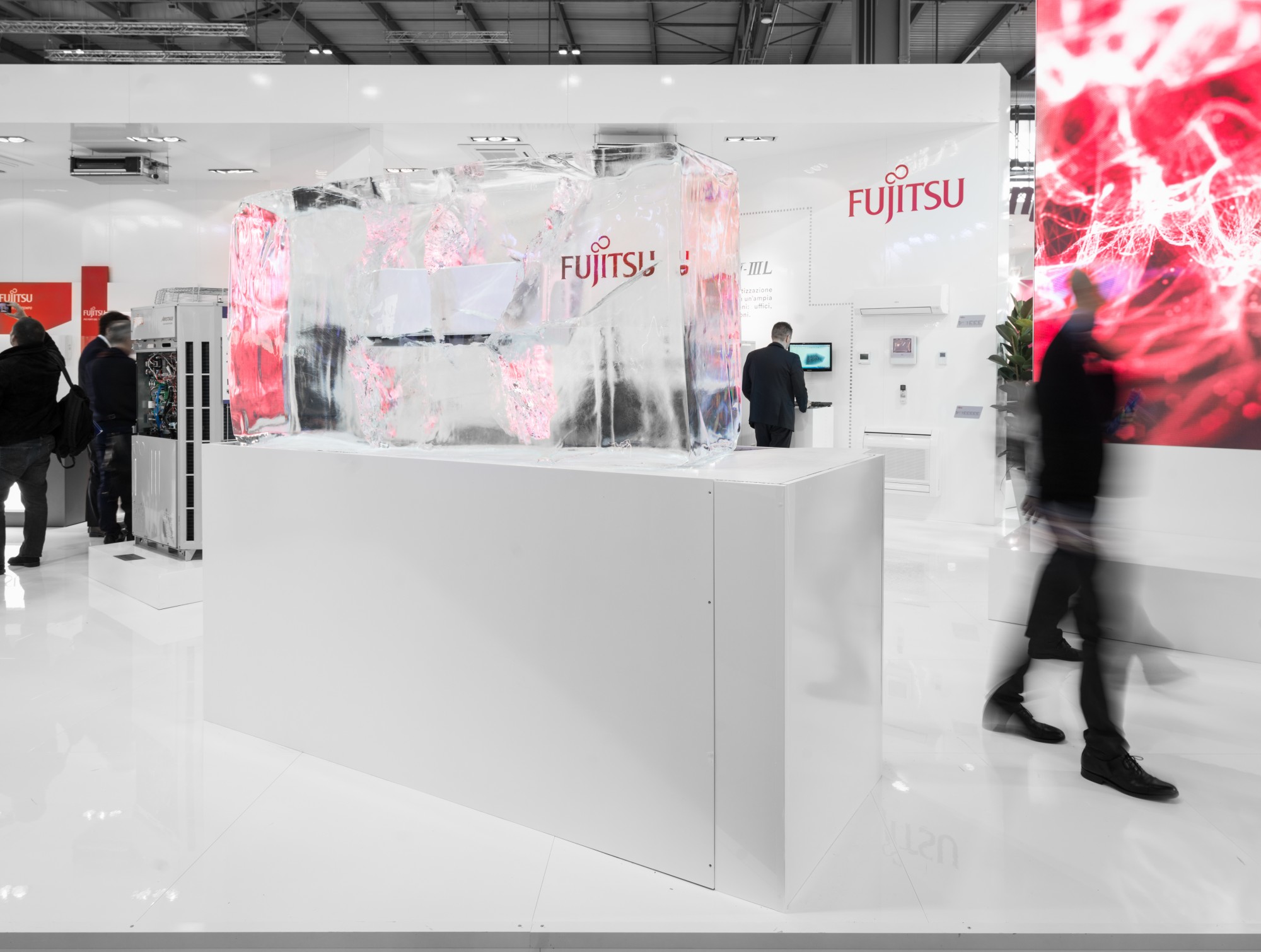 The great cold of Fujitsu. The stand: an experience to be lived. We froze a split inside a huge block of ice, a real installation and an attraction for visitors to the stand. For the exhibition of products, we used an arched semi-wall that divides the zone into two areas, a public one in front of the entrance, and one reserved for meetings and bar.