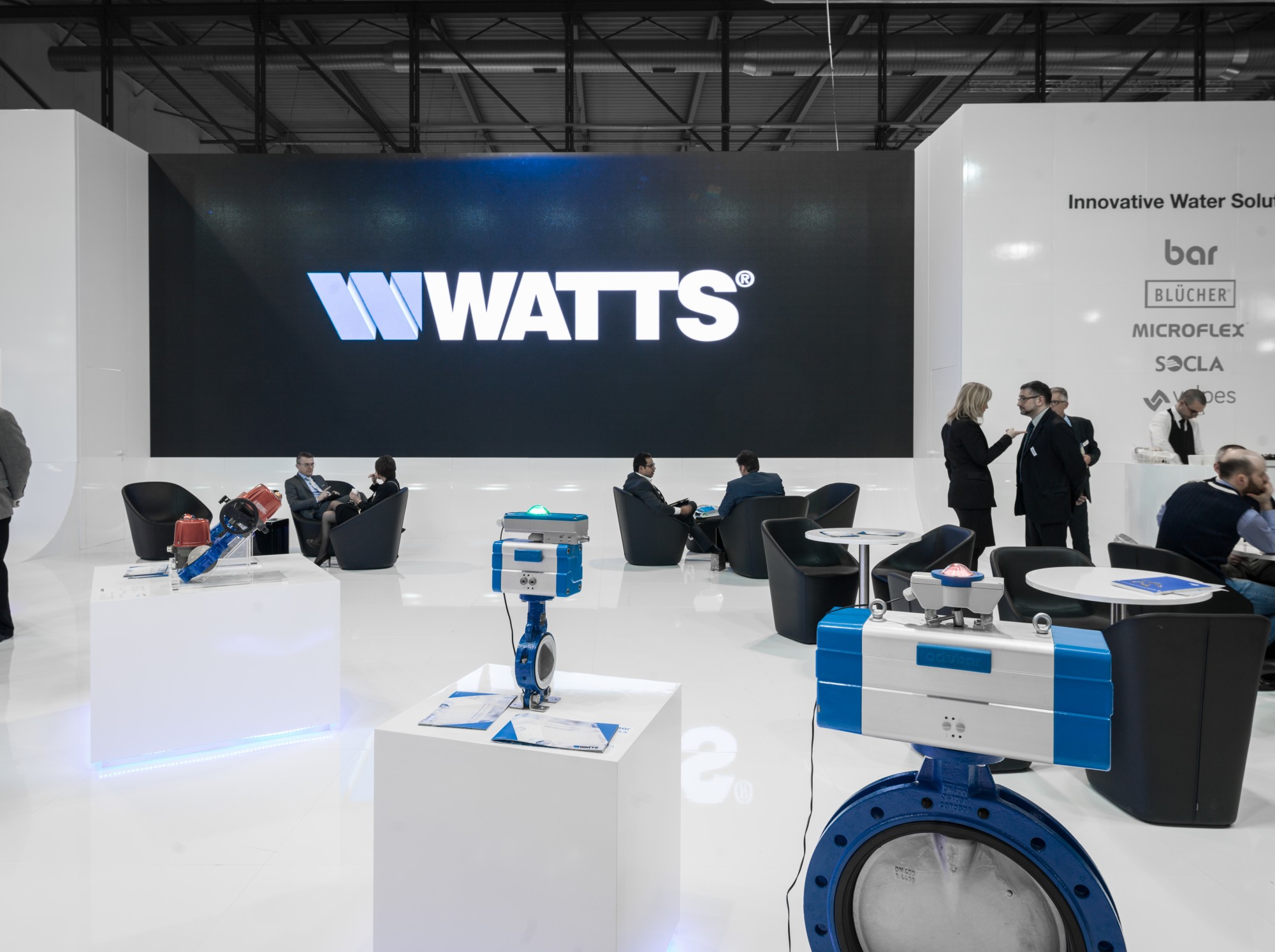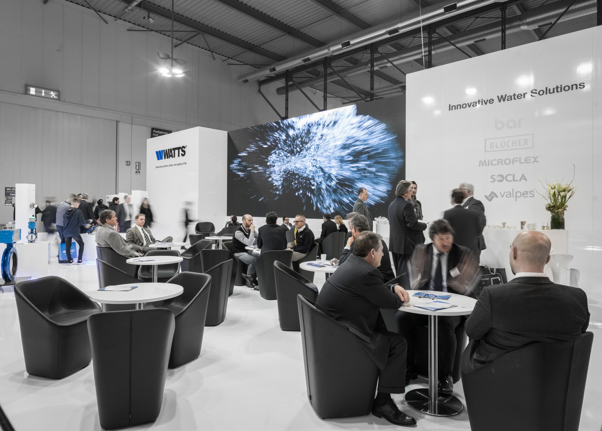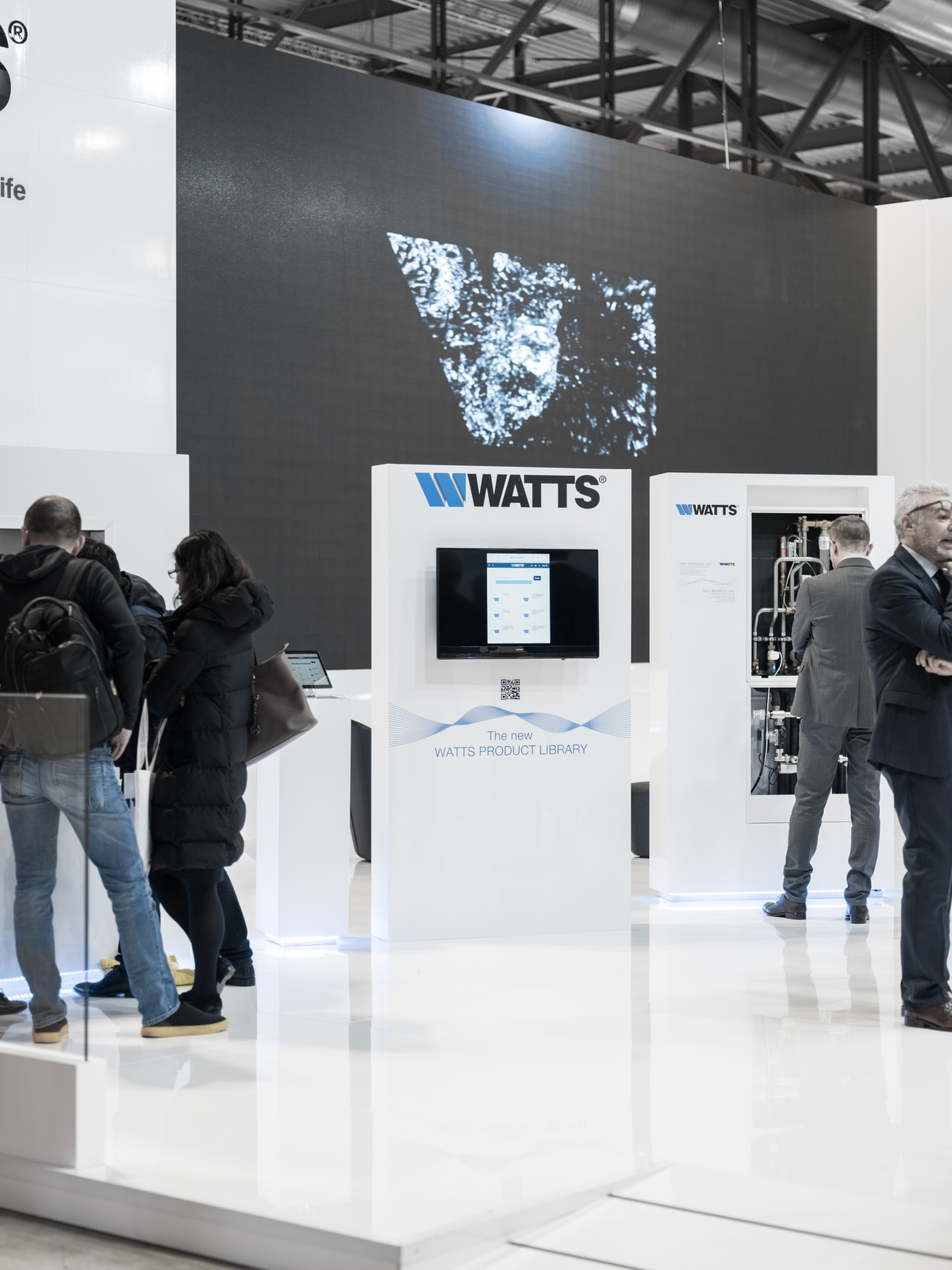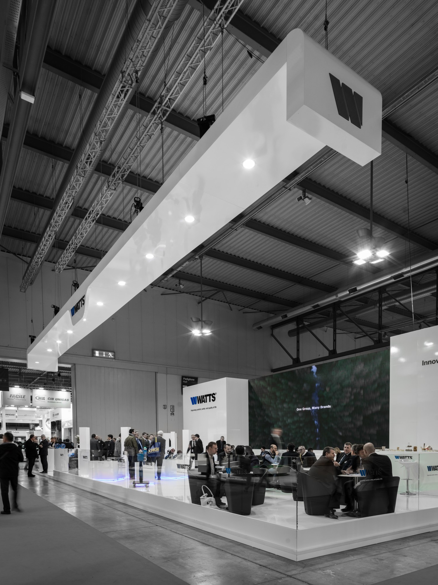 A large LED wall, at the centre of the booth, acts as a meeting point between the two containment bodies positioned at the ends of the exhibition space, whose bases rest on the platform creating an uninterrupted wave. We liked the idea of making a link between the fitting and the water element, our customer's core business.