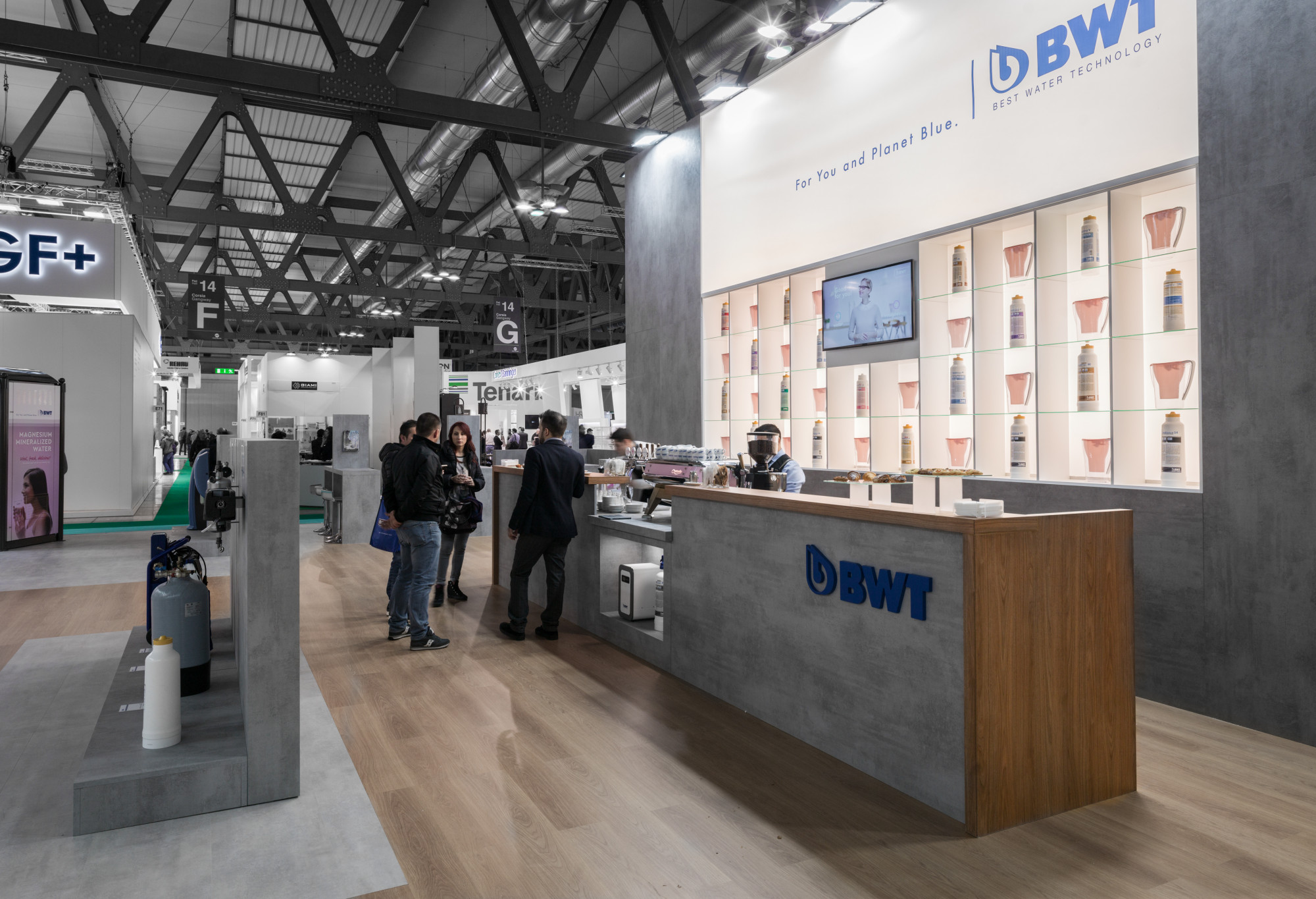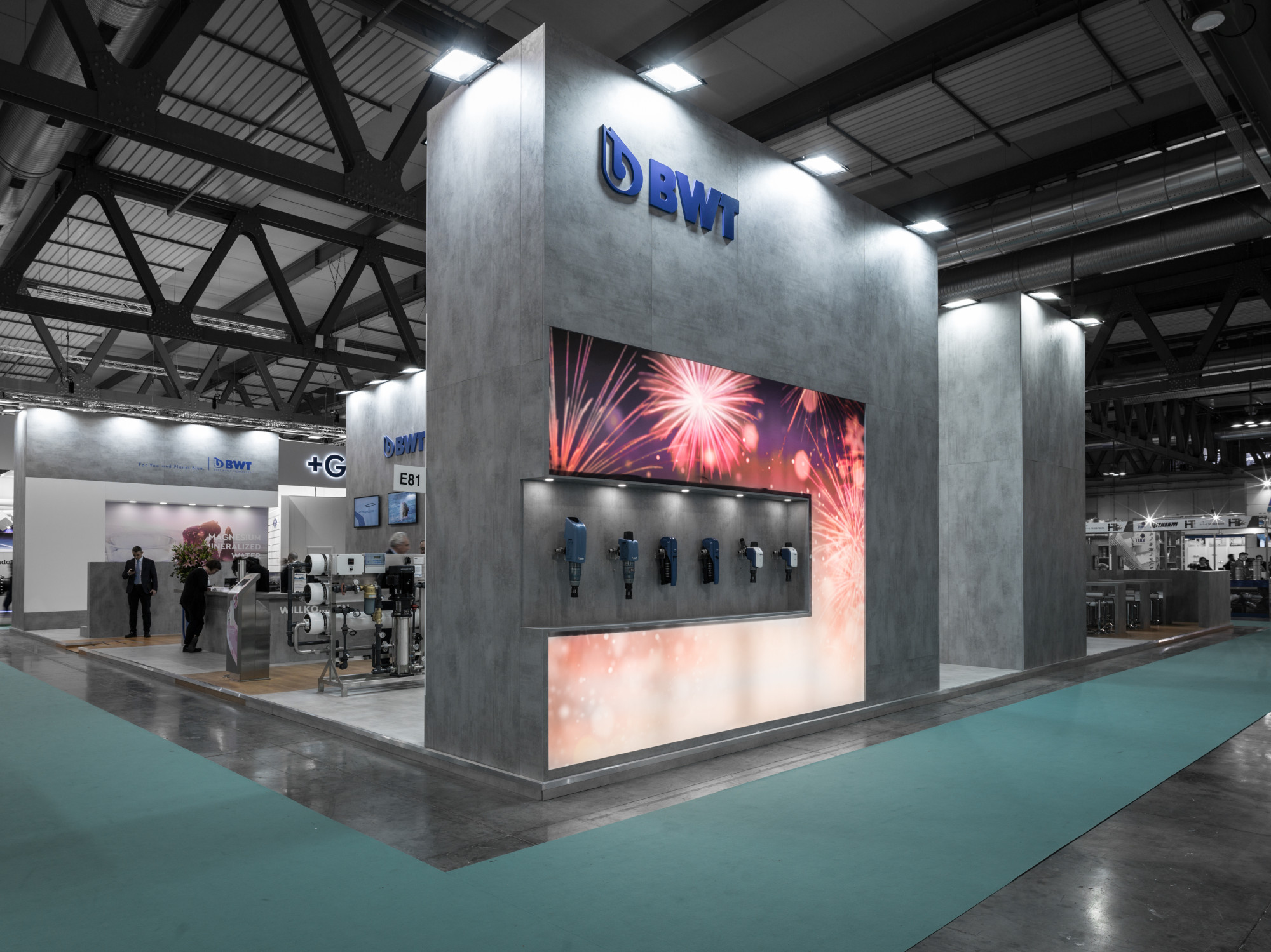 Large measurements and use of innovative materials. The alternation of colours and materials creates areas for different activities. The reception area, the training area, the meeting area, the show area and the space for displaying products. Monochromatic surfaces that are interrupted by the use of strong colours related to the different product lines and attributable to corporate communication. The installation was carried out as project submitted by our partner BWT.
