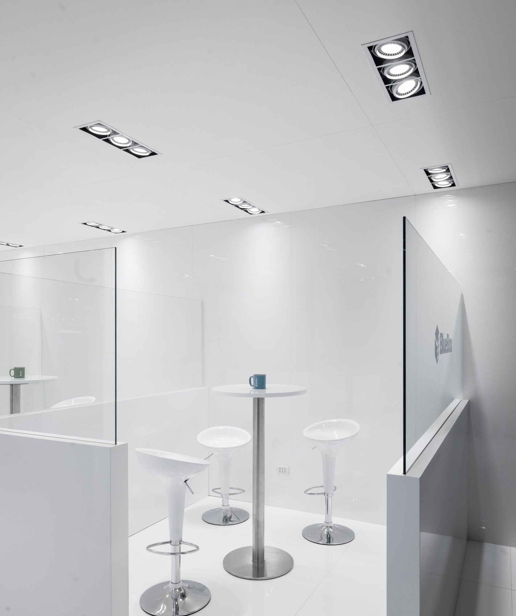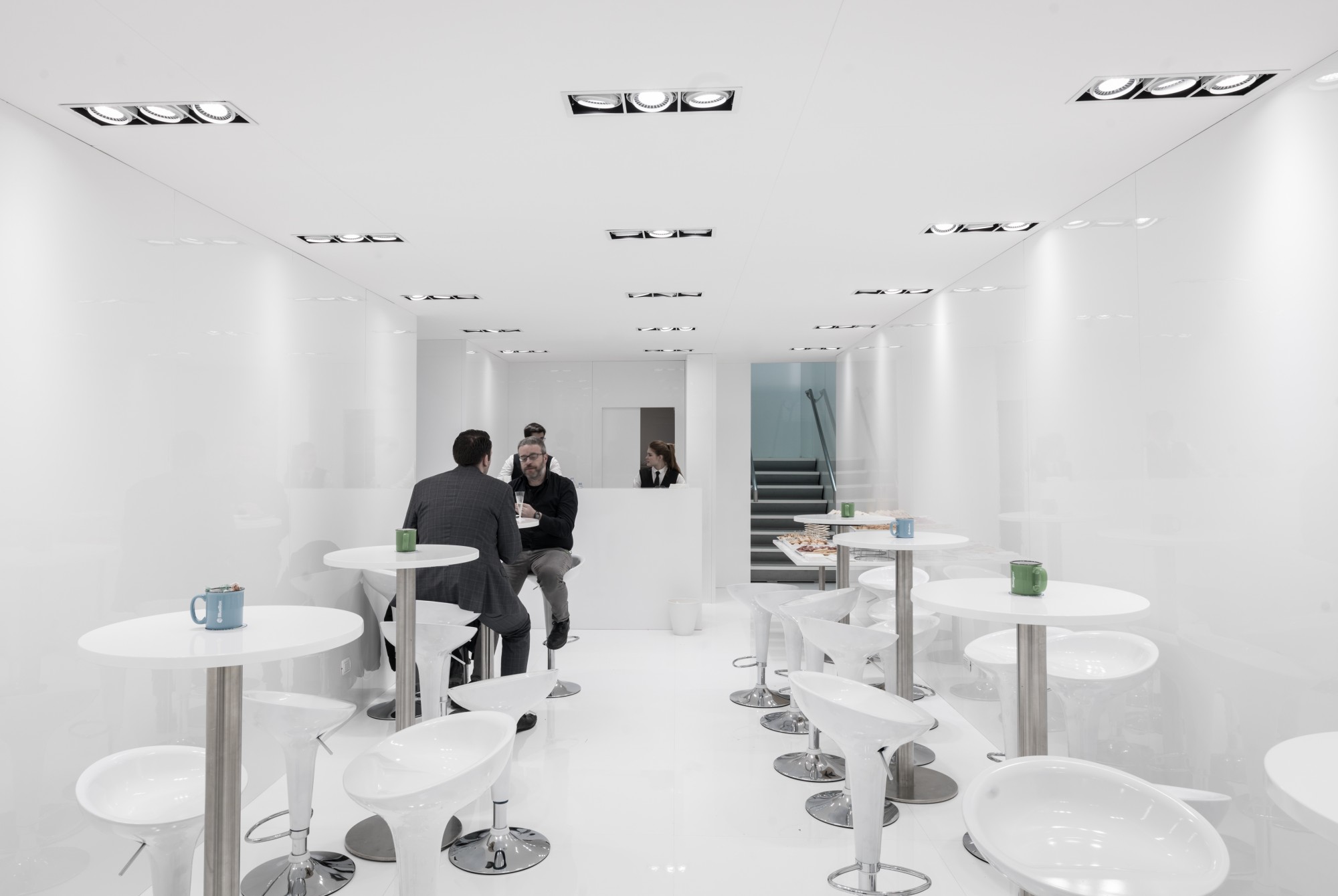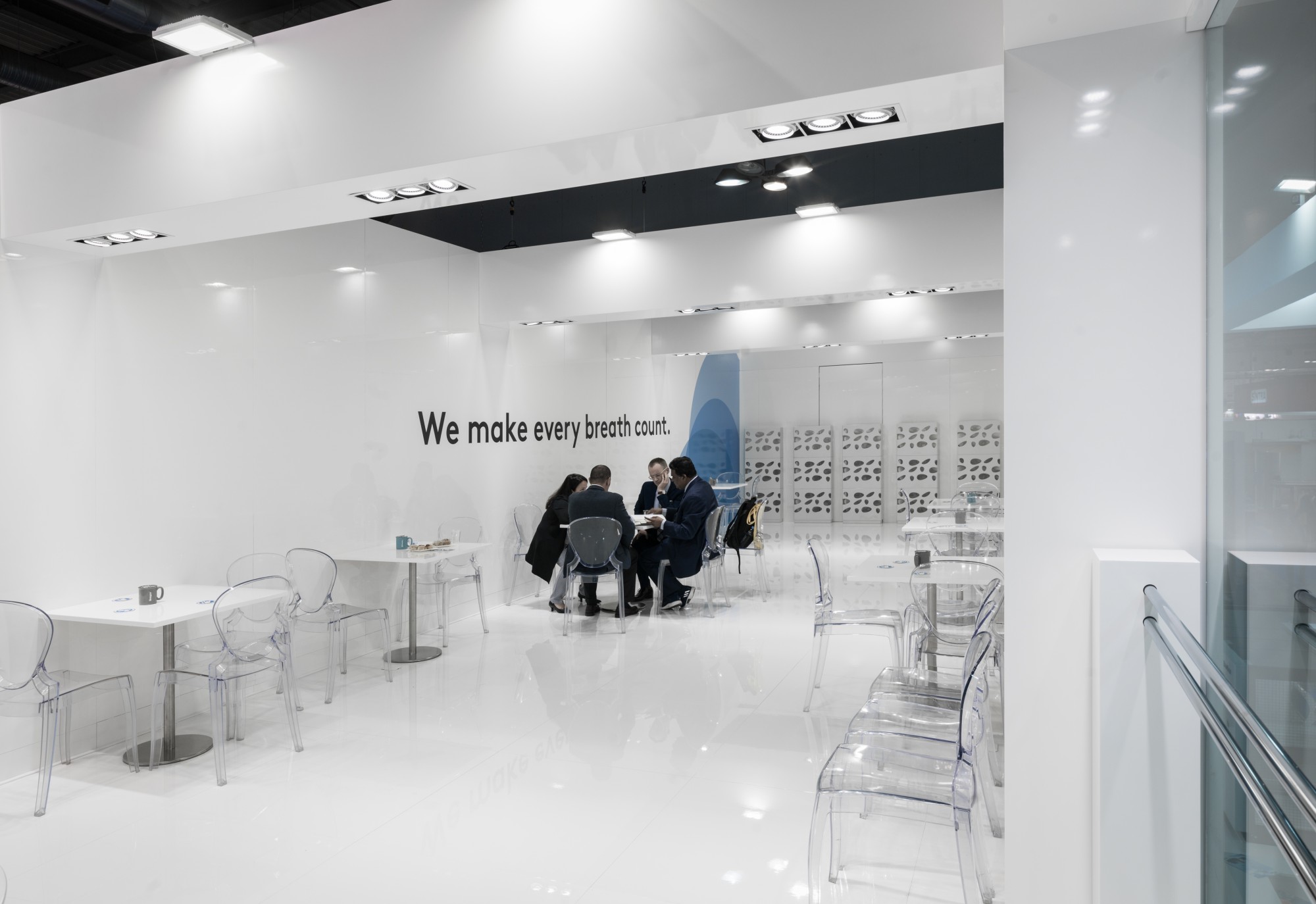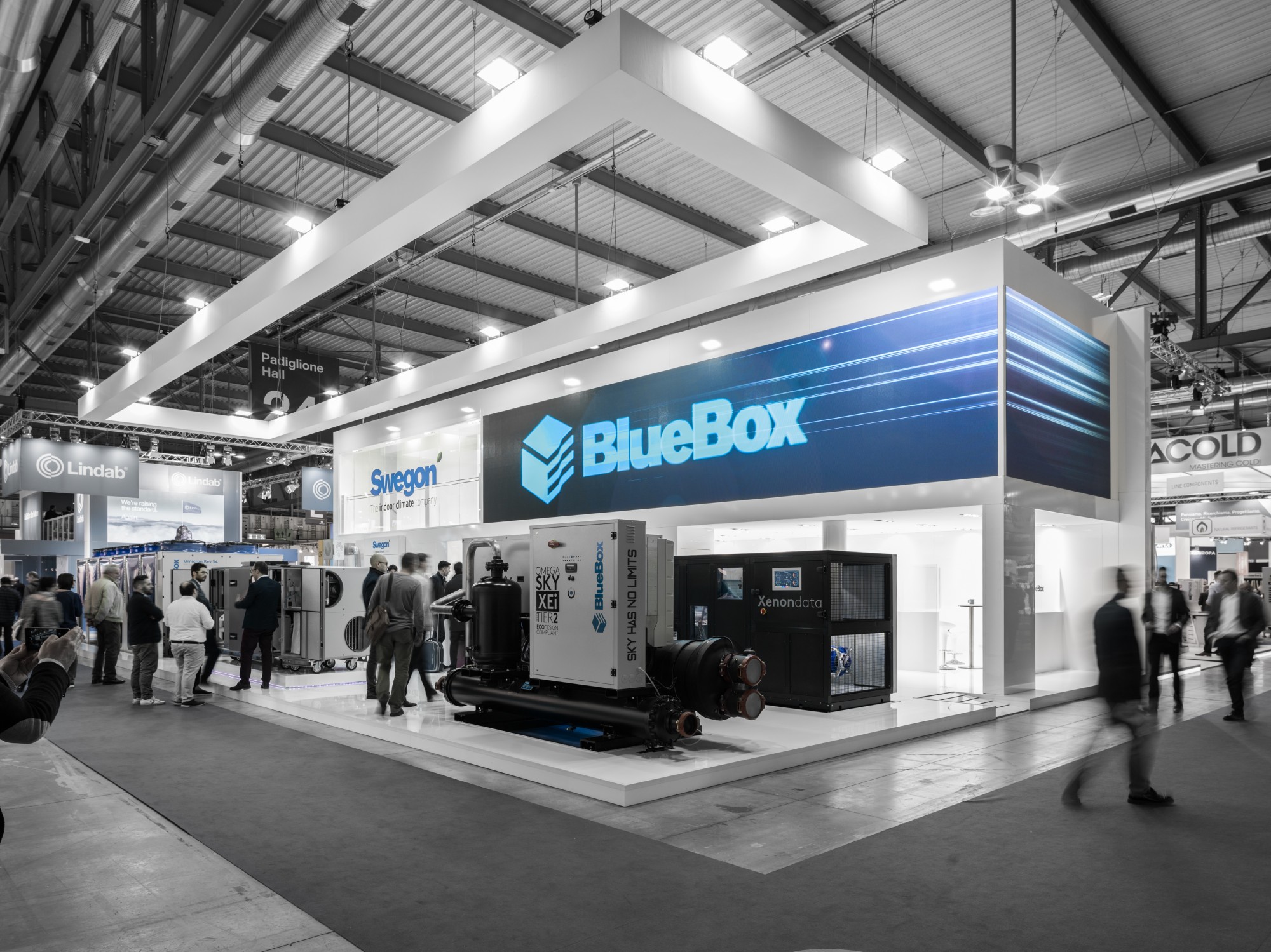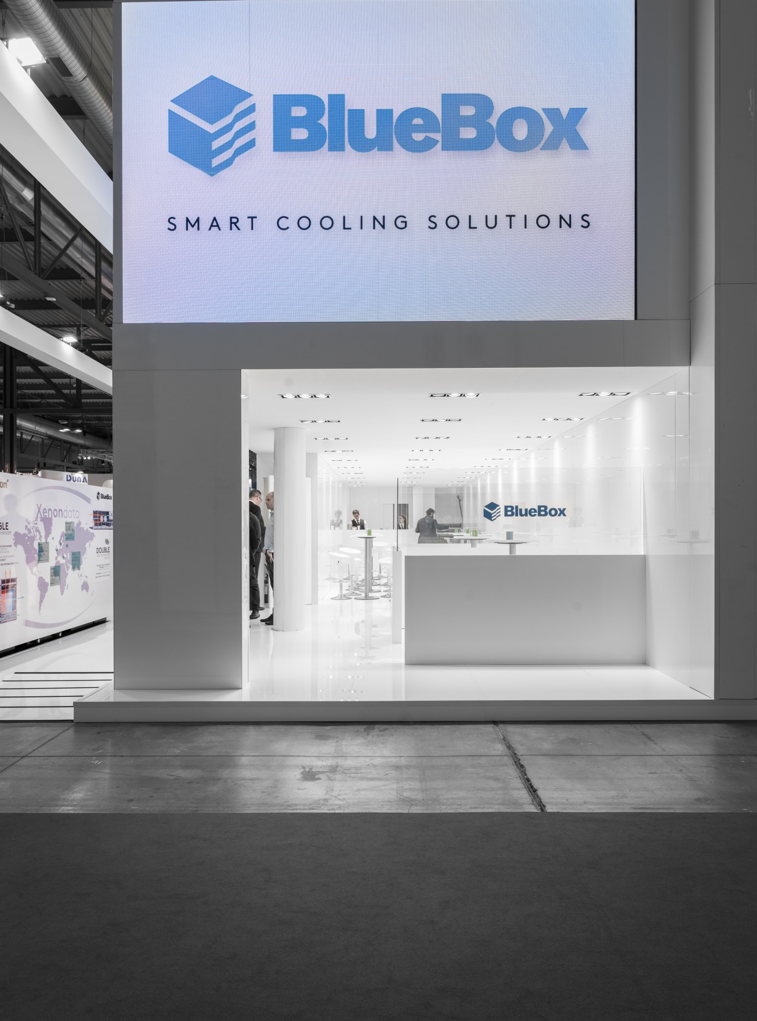 For our partner BlueBox, a mezzanine booth we designed. The primary need was to have an exclusive area, with controlled access, for customers visiting the booth. The upper floor houses an Open Bar area and a space for confidential negotiations, to be carried out in total privacy. The ground floor was conceived as an exhibition area for those machines that needed a lot of light, supplied by the large box that acts as a support to low consumption LED lights, giving majesty to the area. The large LED wall closes off the mezzanine without suffocating it, giving a sense of depth with the use of video images and brand animations. All graphic and video contents were created by us.