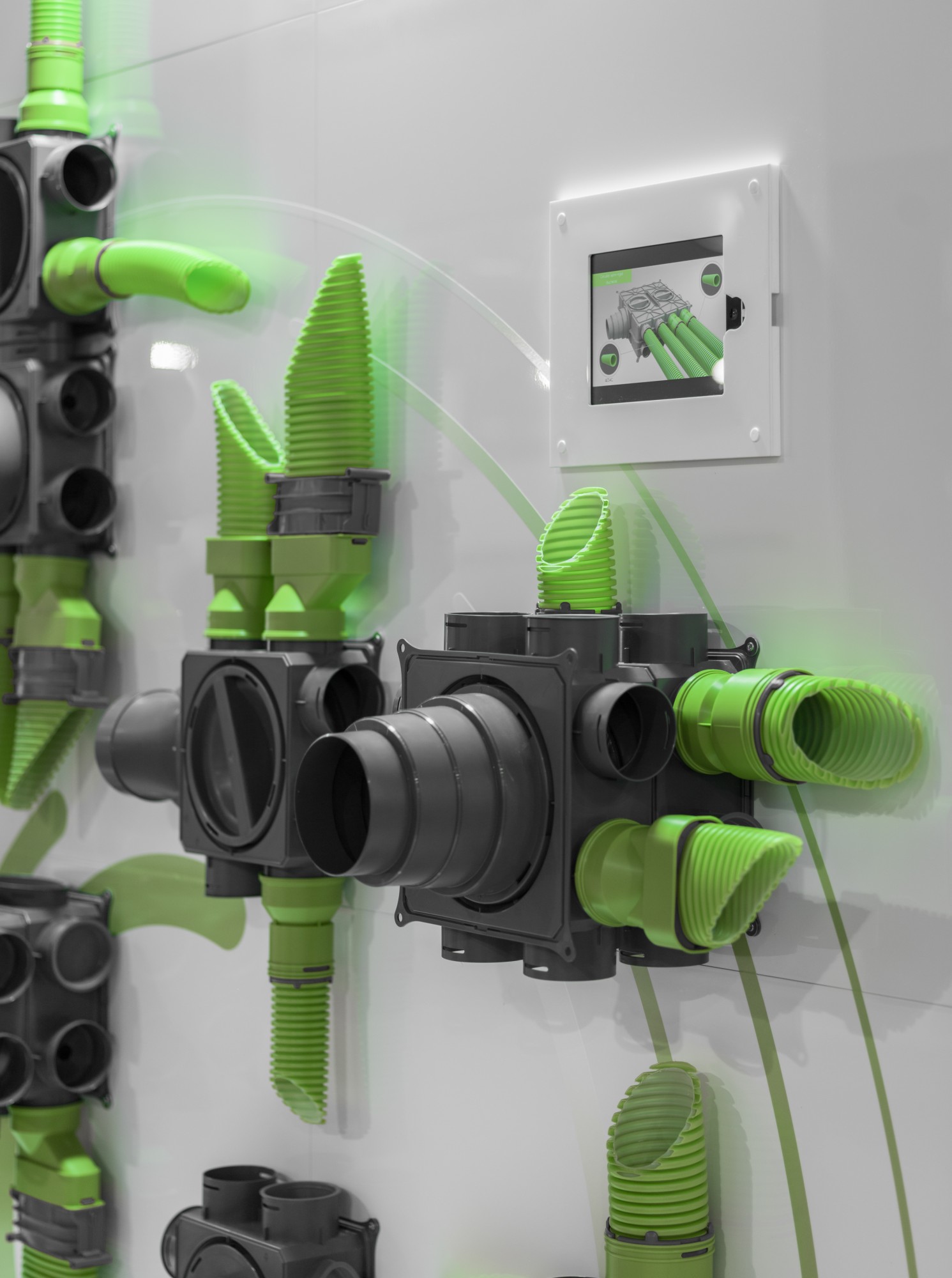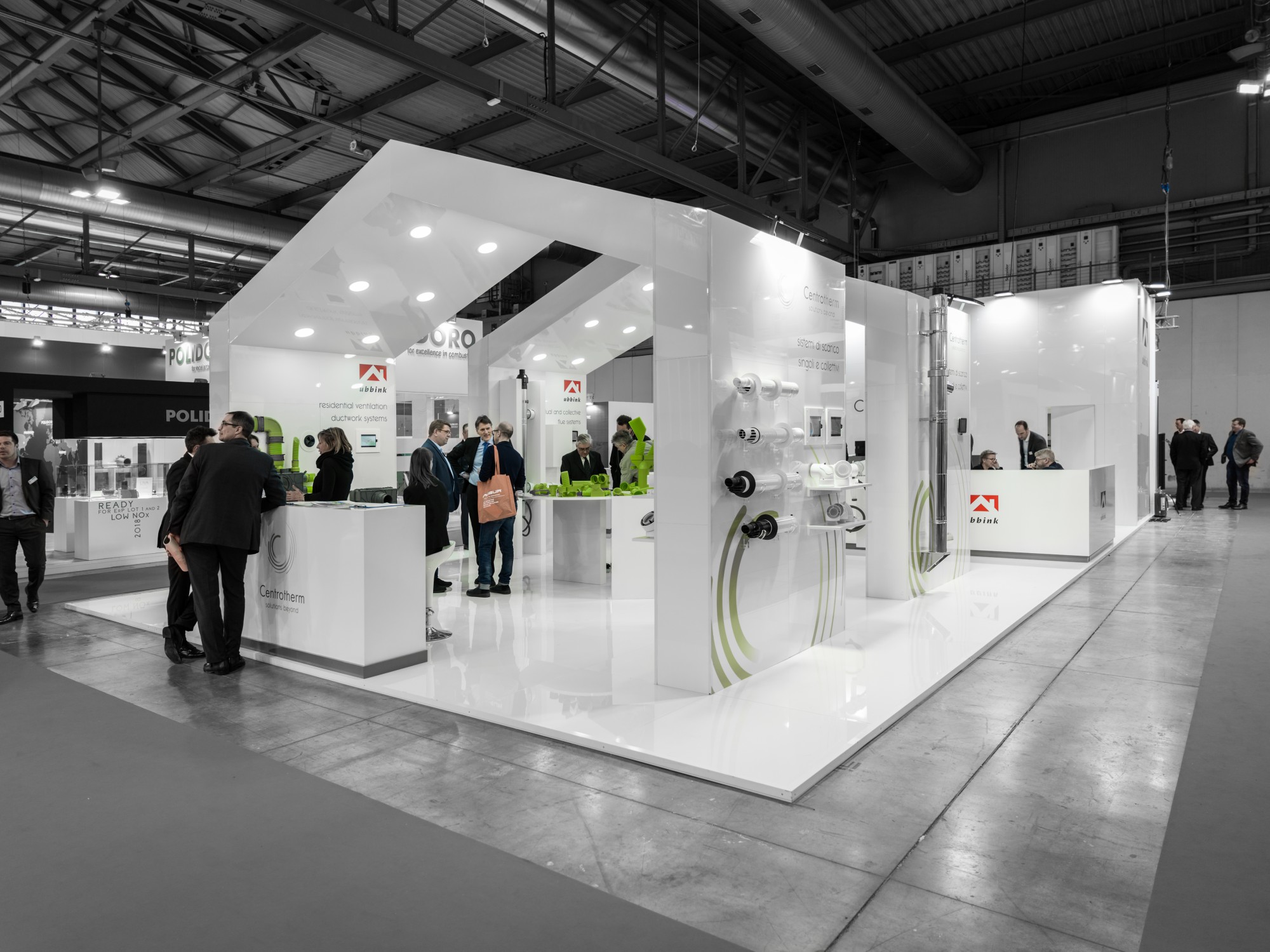 This exhibition space finds its genesis in the product. Choosing how to present your range is always complex and often you have to opt for a technical solution, sacrificing creativity. In this case, we have been able to combine at best these needs, designing a house, and positioning the plastic pipes intended for conveying fumes at strategic points, has allowed us to make visitors immediately understand the core business of our partner Centrotherm, with originality.