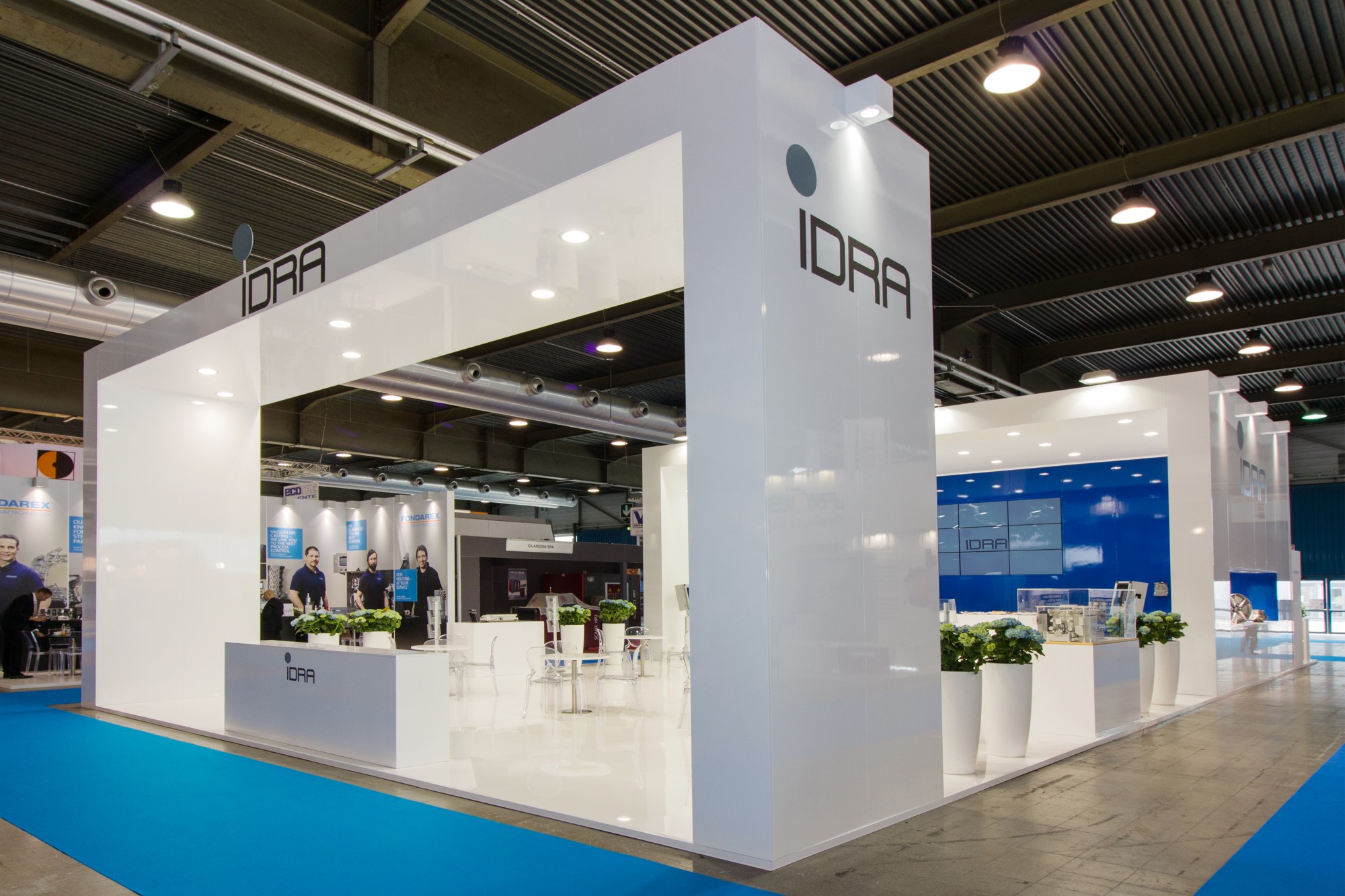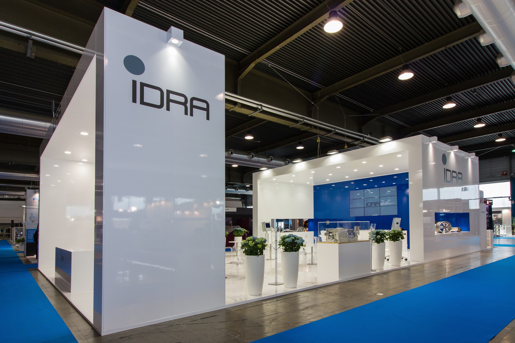An elegantly furnished medium-sized space, designed and planned without leaving anything to chance. The entrance becomes important thanks to the portal that filters the inflow of visitors. The central square is completely dedicated to commercial contact, while the product area is enclosed in a stand box that gives exclusivity and importance to the displayed goods. The first glance is important, it is difficult not to remember the brand.