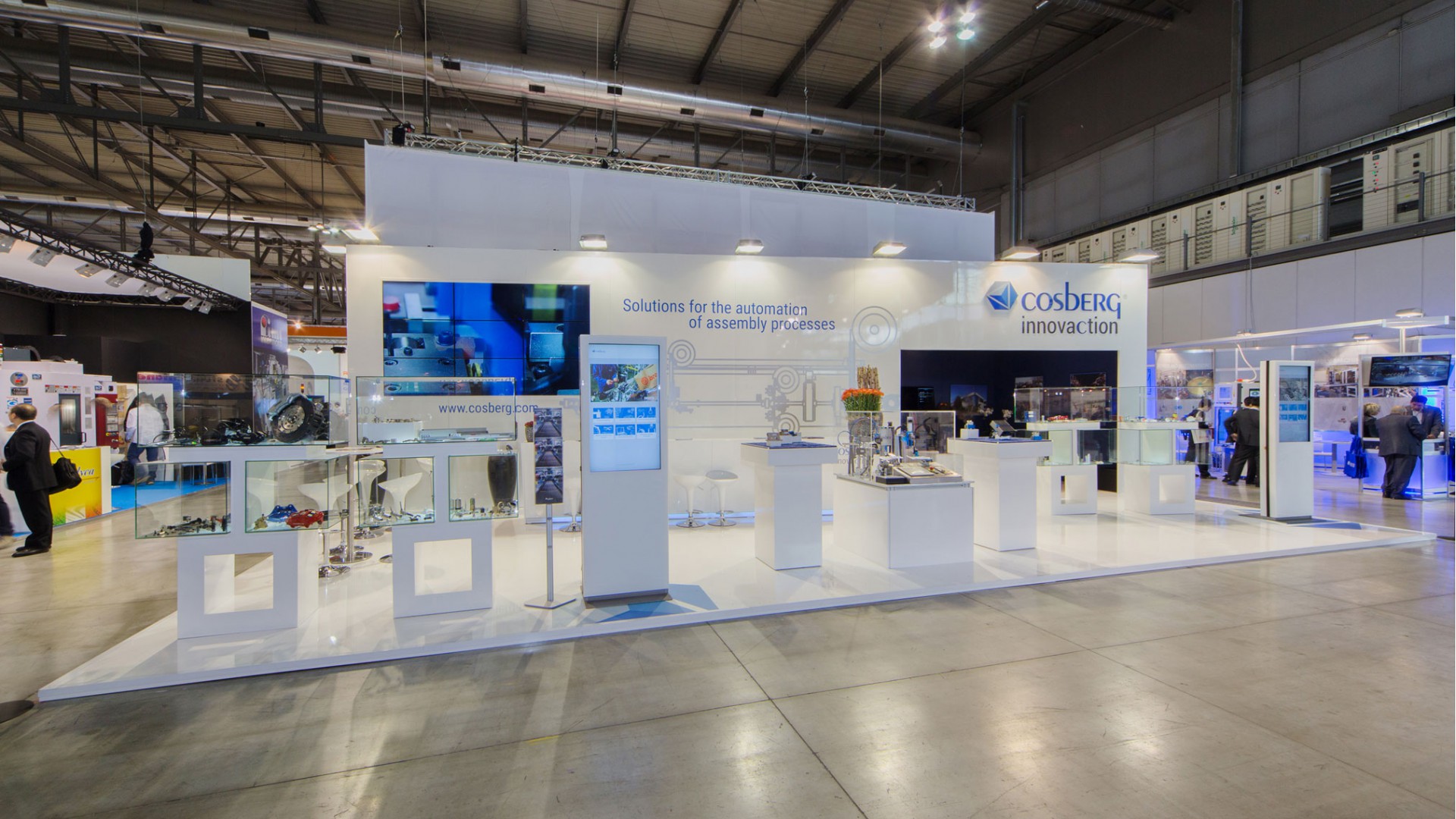 The display cases made of tempered glass allow to see products at 360 degrees. The booth is completed by totem touch in which we developed the navigation interface to show the catalogues, videos and details of the customer's machines. The presence of video wall strenghtens the digital corporate image.