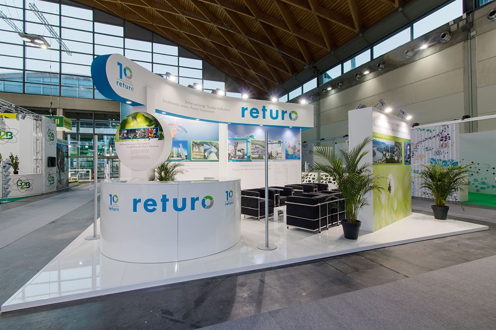 The soft architecture, given by the presence of curves in the various exhibition details, is the main feature of this booth. The graphic walls are used both to communicate the various corporate messages, and to create a reserved area for discussing with visitors.