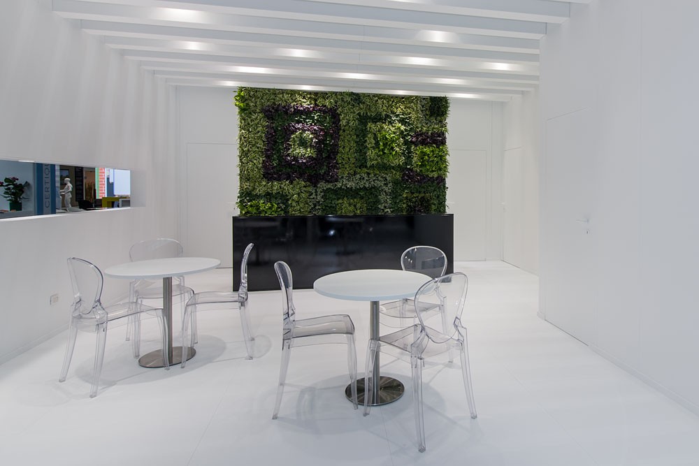 Purity, essentiality and design are the foundations of this project. The trade fair, related to the environment and renewable energy, pushed us to propose a space consistent with the intrinsic values of our customer's corporate mission. The furnishing elements are iconic objects of Italian design. A LED wall to entertain visitors.