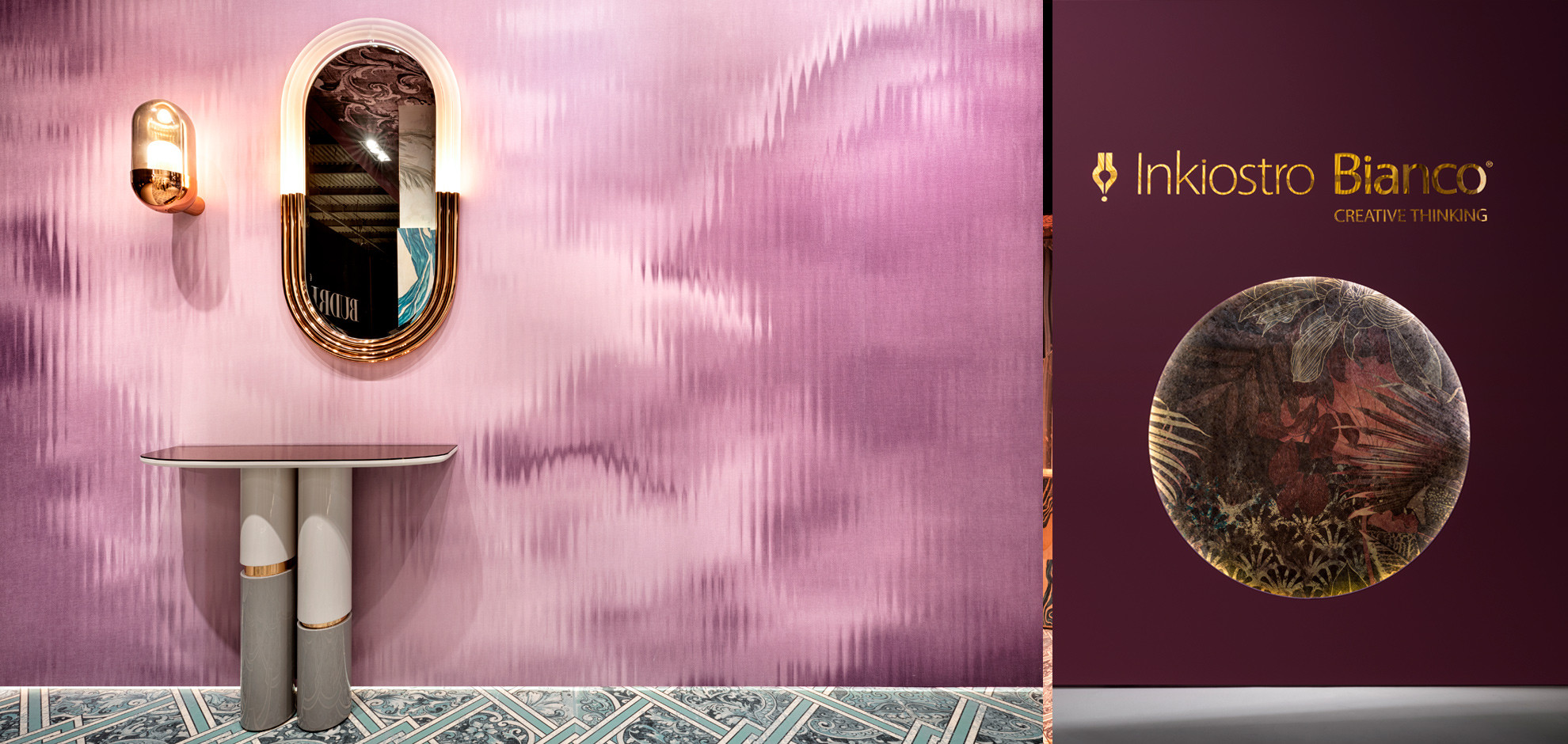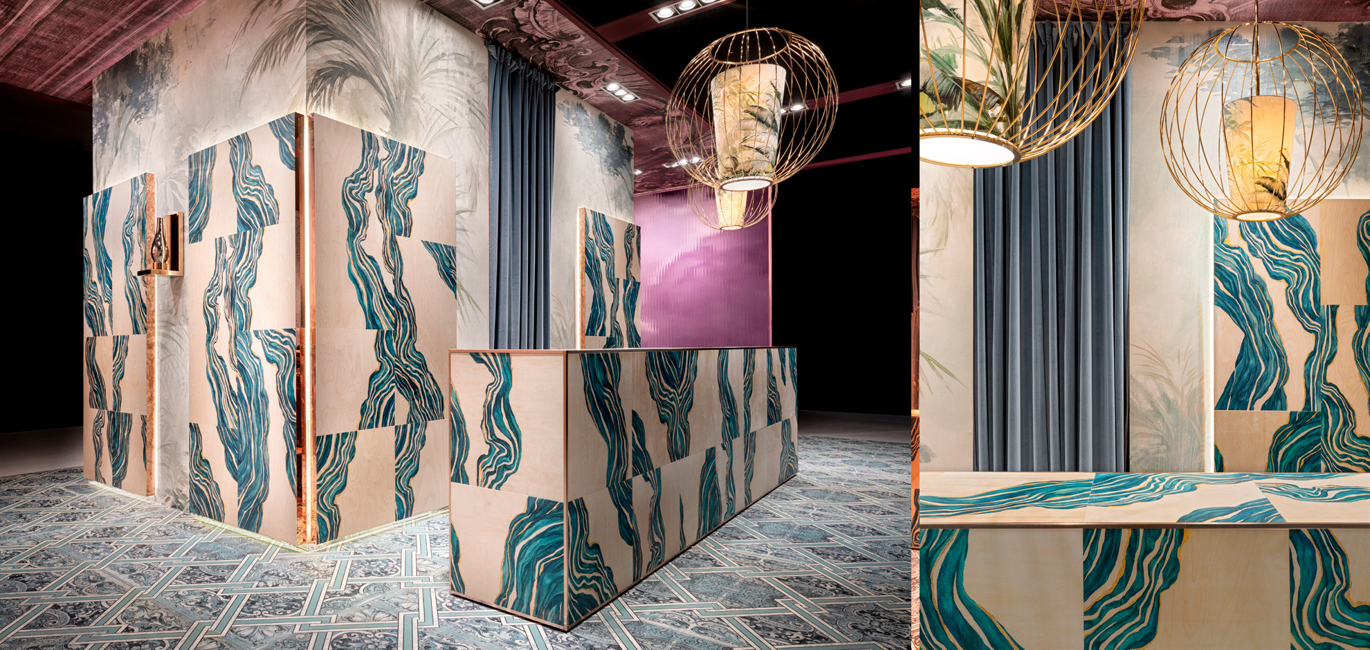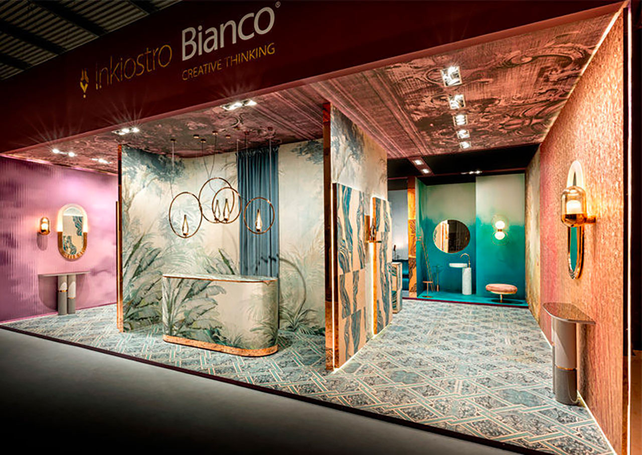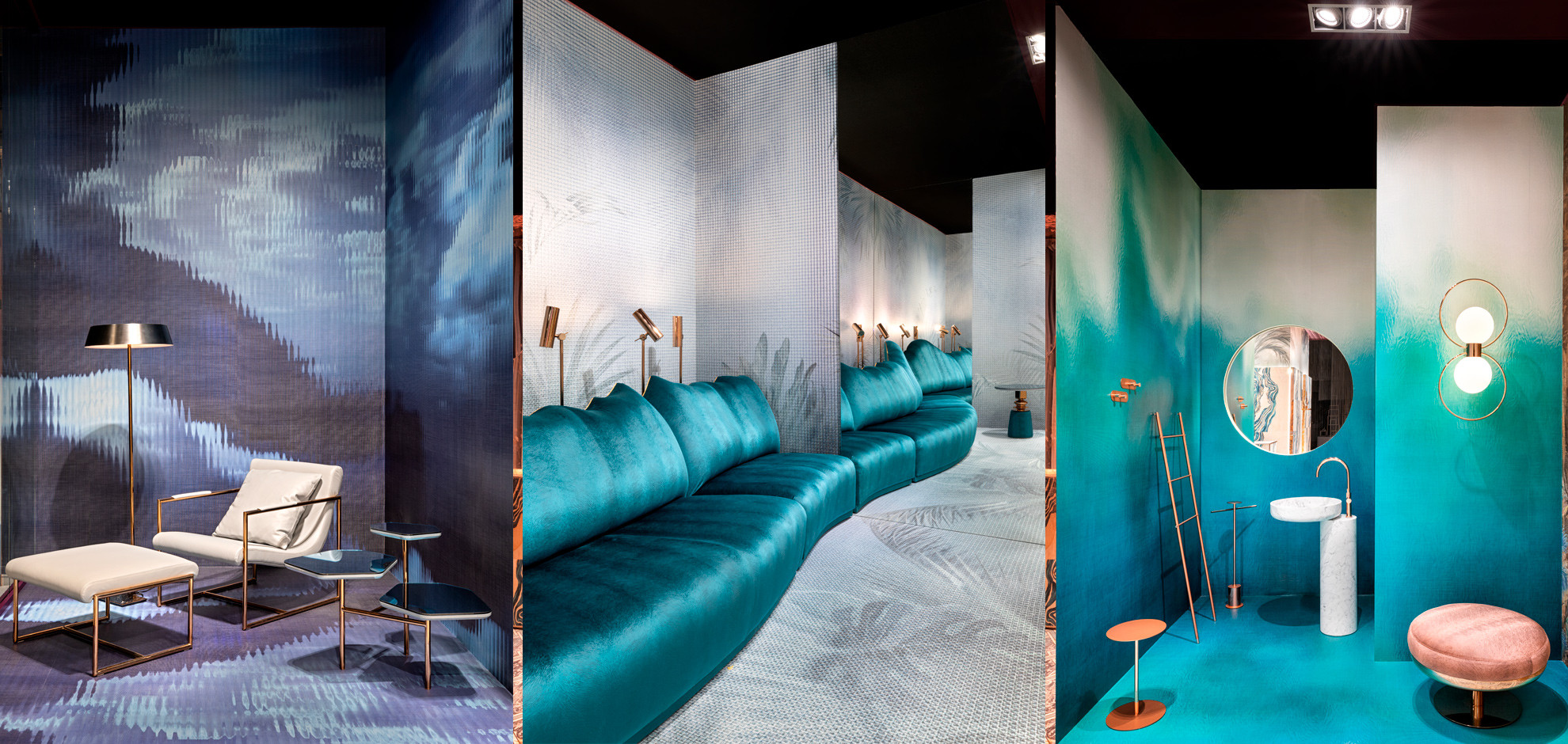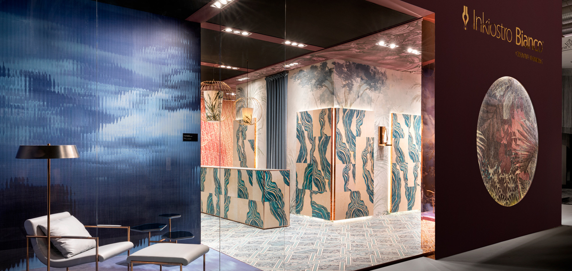 Different environments have been recreated within the booth to allow the visitor to immerse himself into the design and the refinement which characterize the brand. From our customer's need to give to each environment its own style, we managed to create a welcoming and cozy space, by conveying a sense of uniformity and harmony among the surfaces, made possible thanks to the design wallpaper of our customer. As well as the surfaces, the furniture is the result of a careful research and selection of components consistent with the different living environments.