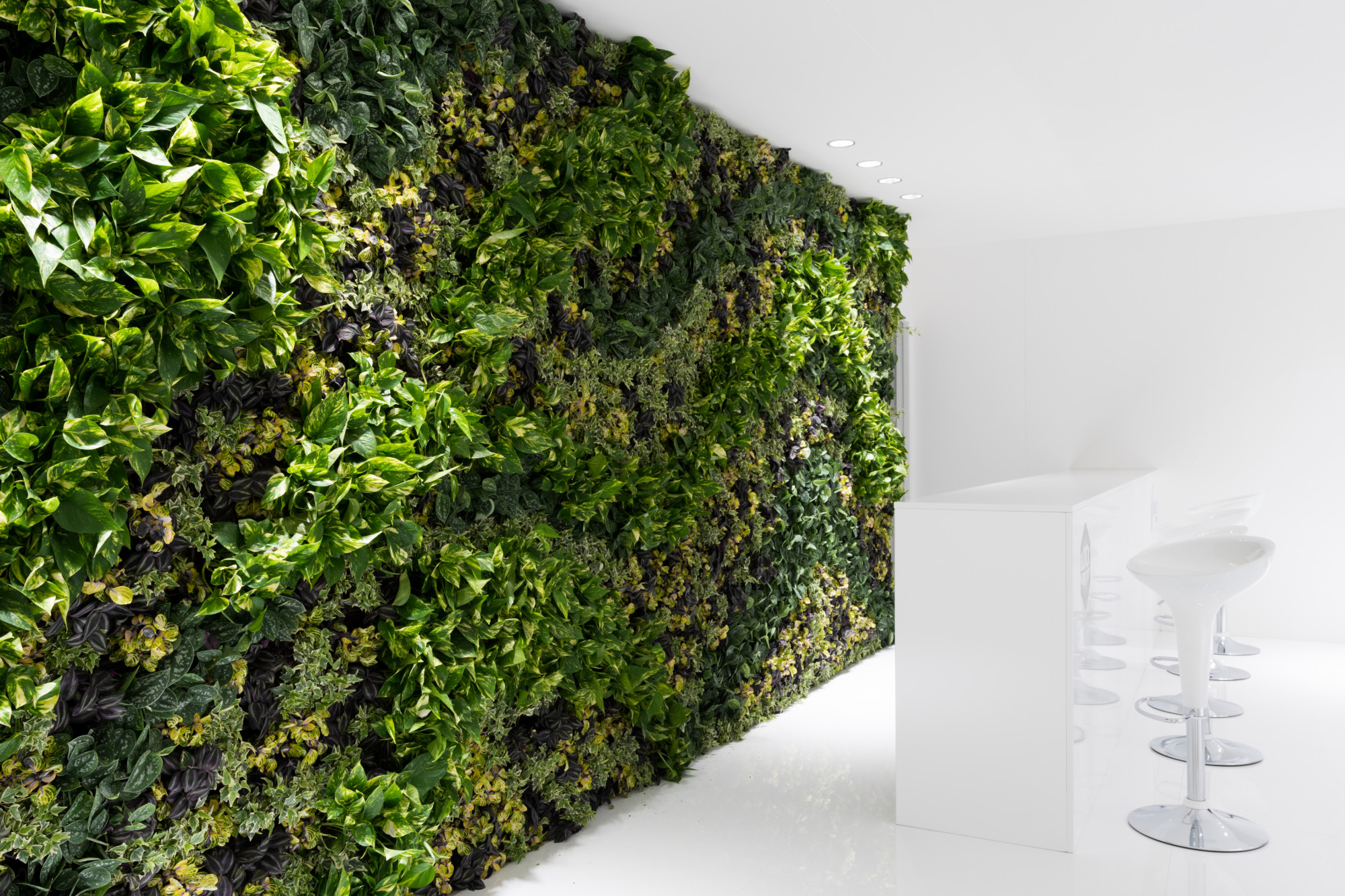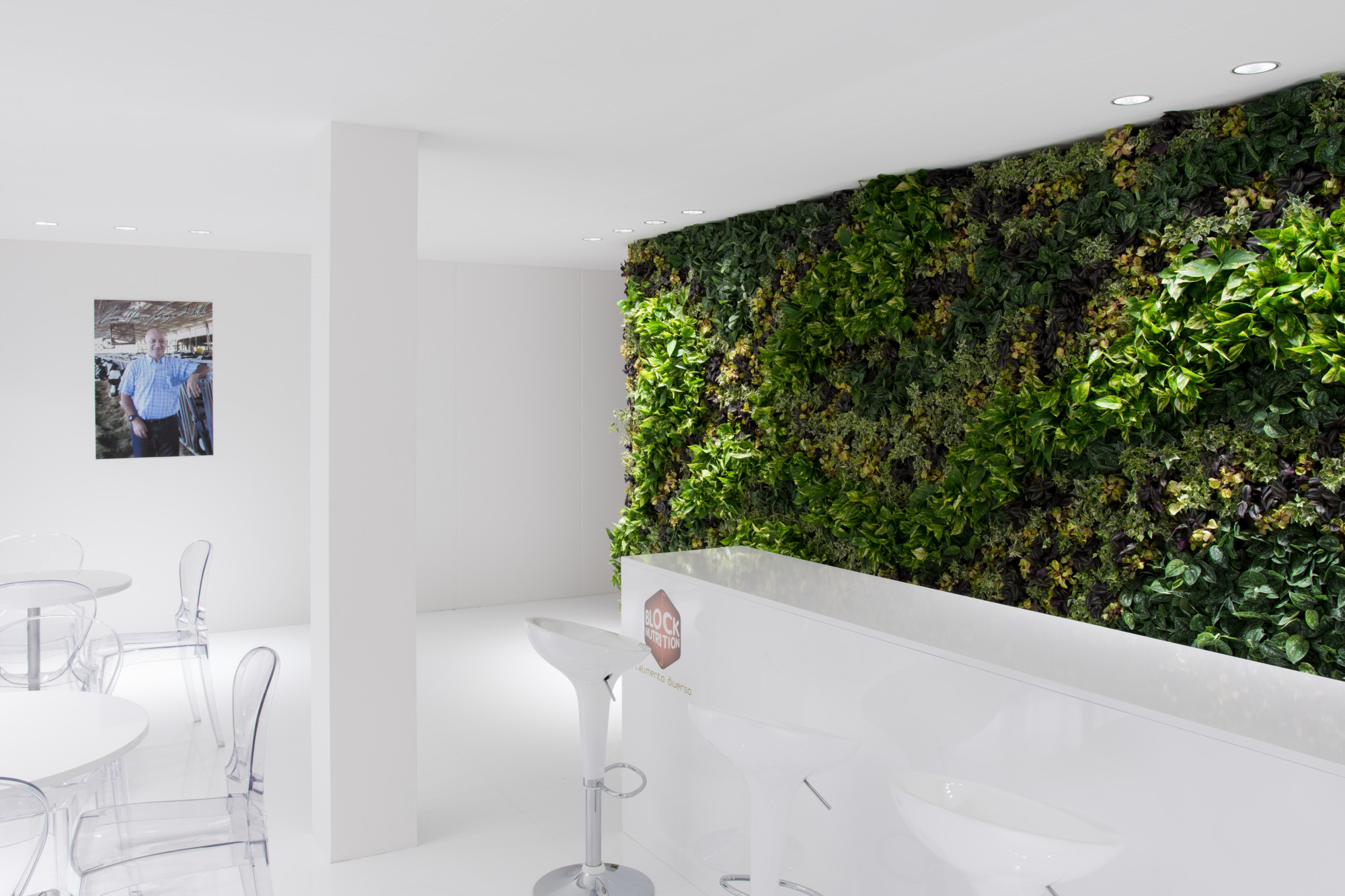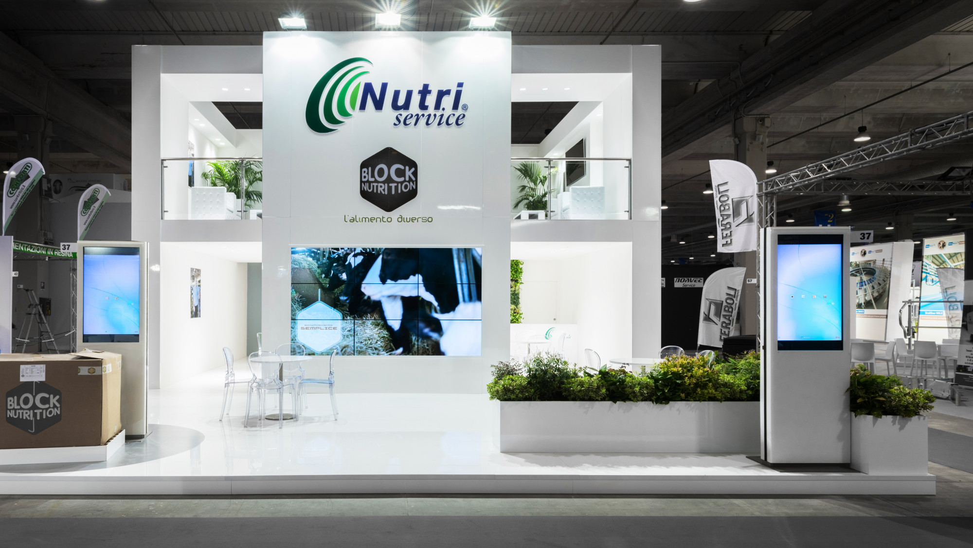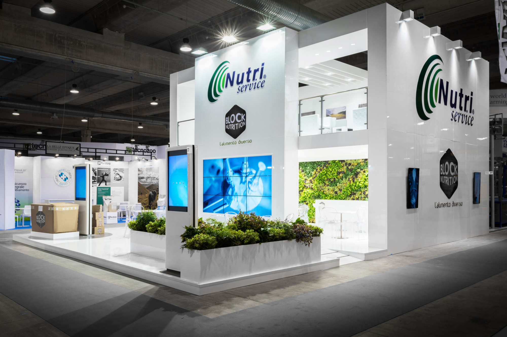 We created a stand with a large mezzanine used as reception area. The contrast between the illuminated optical white and the vertical green installation with the lower pots conveys a sense of harmony and elegance, and at the same time an innovative and "green" tone. The two totems and the central video wall, in contrast to the traditionality of the remaining spaces, interact and engage the visitor.