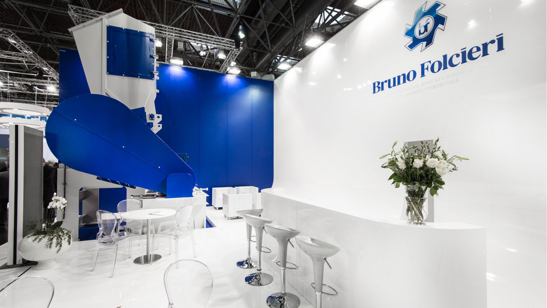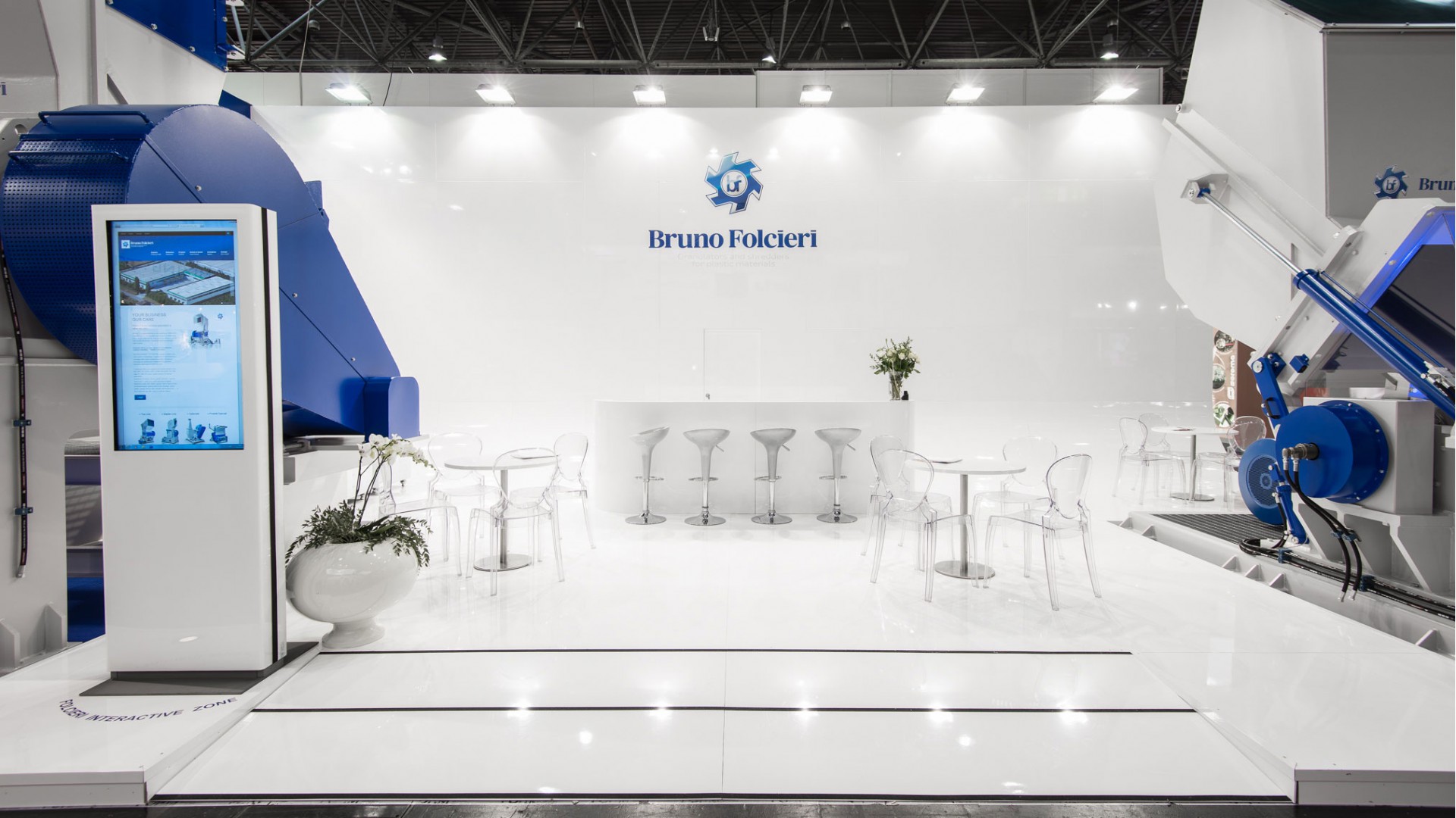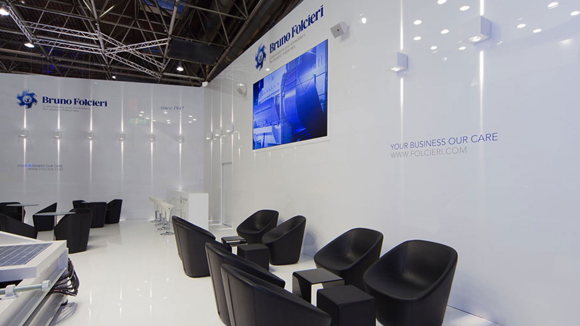 Simple and essential lines. Unusual architectonic lighting which transforms the exhibition area into a minimal and elegant booth. Highly-comfortable design furniture and suspended ceilings.
