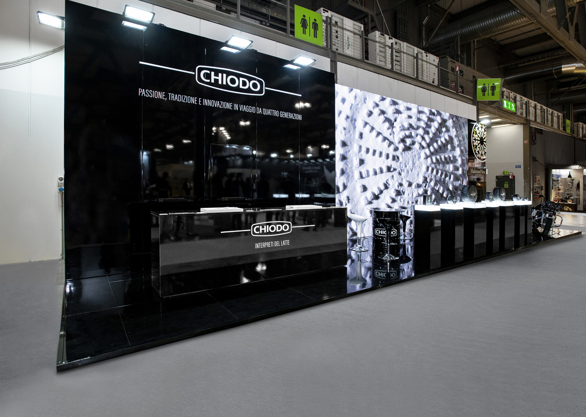 An enclosed but impactful environment thanks to the great LED wall installed at full-height. The strong consistency and harmony between tradition and passion characterizes this booth, which, also in this edition, wanted to combine passion for engines and company's tradition. Black is the privailing color in each detail of the booth: walls, lacquered floors, exhibition spaces, reception and table created with an old petrol can consistent with the passion for the engines.