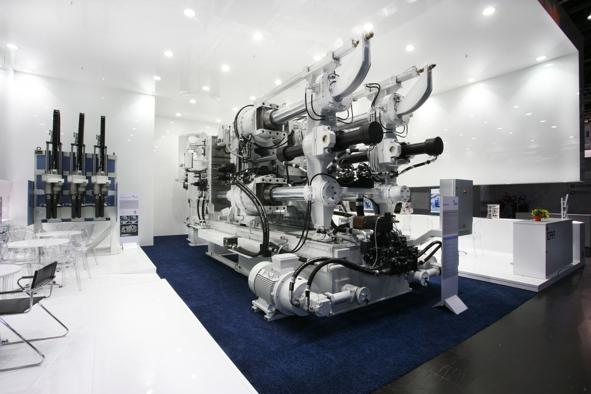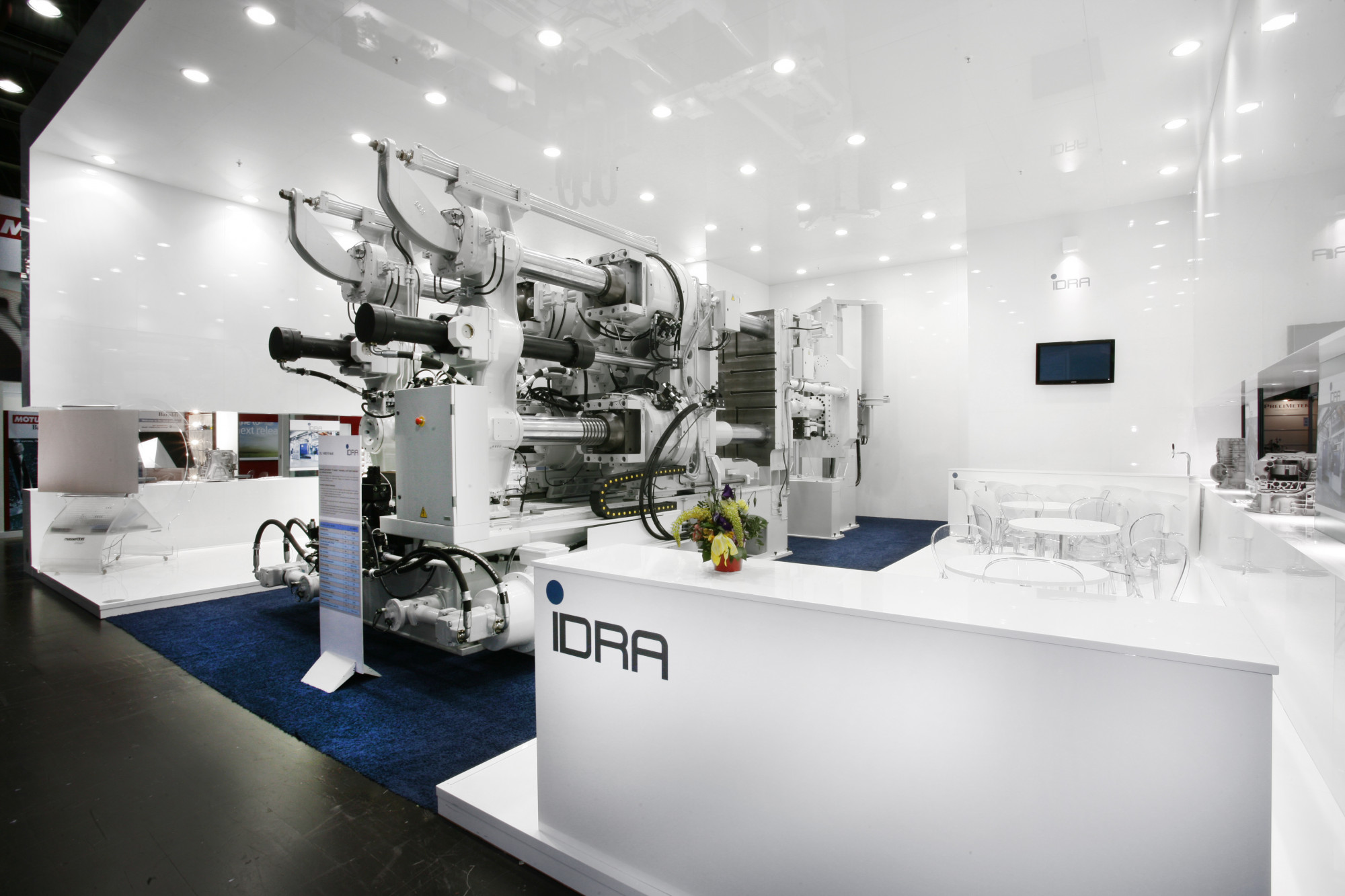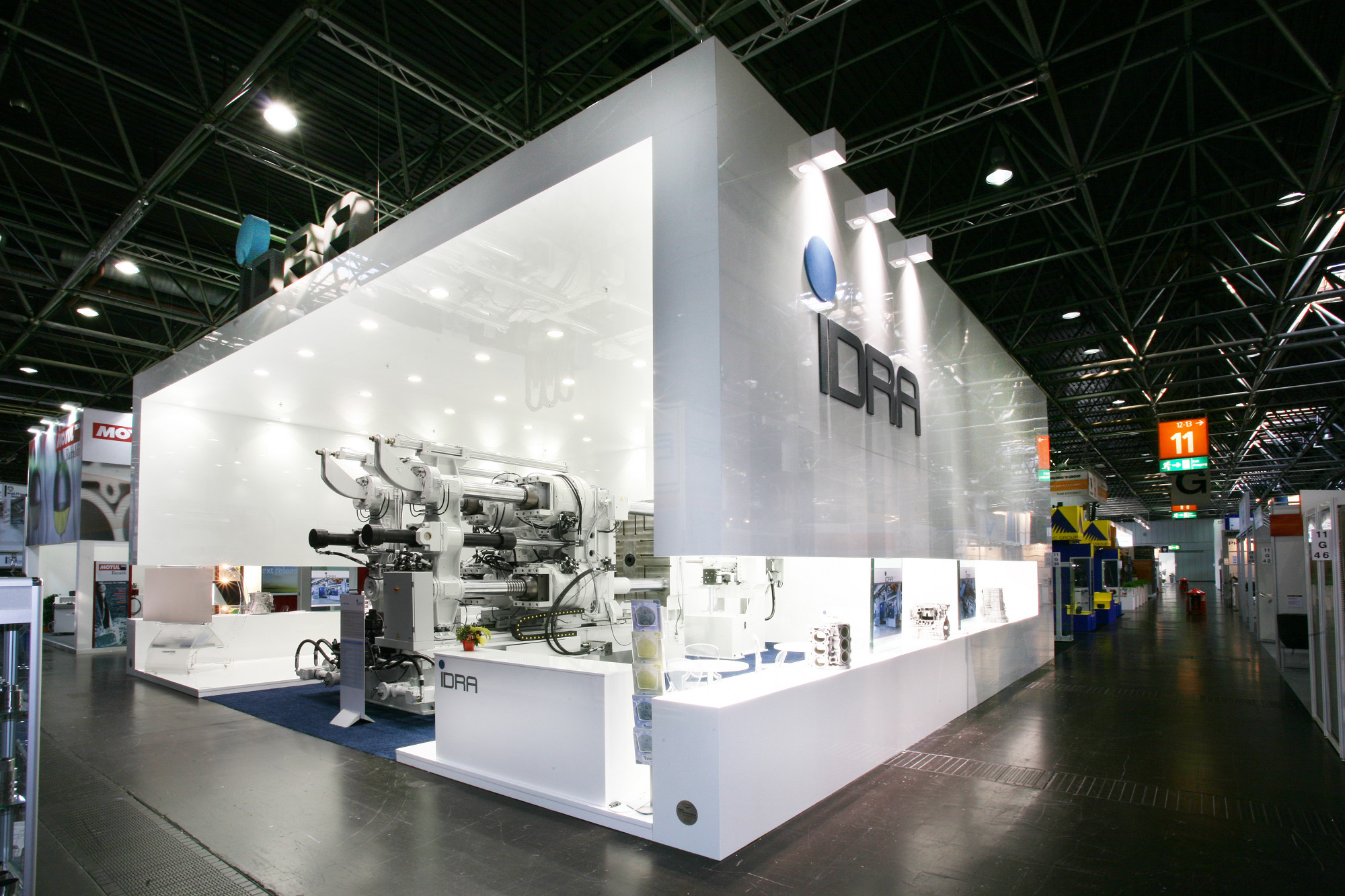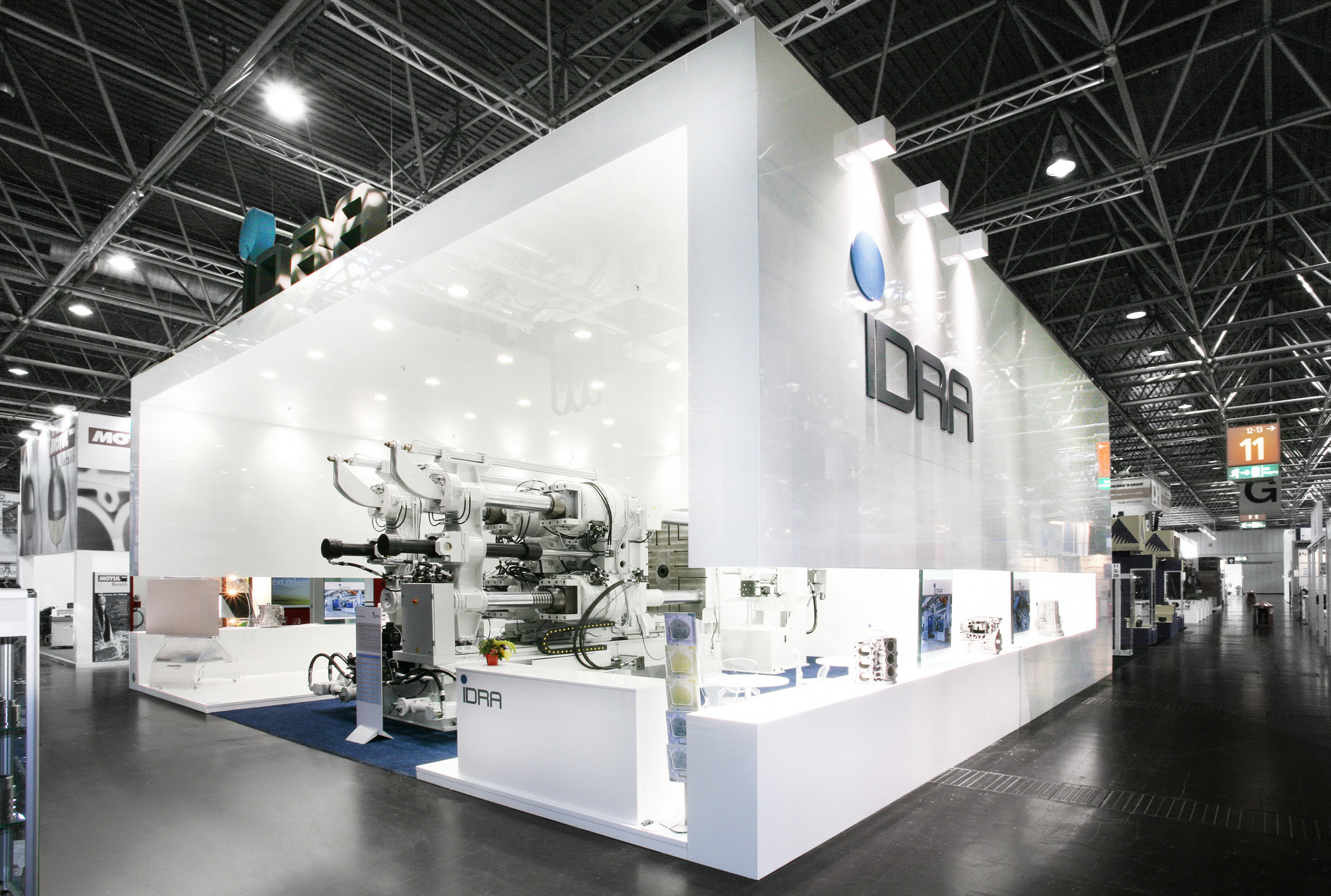 A dynamic and unusual structure frames the press, which is at the center of the stand. A closed but suspended structure makes the stand engaging and enclosed, almost as if it was in a different environment, allowing the visitor to completely immerse himself into the IDRA world. The imposing and voluminous ceilings, lightened by the lacquered white, emphasize the brand.