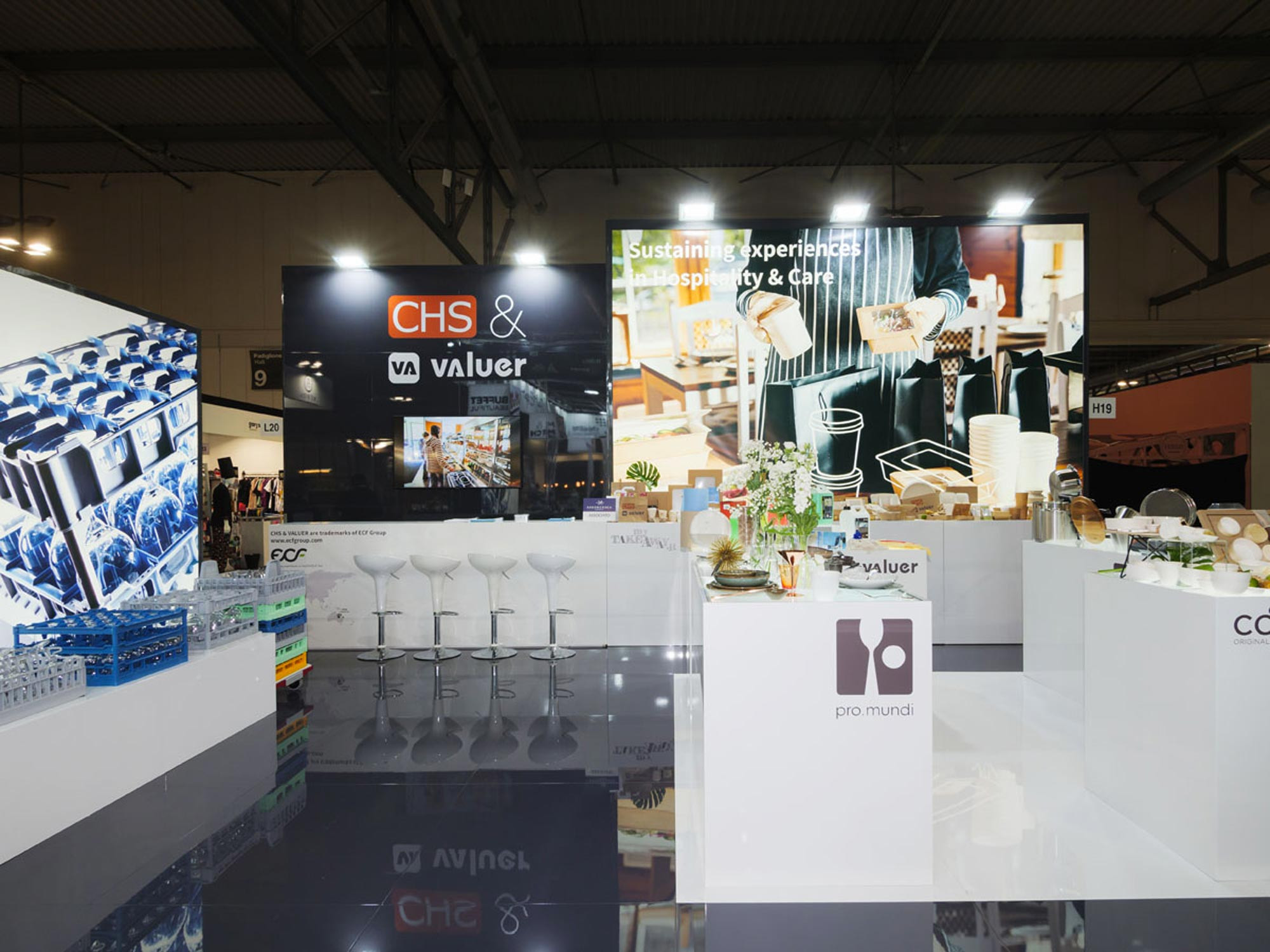 An exhibition space composed by backlight walls and partitions which give importance and emphasize the contents by catching the visitor's attention. The products on the exhibition bases are highlighted by the contrast between the white of the bases and the polished lacquered black of the floor and the back wall.