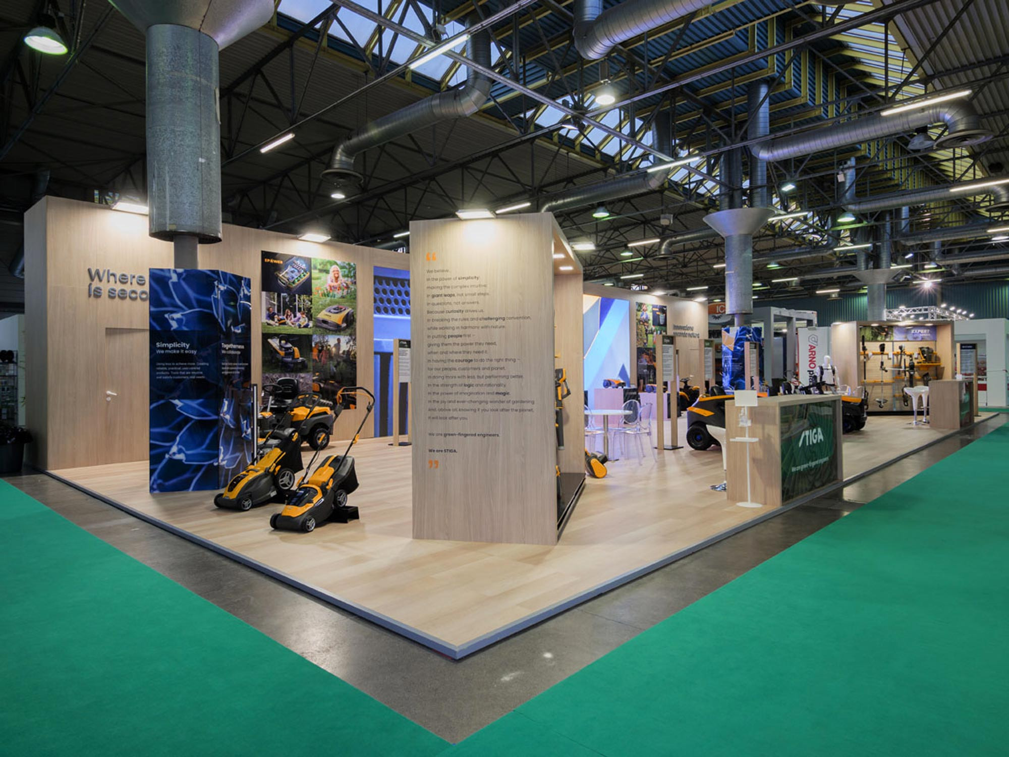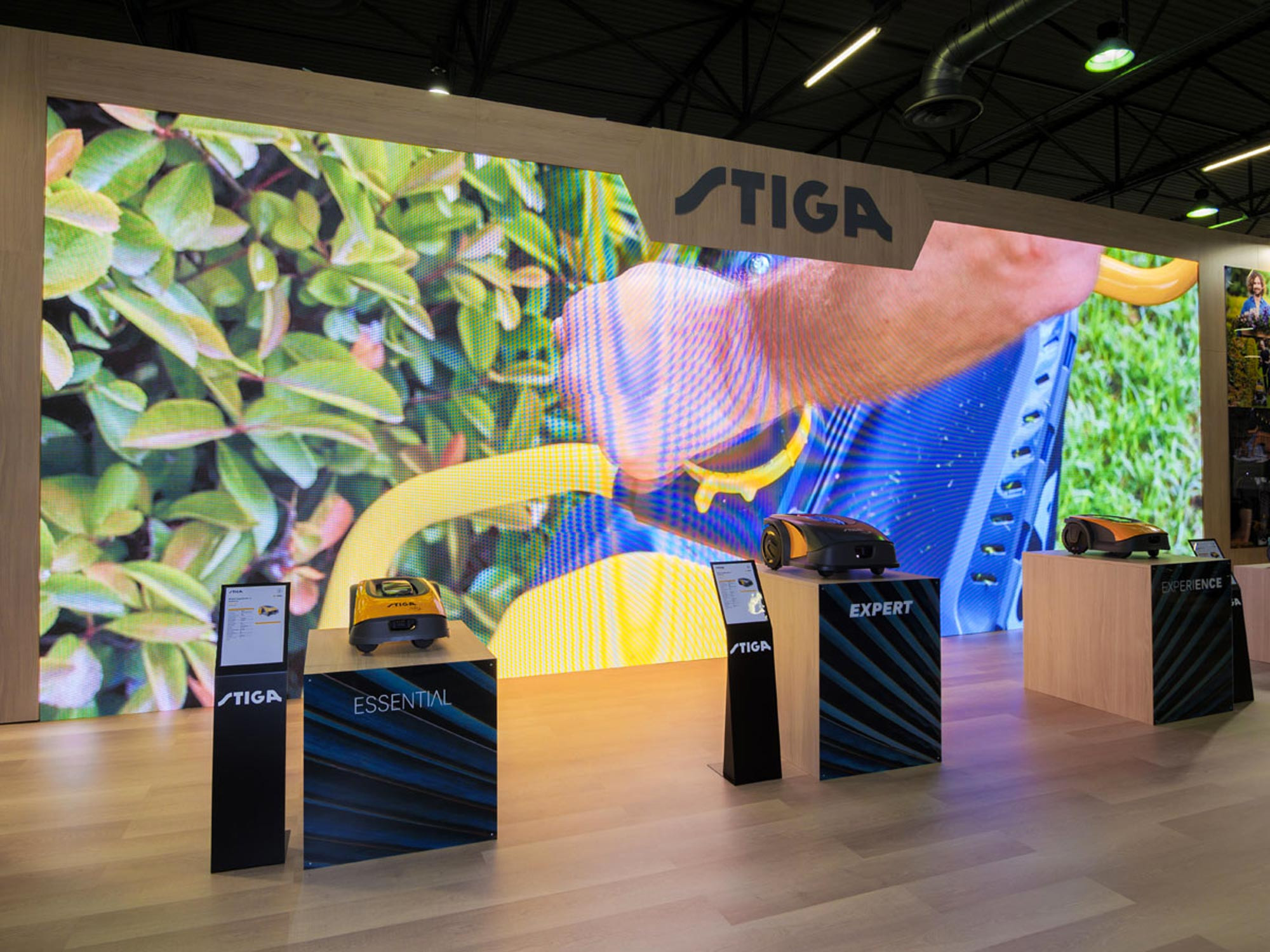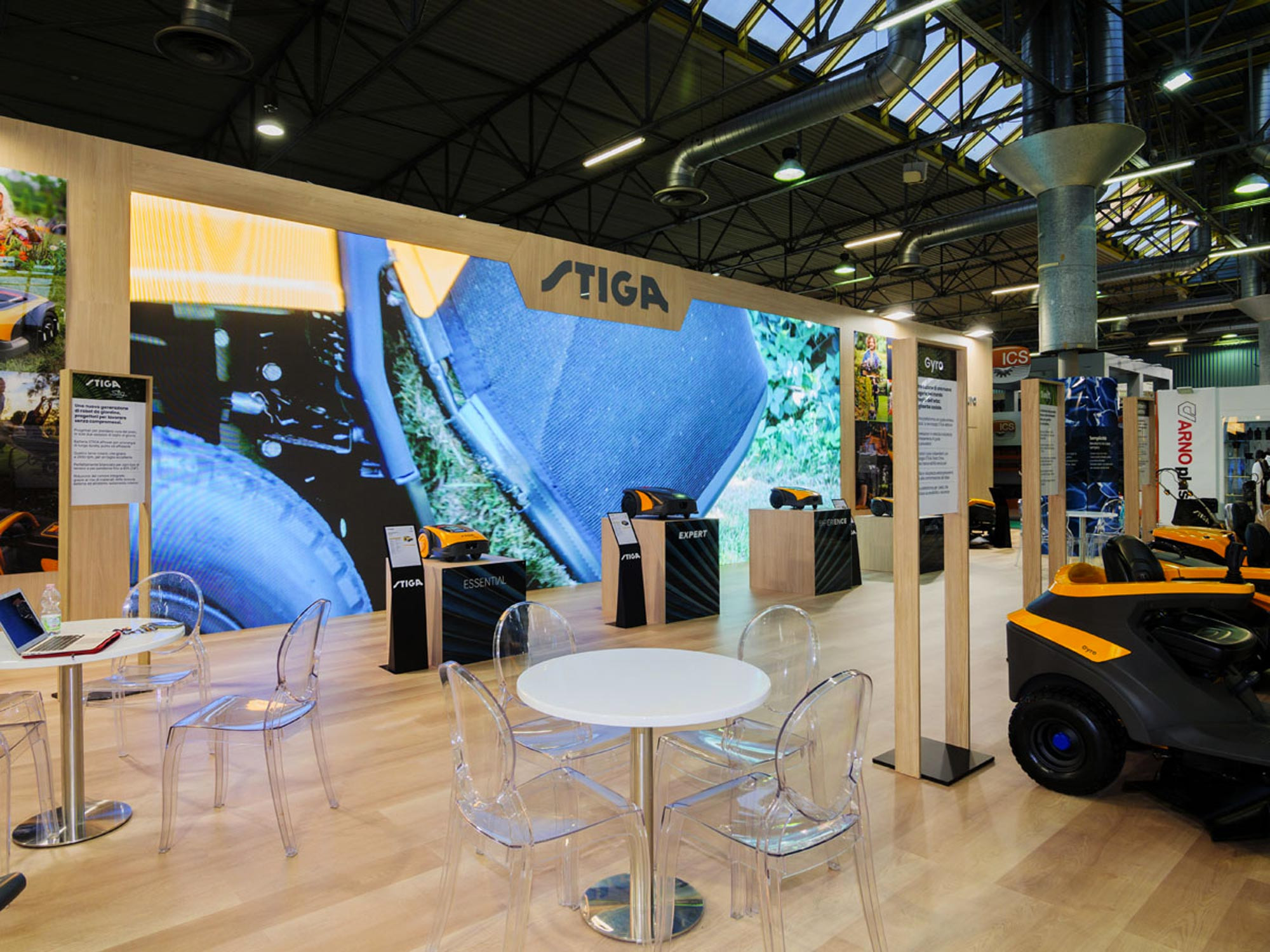 A space surrounded by nature. A customized and enchanting essence leads the visitor to the products on display. This setting is completed by a large LED wall, where the displayed contents make the visitor's experience possible. The strong identity of our partner is unmistakably conveyed in this exhibition space. There are lots of designed to measure exhibition bases for hanging and exposed products, which give them value and emphasis.