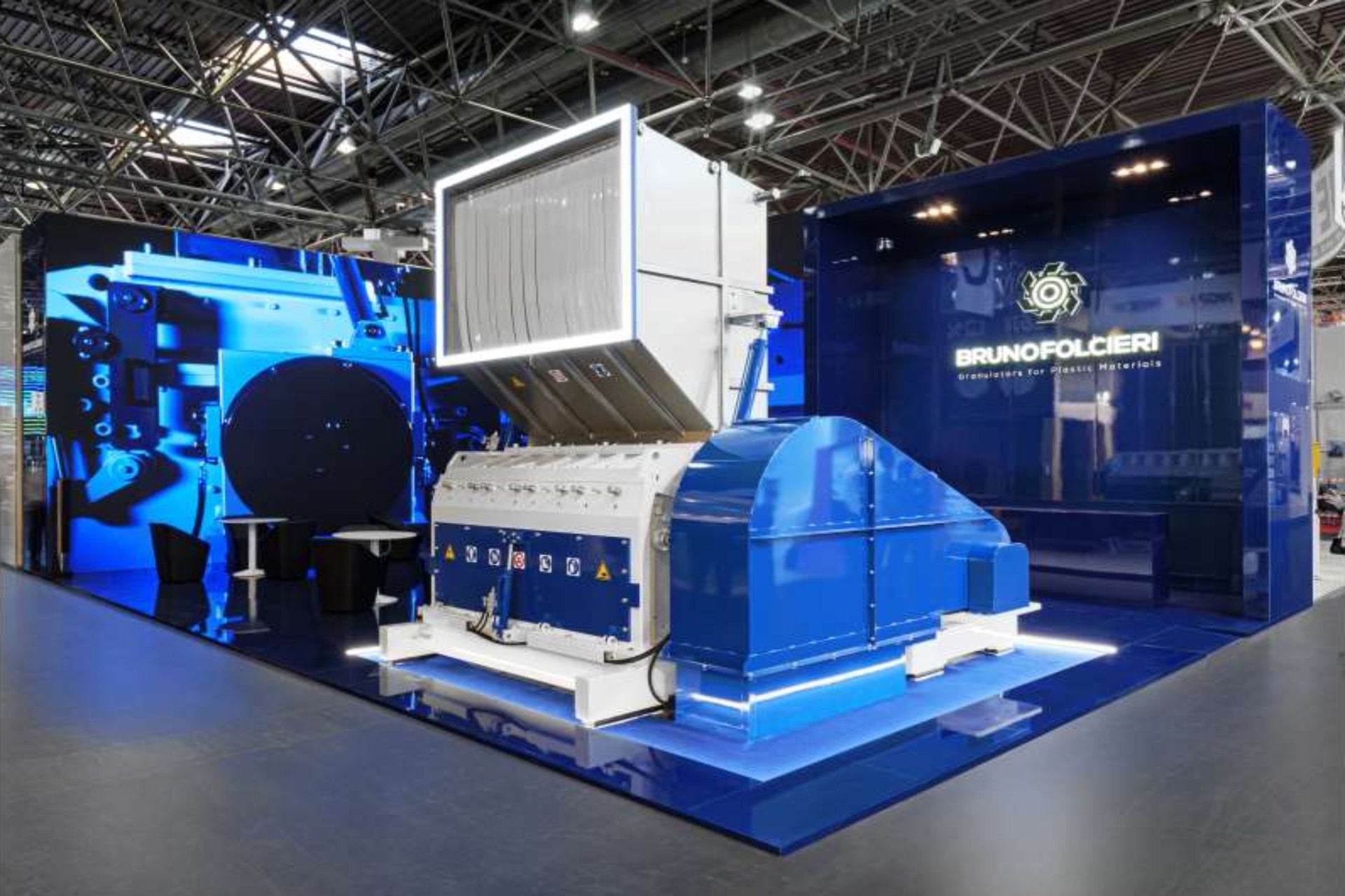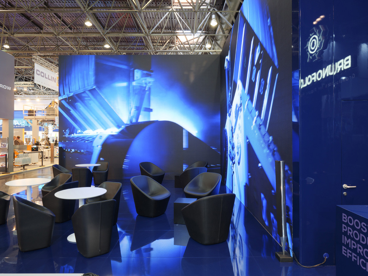 An attractive play of reflections characterizes the stand thanks to the corner LED wall and a total shiny lacquered floor. The machinery is incorporated into a booth of design and strong exhibition impact.