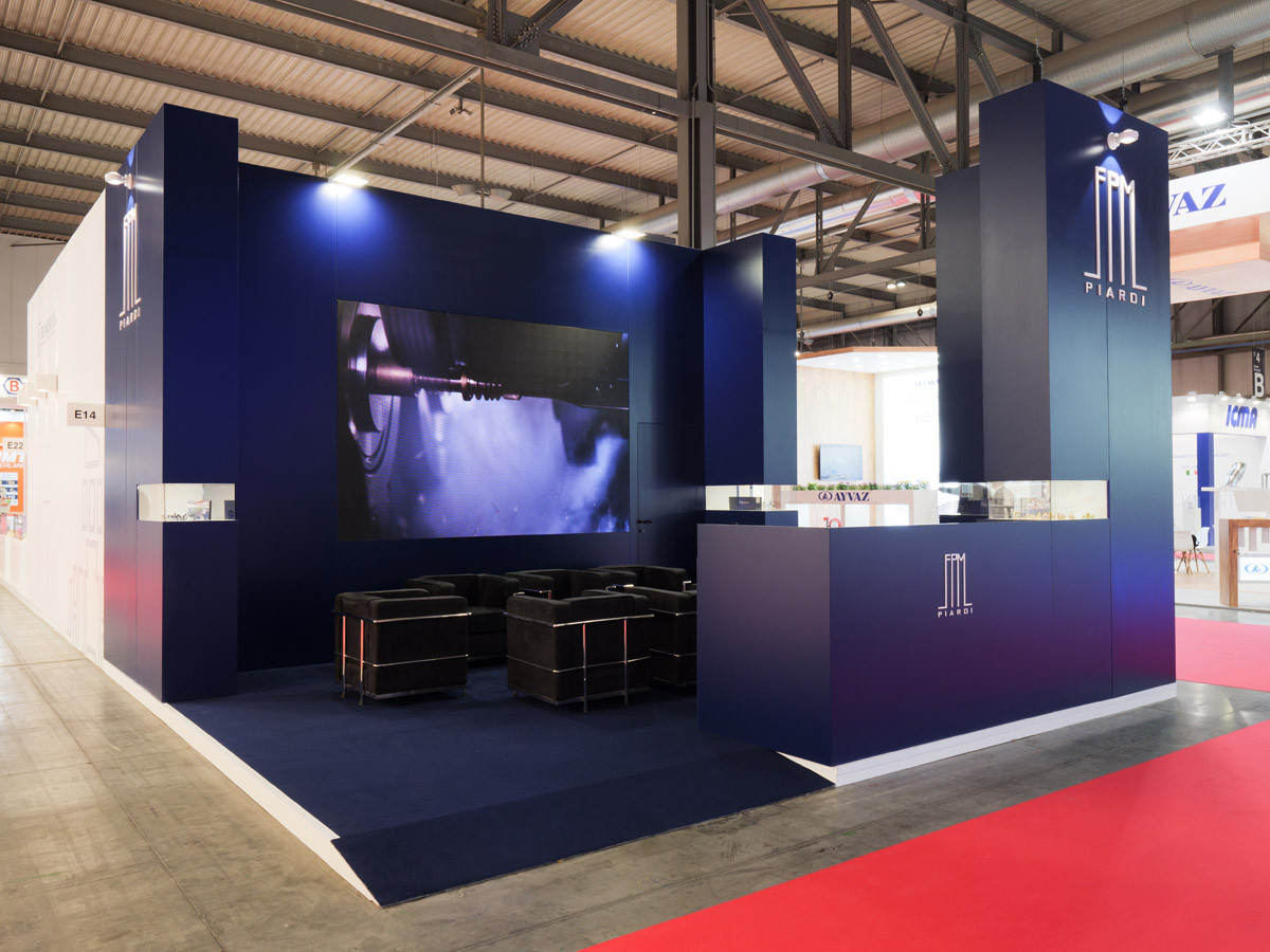 Characterized by lacquered and matt monochrome blue, this booth is elegant and tidy. The space is carefully divided between the digital area, with the LED wall, and a reception area. Exhibition recesses are incorporated into the architecture of the booth.