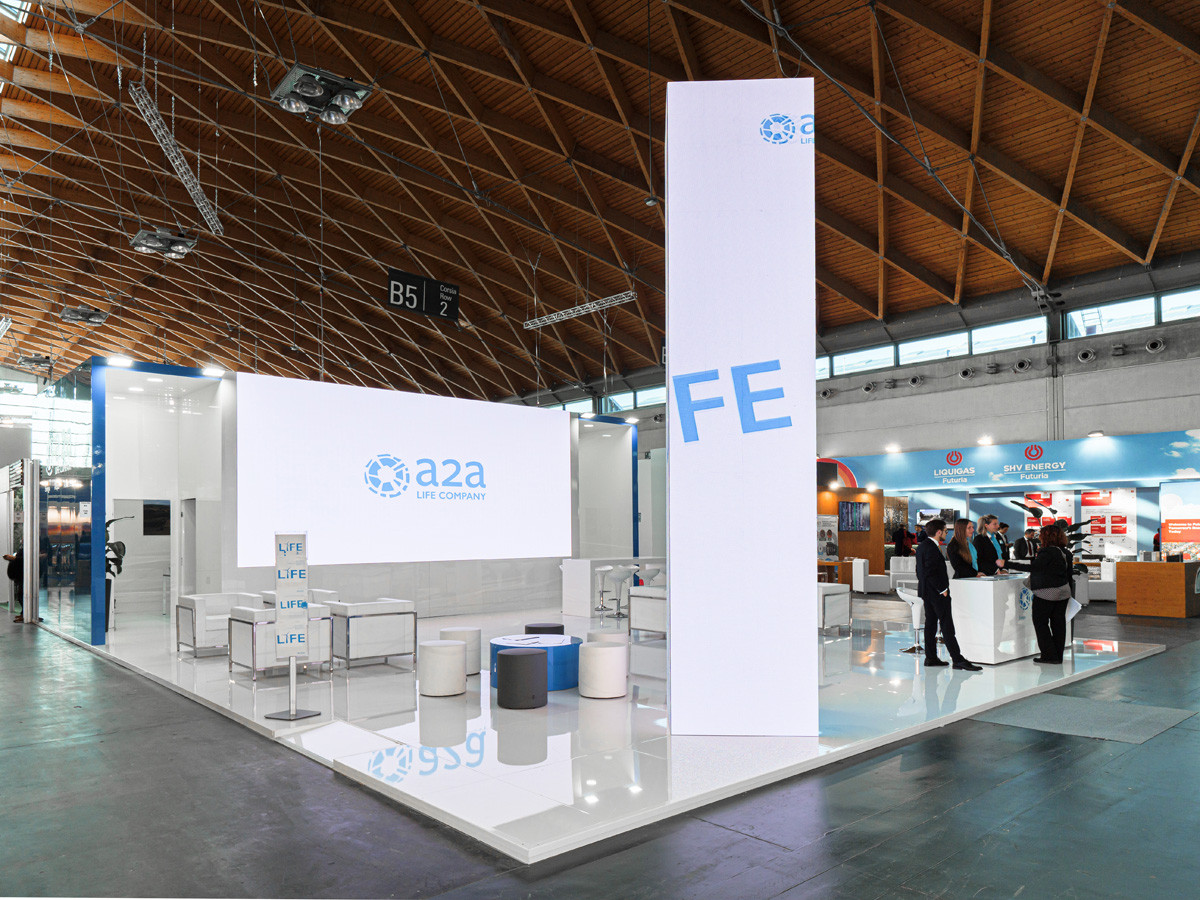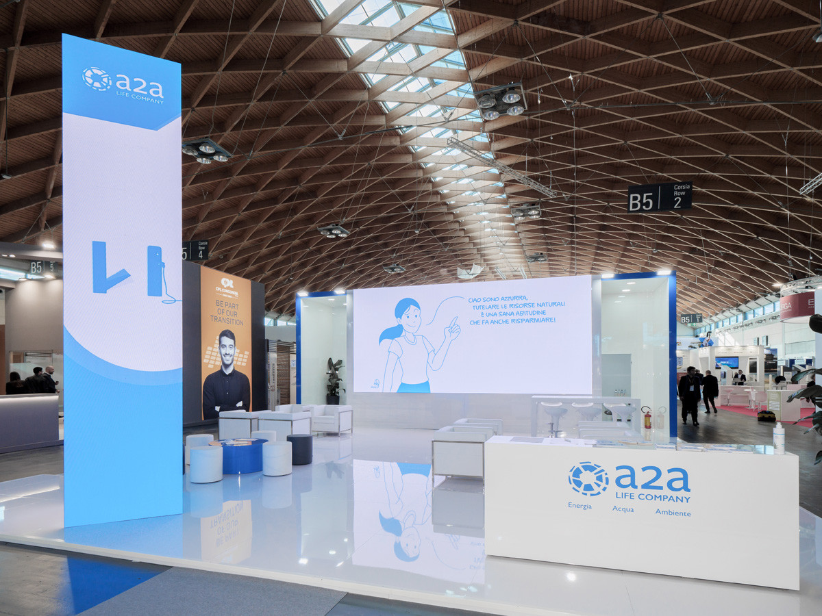 The presence of an high dynamic column with LED allows to immediatly recognize the brand. Innovative and digital, this booth is characterized by a simple but at the same time refined design.