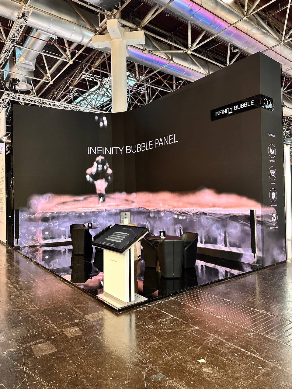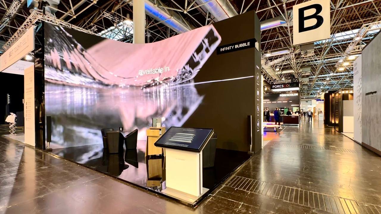 A new way of conceiving the booth. Innovation, sustainability and high technology LED wall give the possibility to the visitor to live an immersive and embracing experience. A modern presentation of the product and of the brand values.