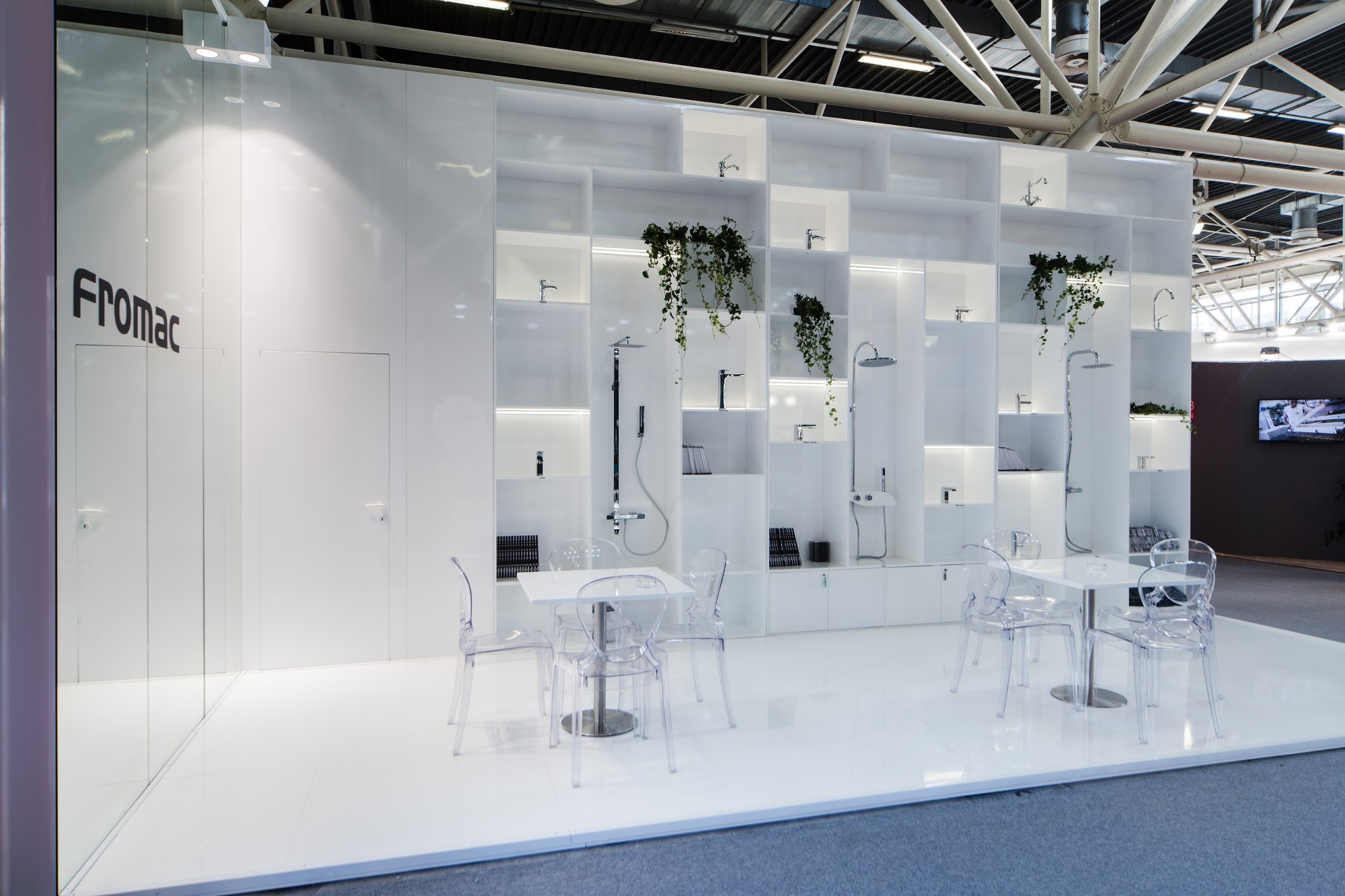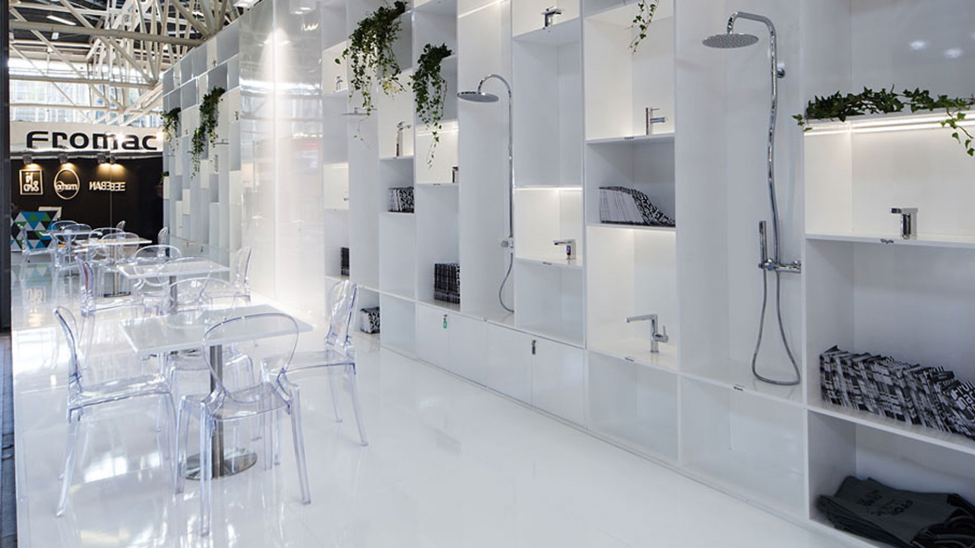 Design and cleanliness are the key words of this booth. The specially-made back wall houses the unusual exhibition of products. Brighntess and minimalism of furniture and details.