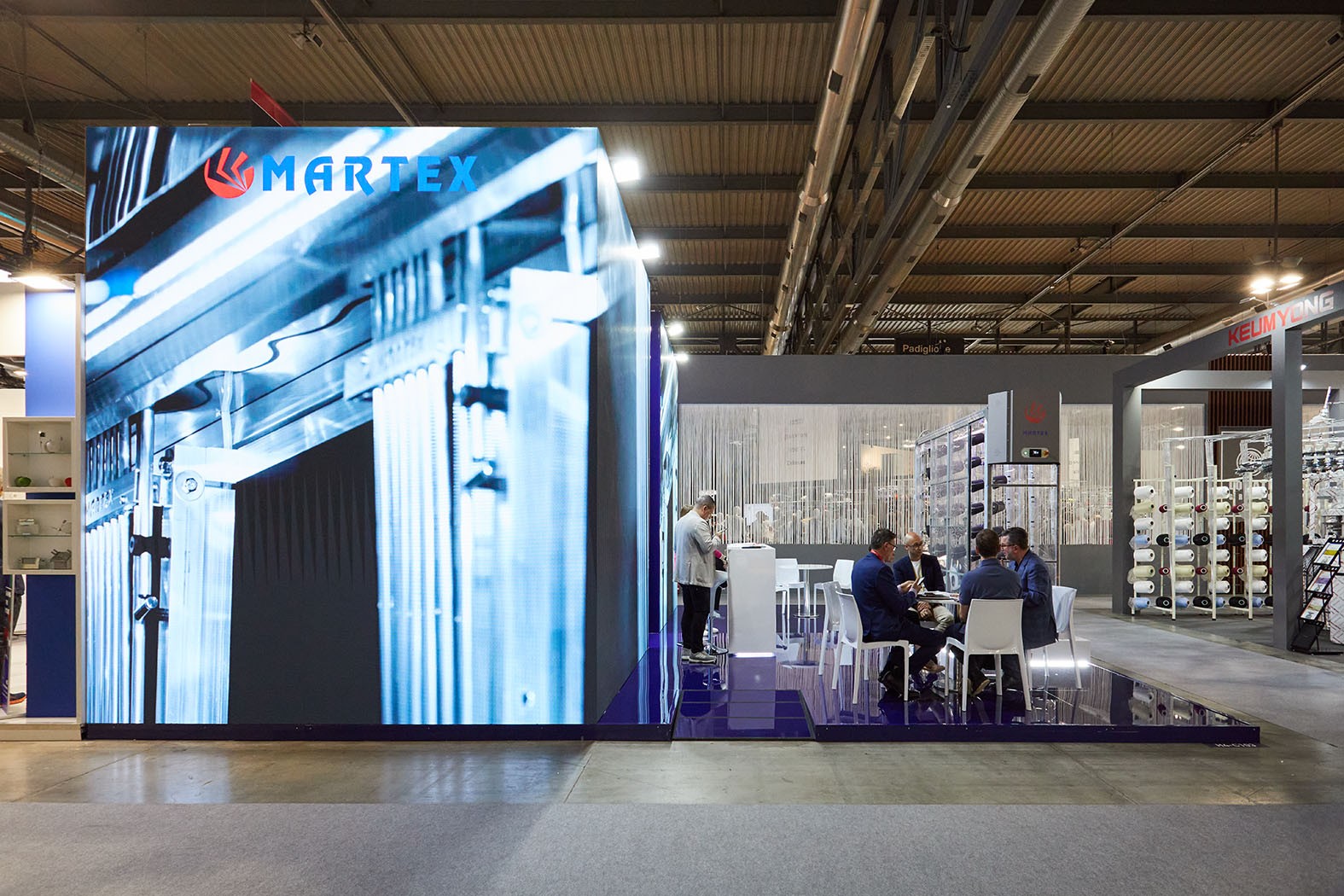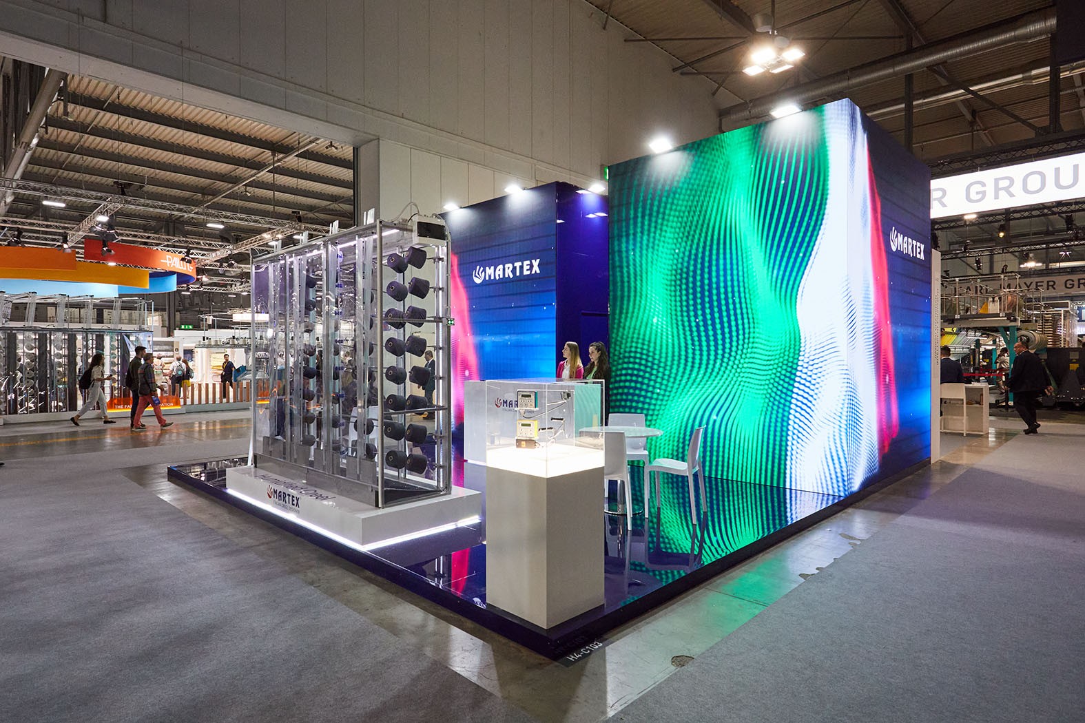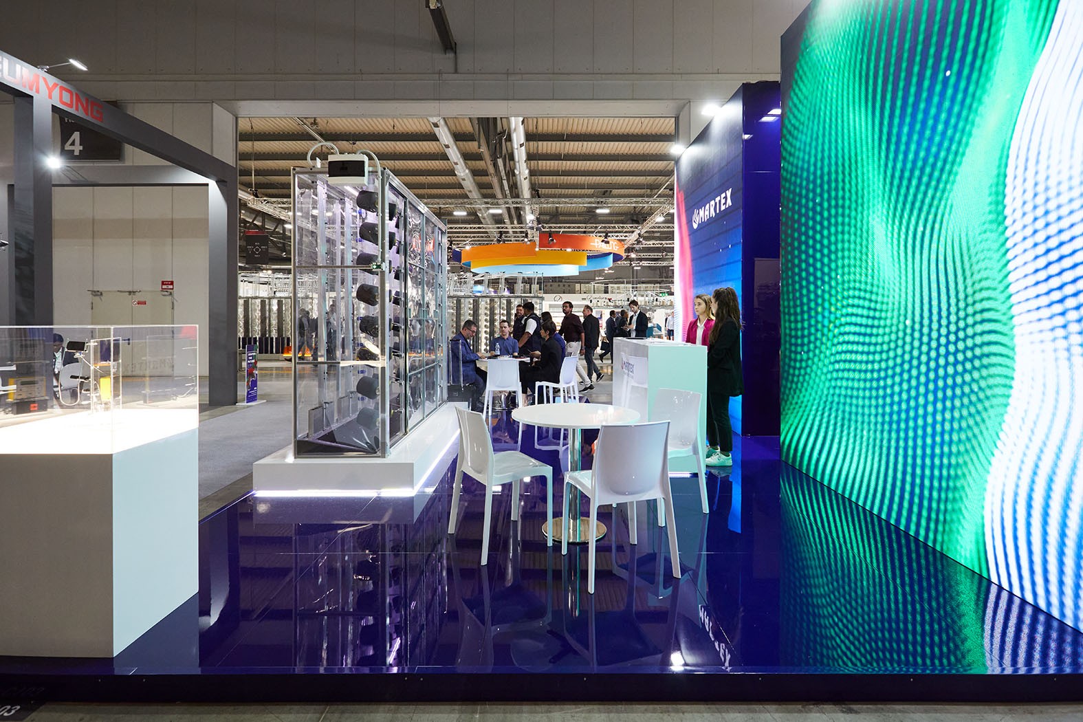 This booht is characterized by a strong digital presence. The block on the back of the booth, made with LED wall, gives dynamism and centrality to the brand.