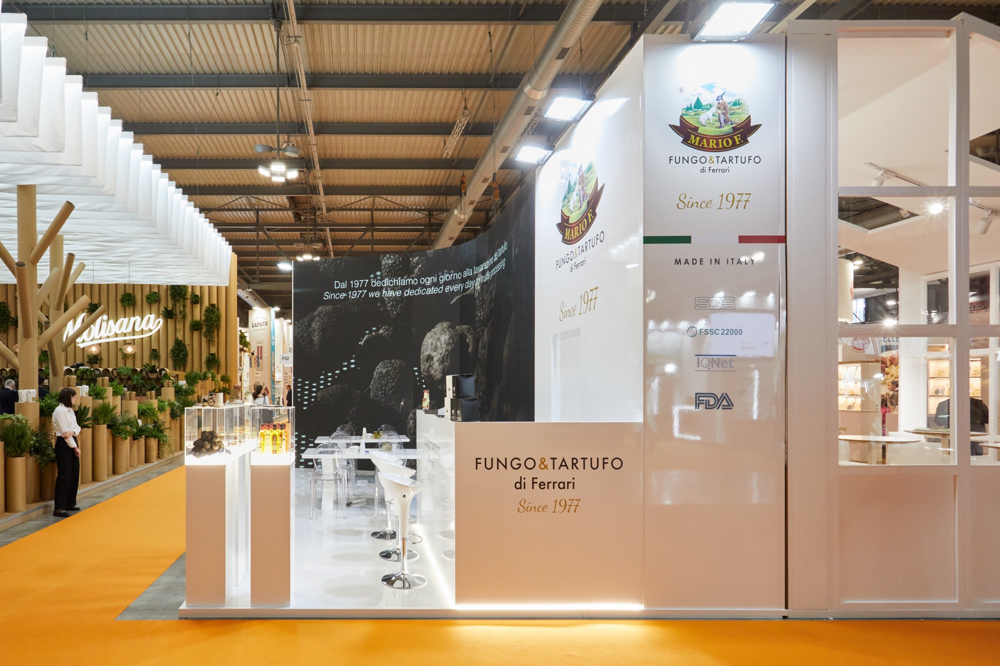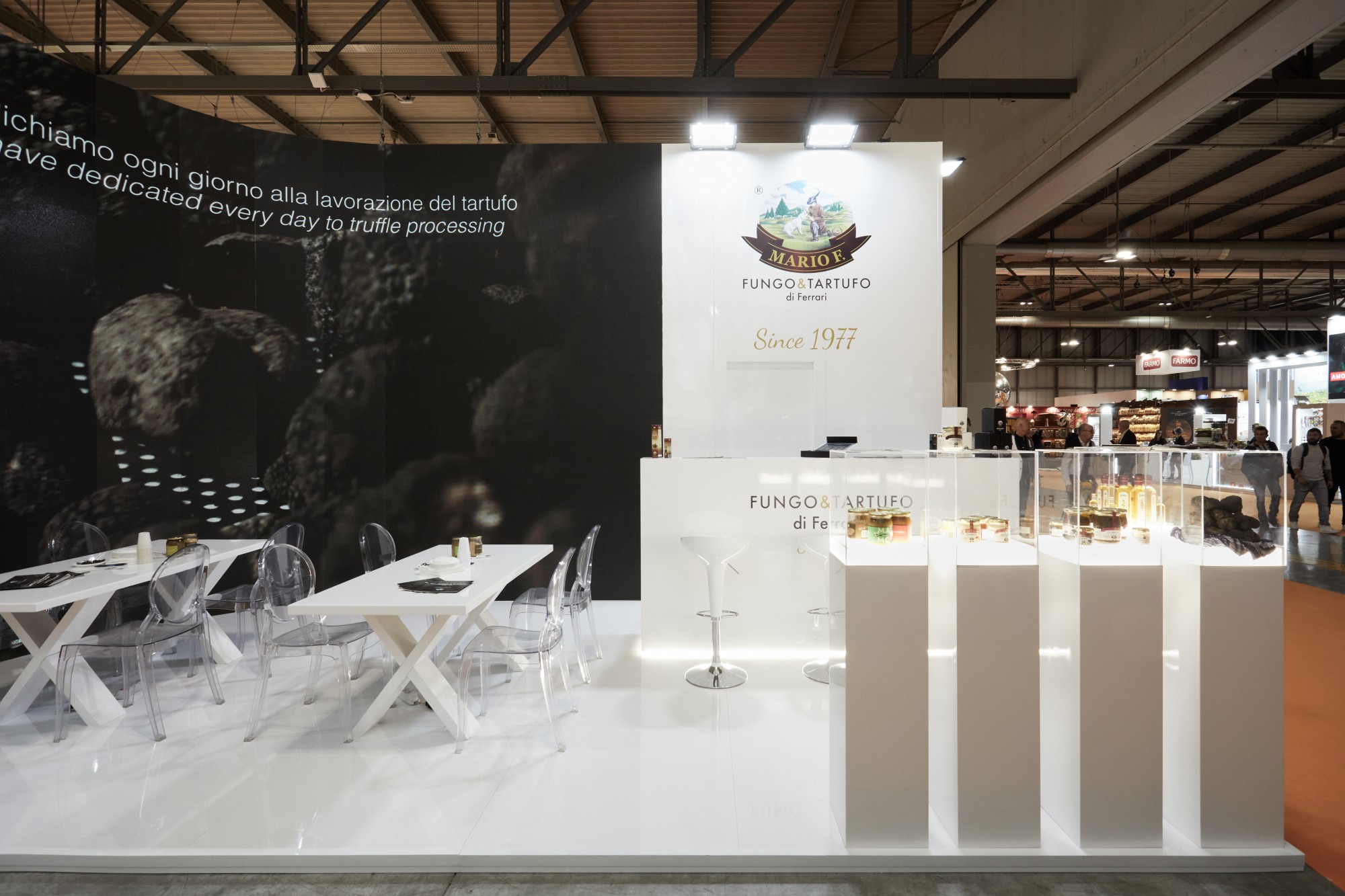 The curved installation of the LED wall is the predominant element in the booth, completed by product displays on the front. The glare, given by the light of the LED wall on the white lacquered floor and display cabinets, makes the booth particularly bright.