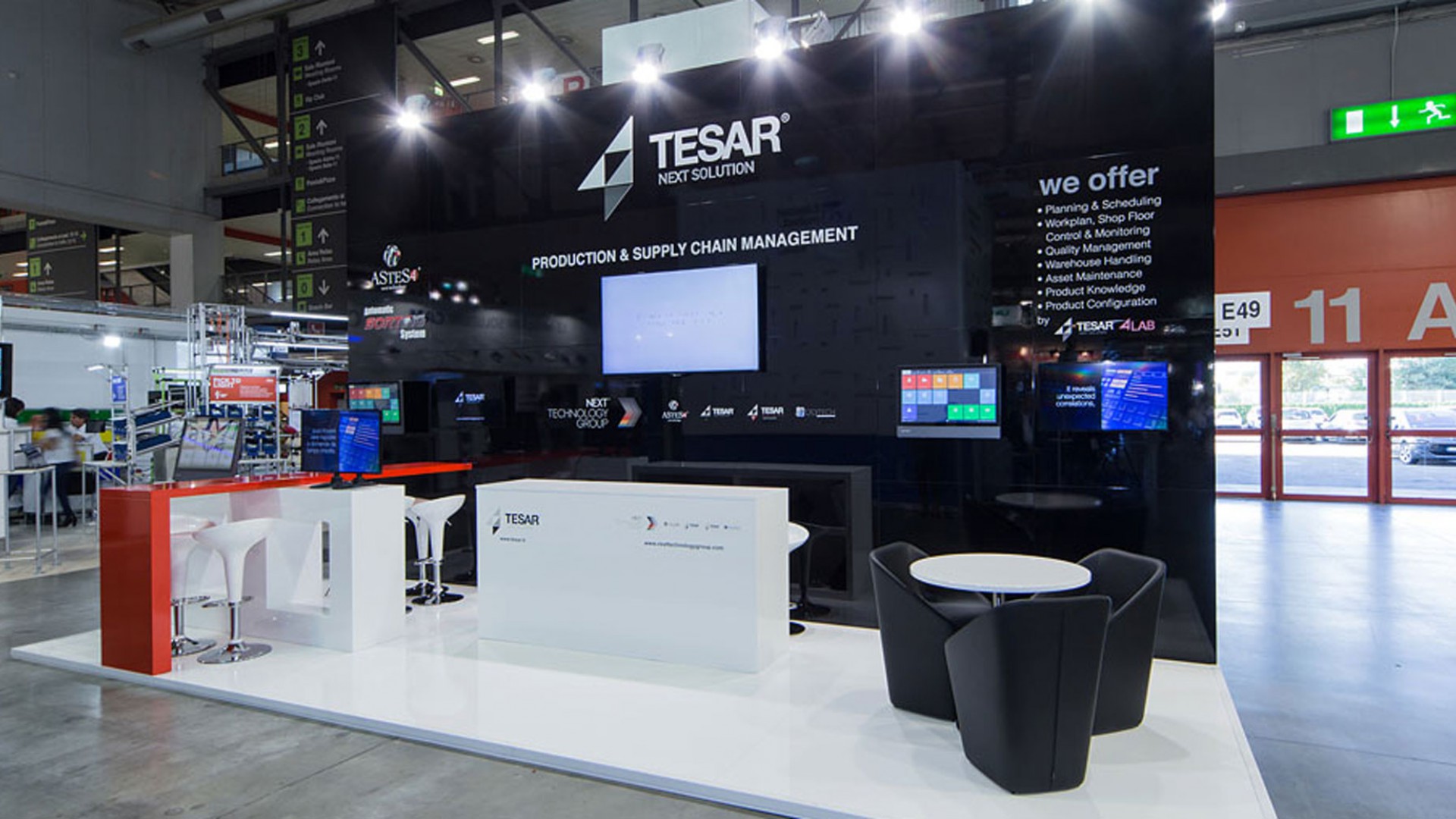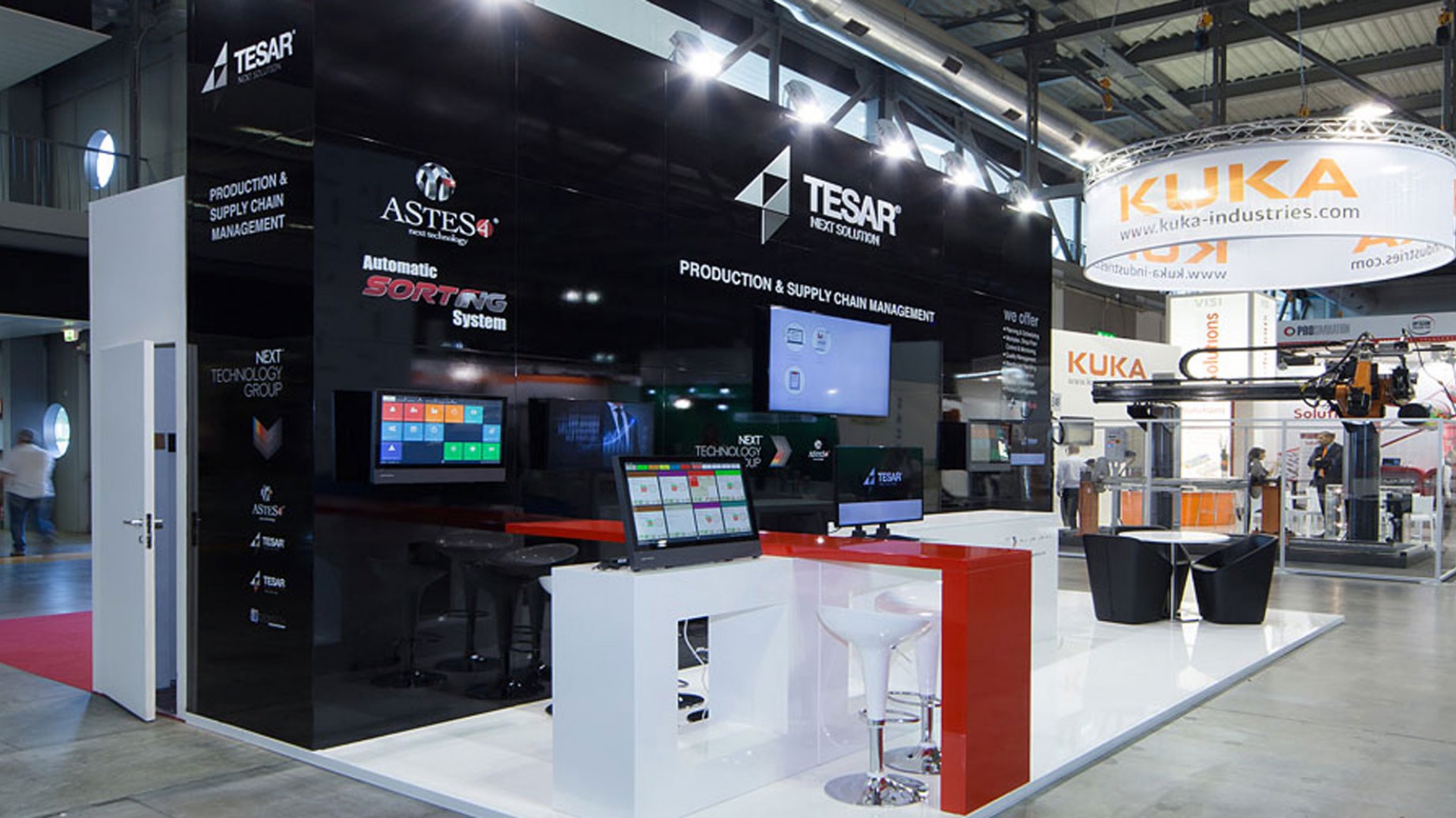 The reception desk and the various workspaces are incorporated into the architecture of the lacquered booth, which highlights the brand and the corporate communication.