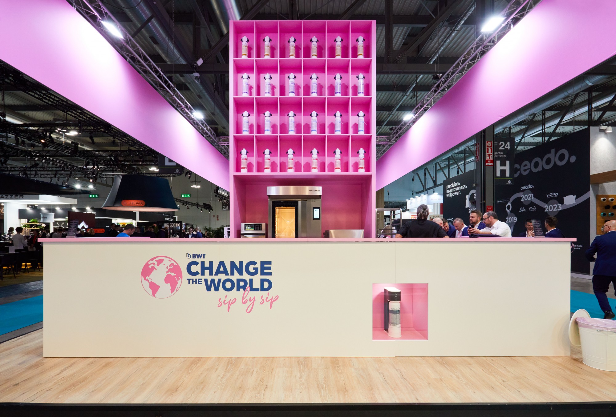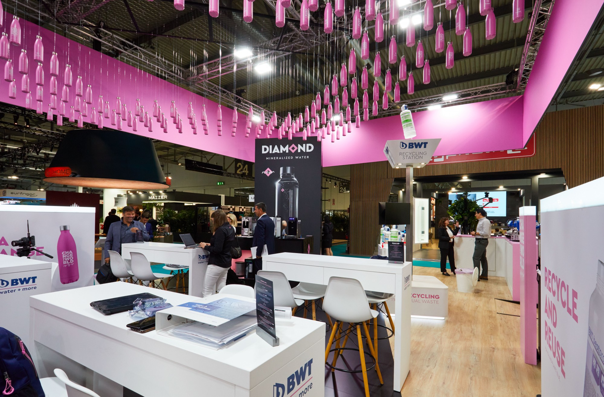 High chromatic and visual impact, communication and architecture are perfectly blended in this stand. The visitor's attention is immediately captured by the ceiling, which presents an original installation of the product. The space is divided into several exhibition areas and the product displays are customized. Completed by a counter for showcooking and a column entirely covered by ledwall to ensure an immersive experience.