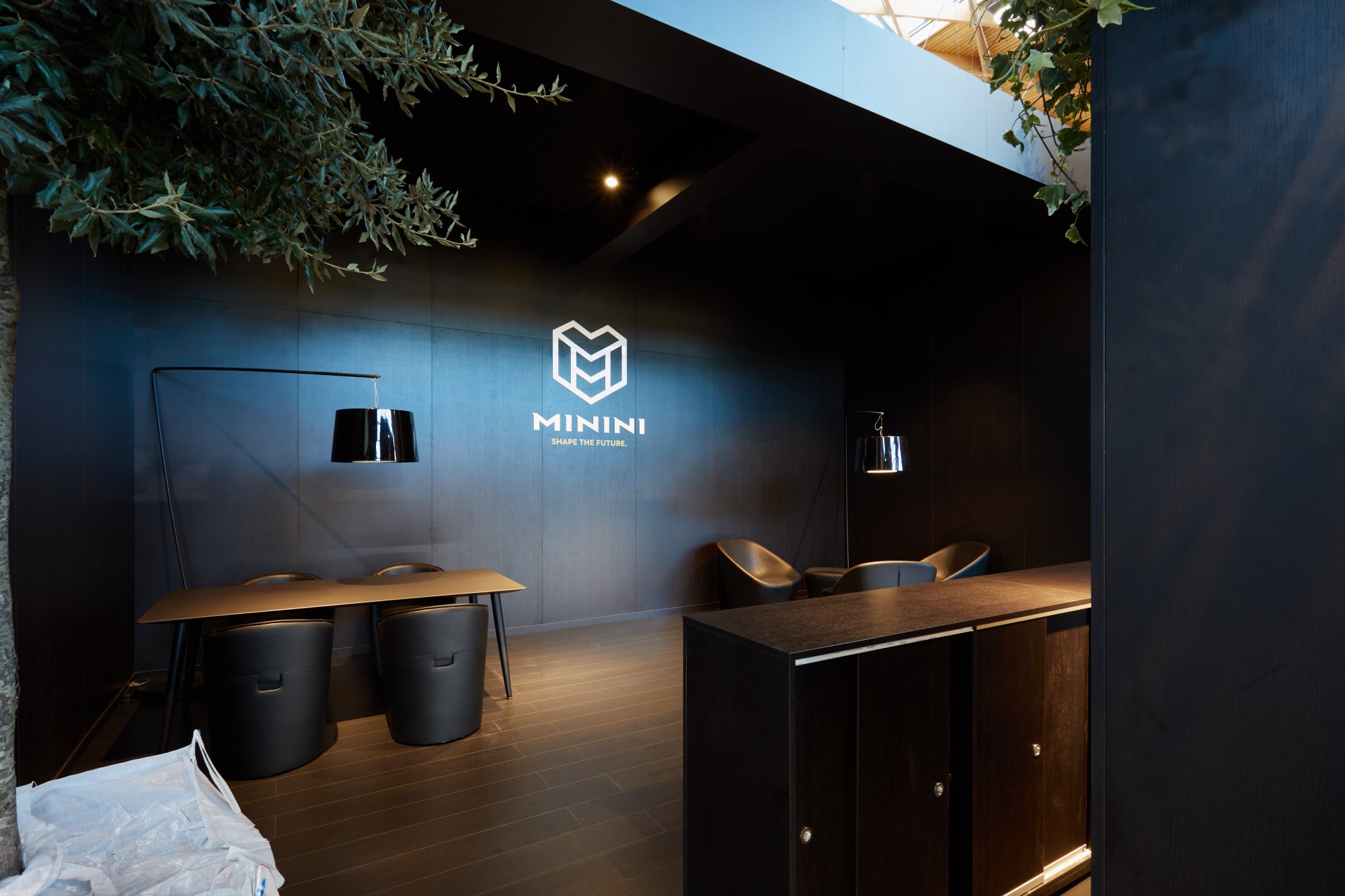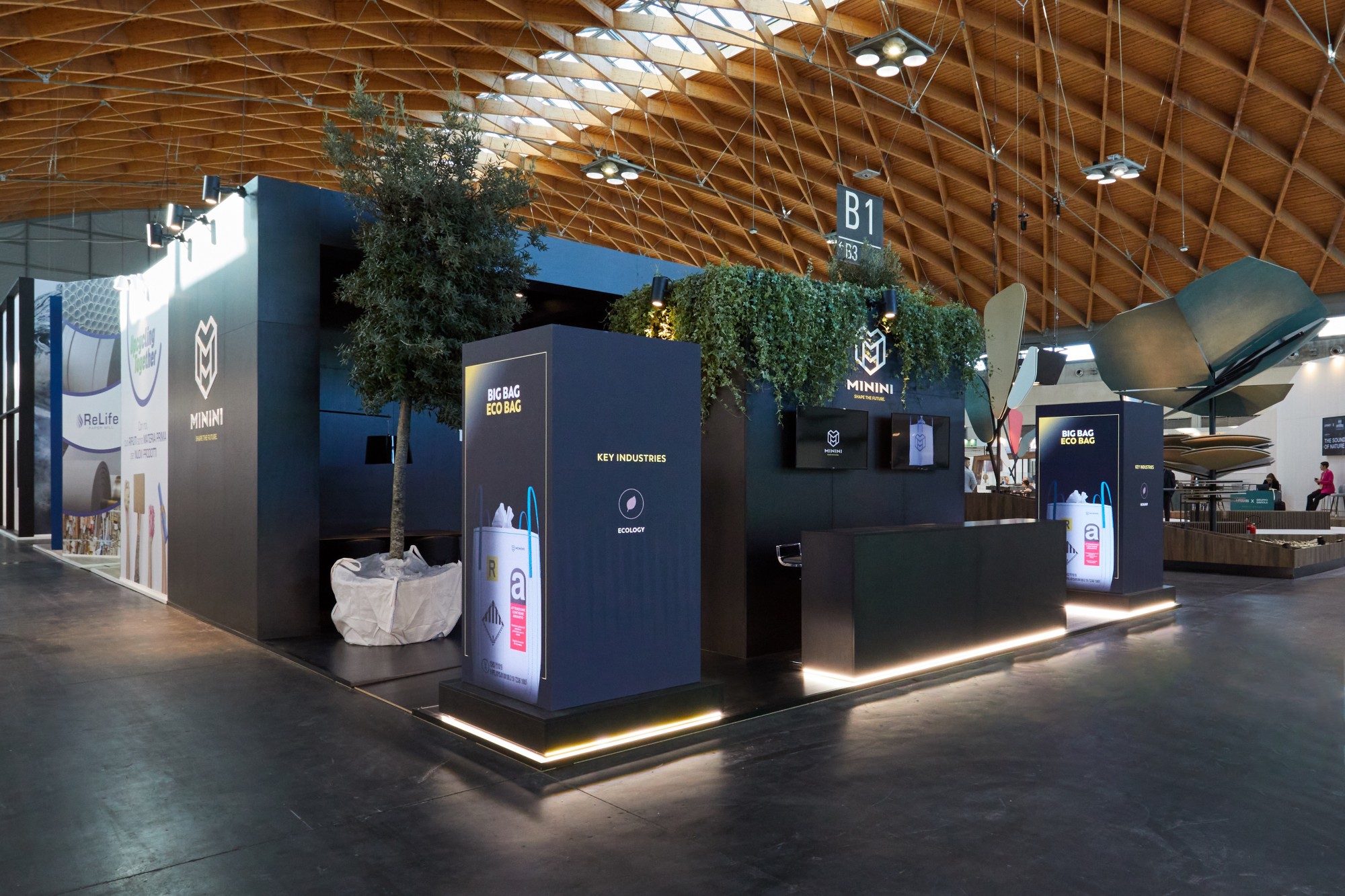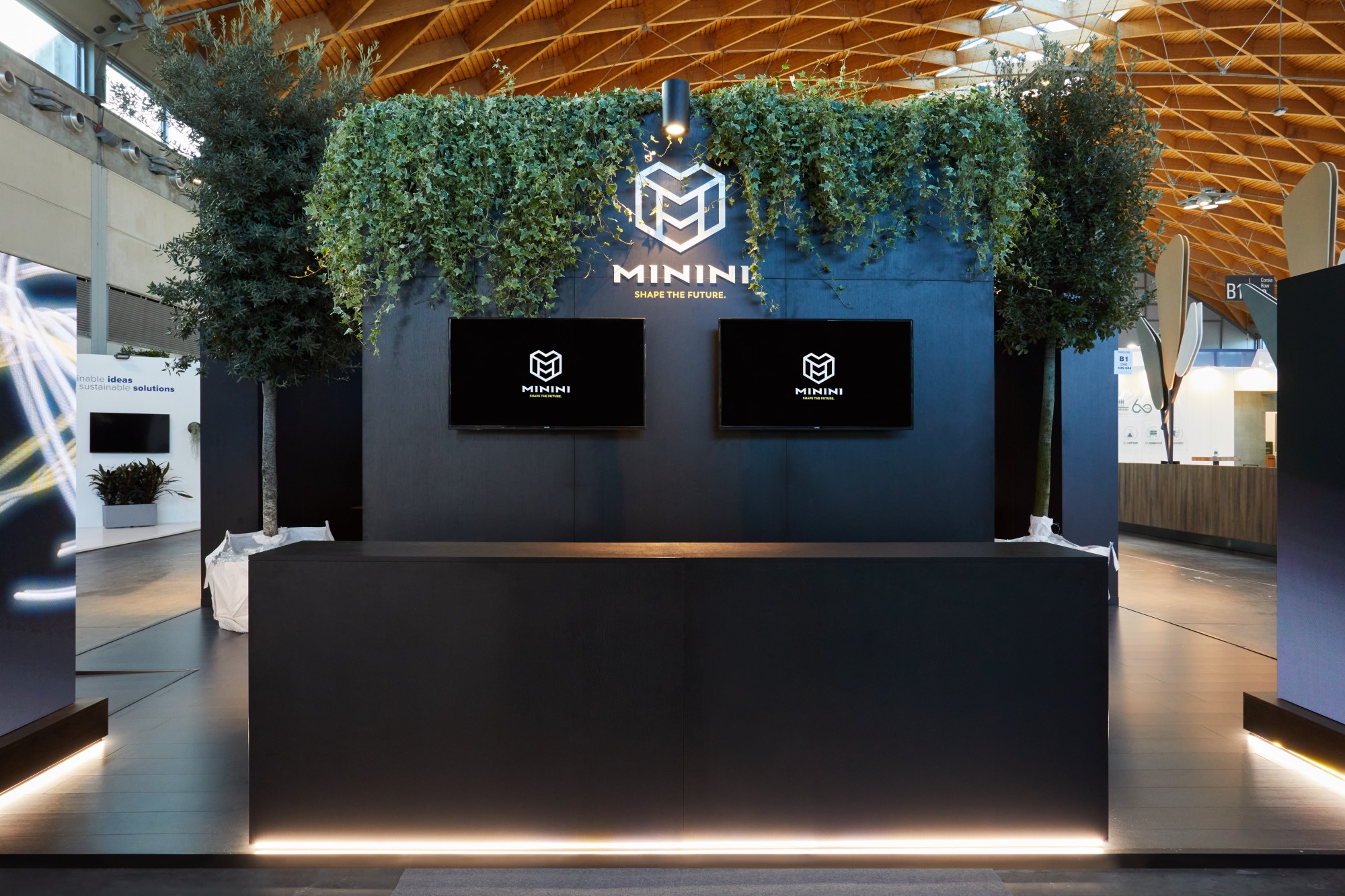 Elegant and refined booth, with a strong digital vision given by the presence of two columns, entirely made of ledwall, which show company's contents simultaneously. The refined design area, behind the reception, is private and welcoming. The green elements are combined with the architecture of this stand.
