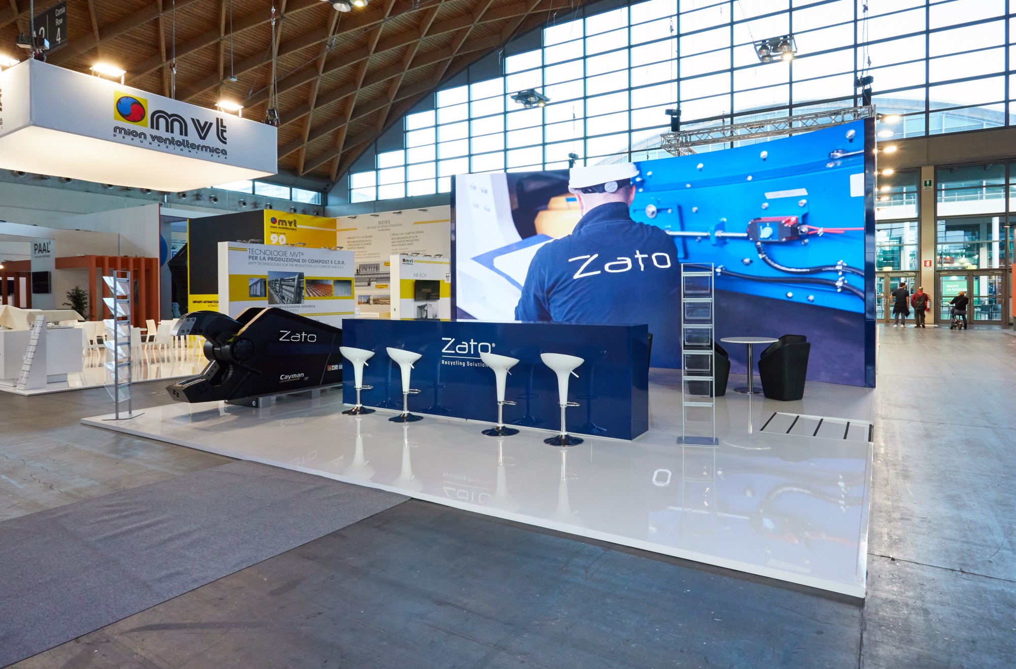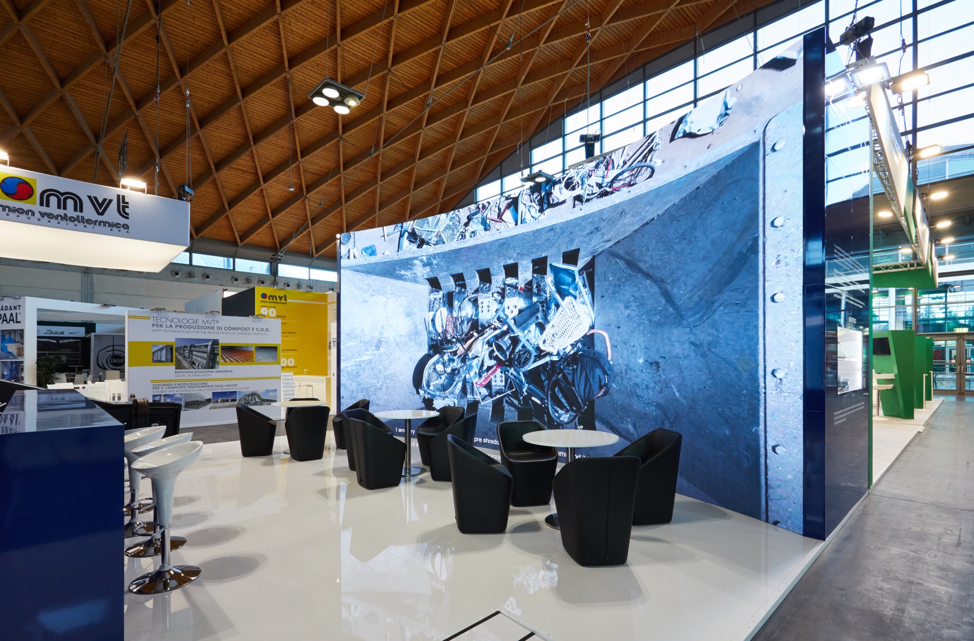 Clean and essential booth. The unusual curved ledwall installation involves the visitor by drawing his attention. The digital component allows also to communicate in a clear and immediate way the company's business.