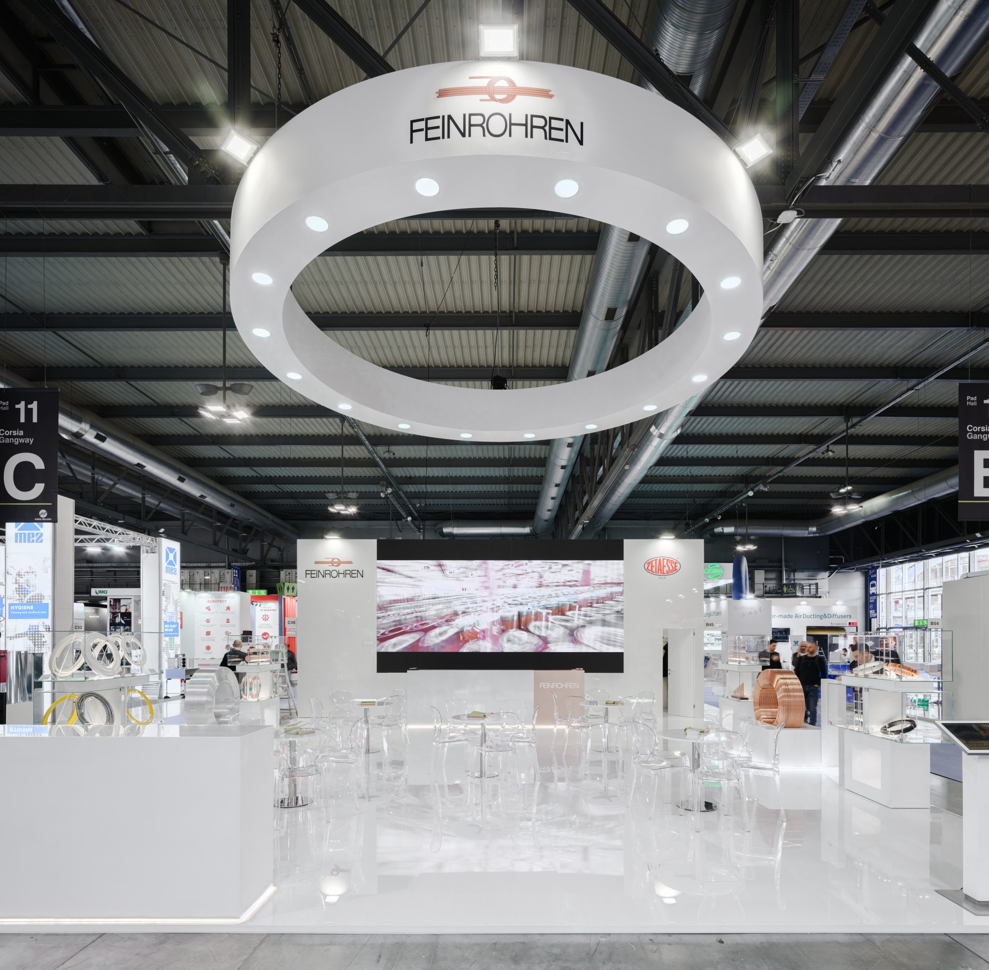 Designed and created by FORM, the stand is distinguished by its clean lines and the elegance of its white lacquered finish. A spacious and bright exhibition area, featuring a large LED wall that captures attention and enhances the brand’s visual communication. The integrated display cases carefully showcase the company’s products, offering visitors a neat and immersive experience.