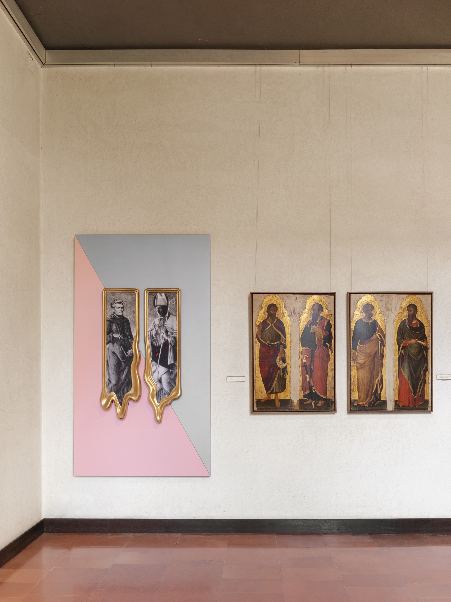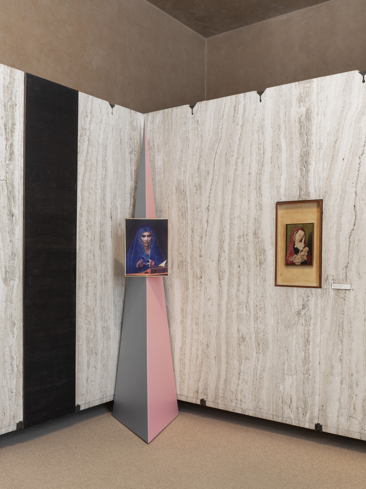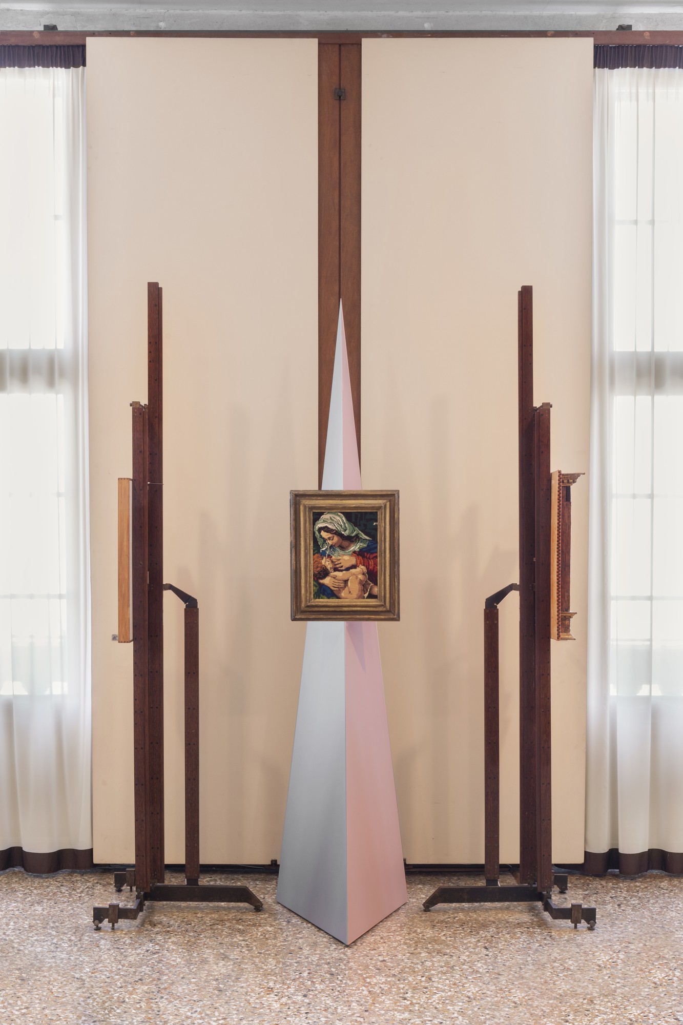 The design of the display elements for the works is inspired by Scarpa’s architecture, and the selected colors recall the nuances used by the architect in the Quadreria of the Museo Correr. The exhibition supports created by us blend seamlessly with the museum setting and enhance the artist’s works.