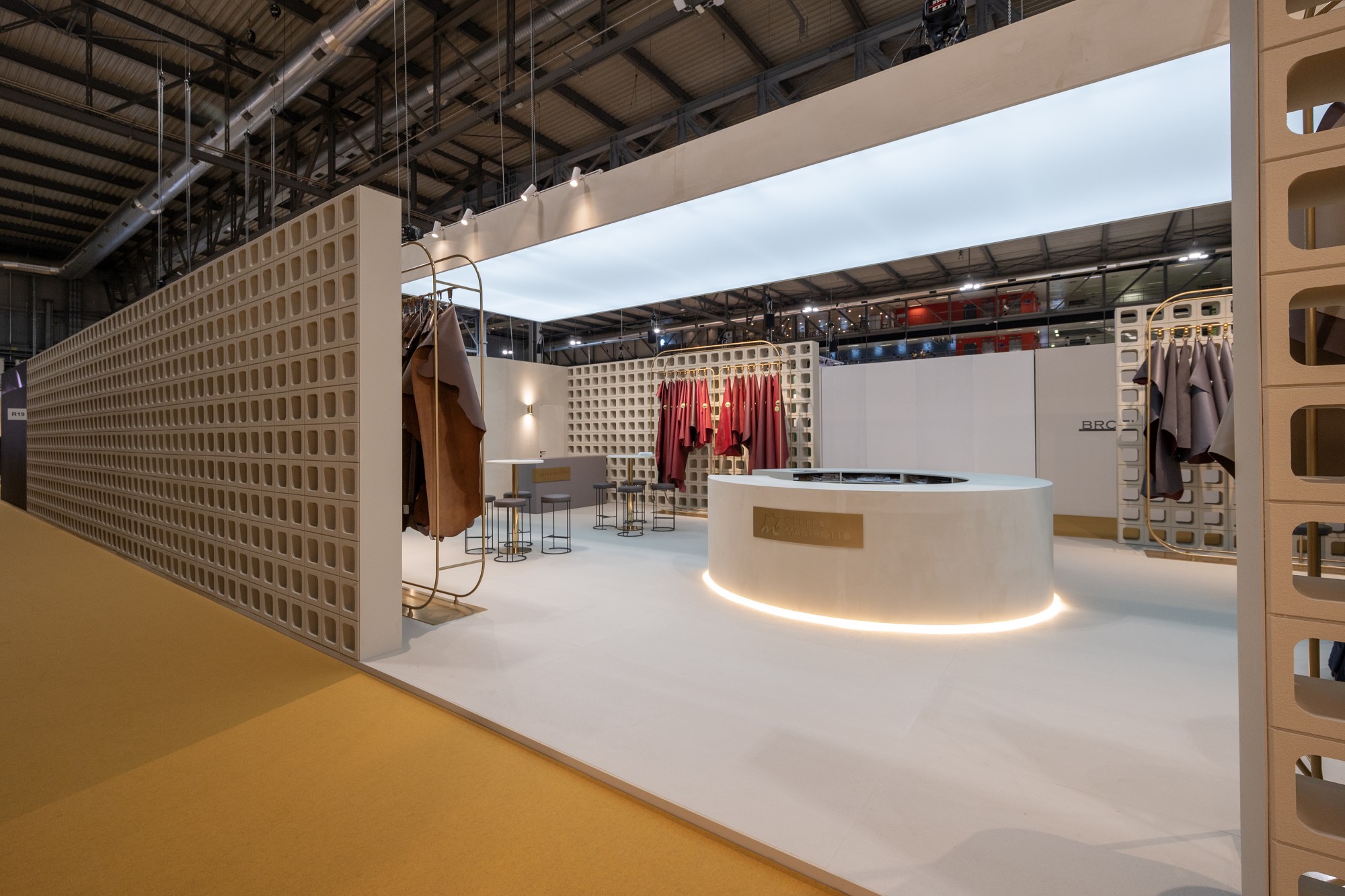 The stand conveys a sophisticated and elegant atmosphere, thanks to the textured wall finishes, achieved through plastering and paired with large perforated surfaces. The expansive luminous ceilings and the uniformity of materials complete the structure, creating visual harmony that enhances the overall experience.