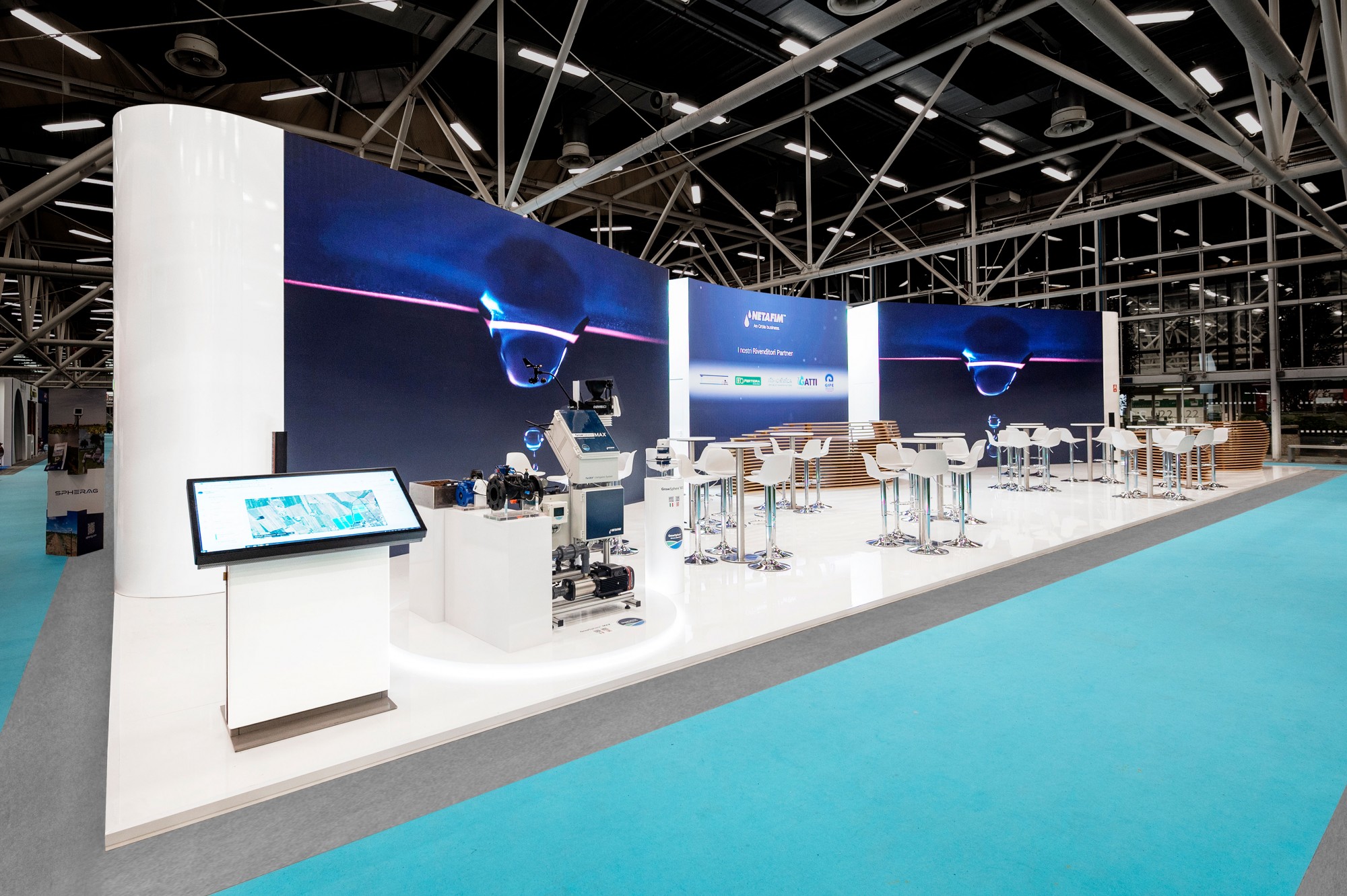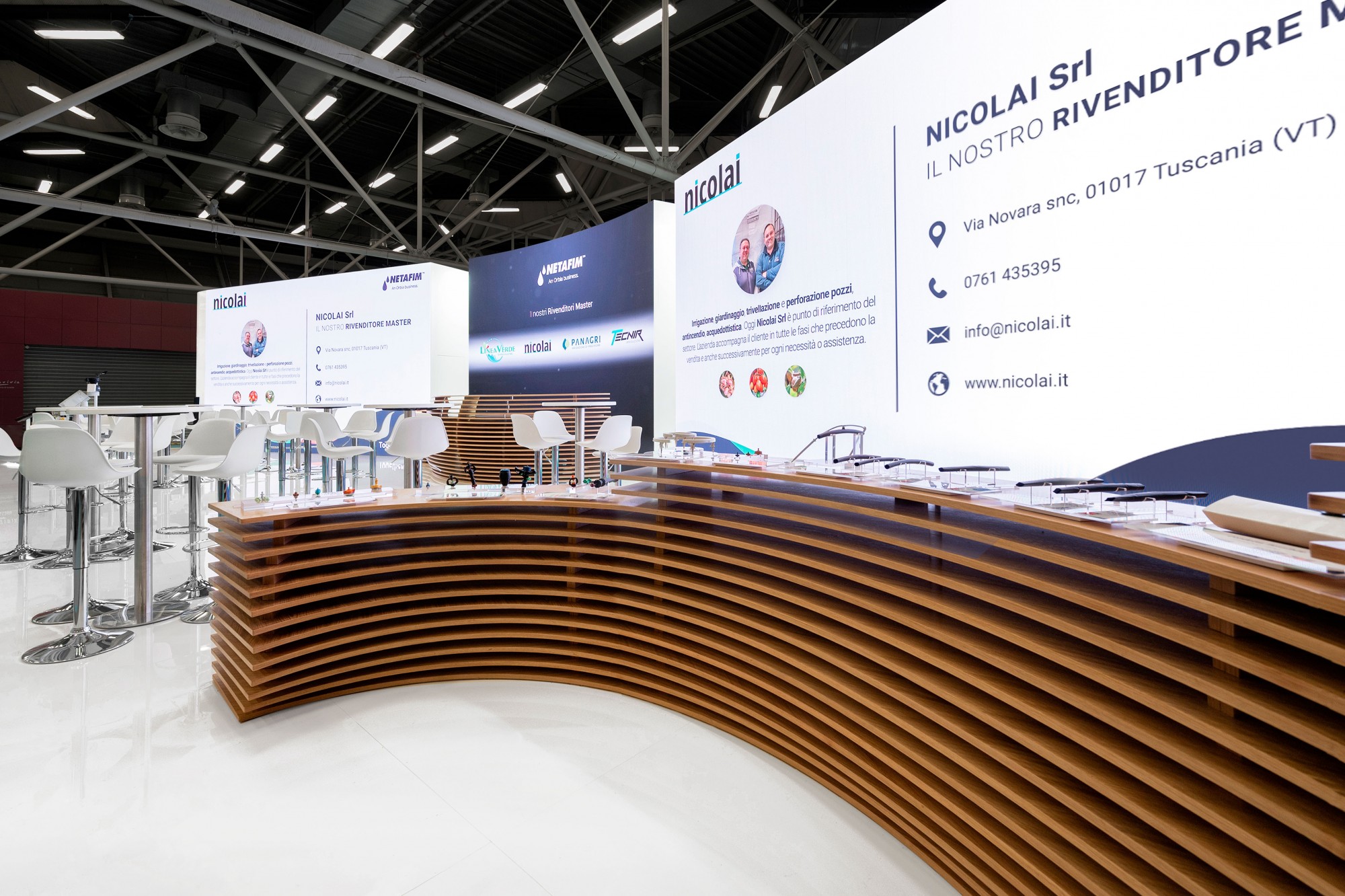 The stand stands out for its large size and the spectacular effect created by the three-sided LED walls, which surround visitors in a highly immersive and impactful visual experience. The unique and innovative design is intended to highlight every detail and create an engaging atmosphere.