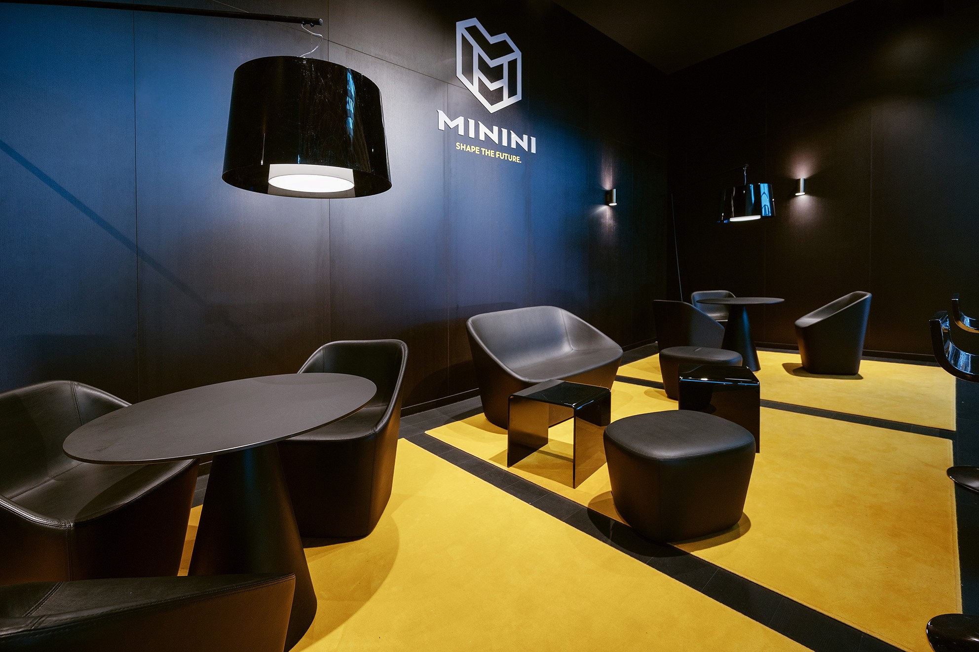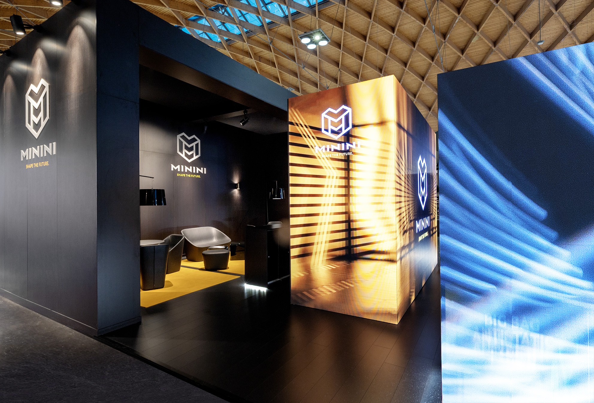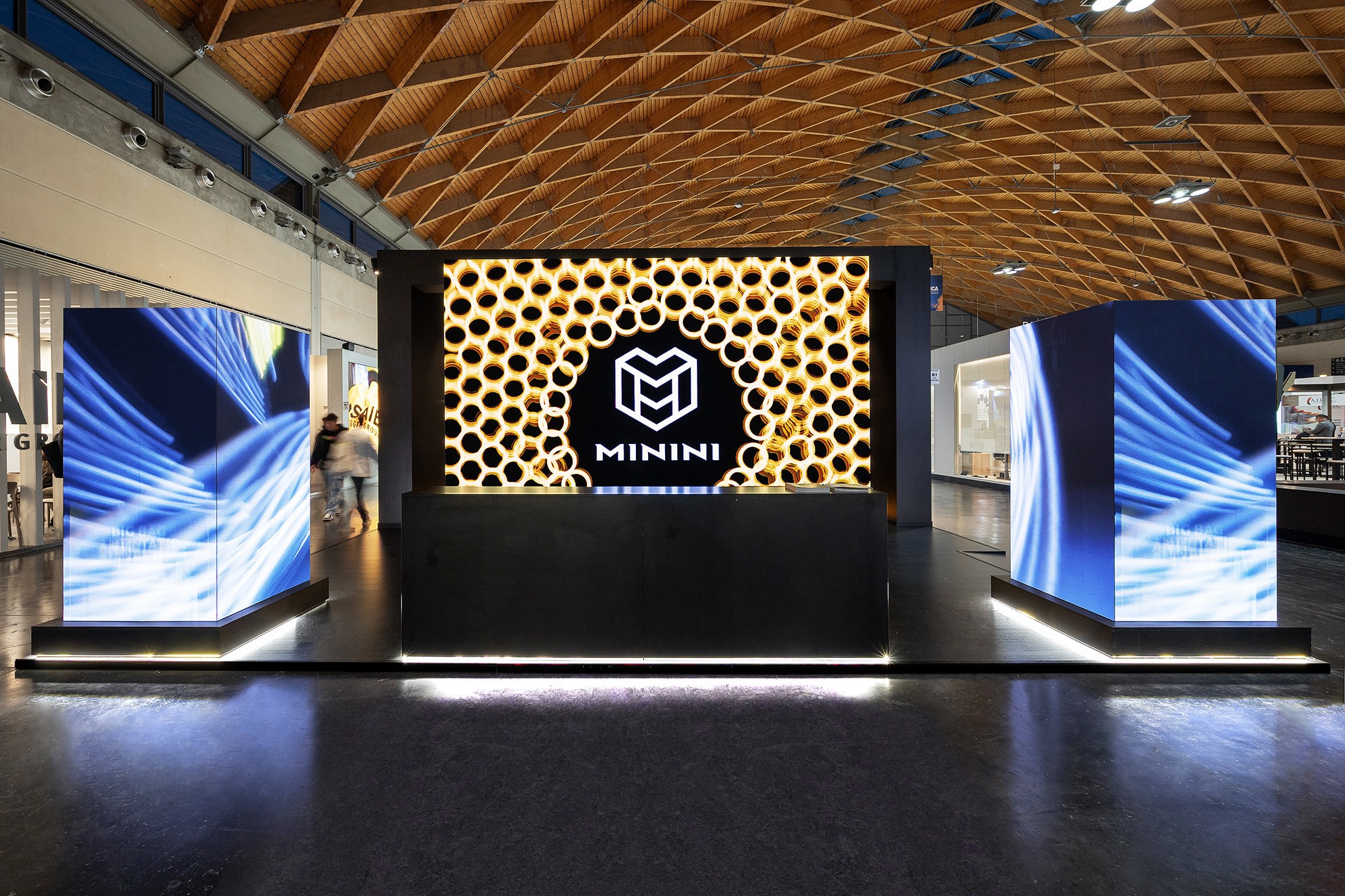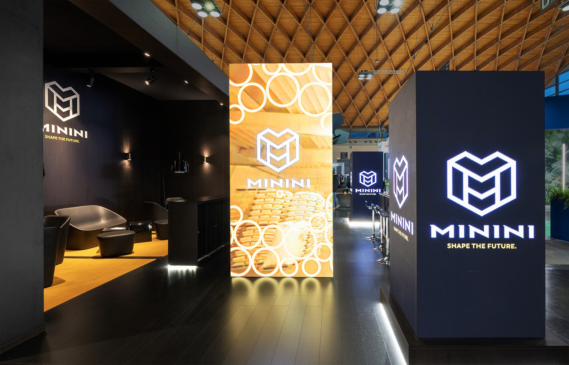 Stands with a modern and striking design, characterized by dynamic LEDwalls, including column-shaped LEDwalls, which enhance the central logo and create an engaging atmosphere. The elegantly furnished interior spaces offer a cozy area for meetings, while the careful details and lights attract the attention of visitors.
