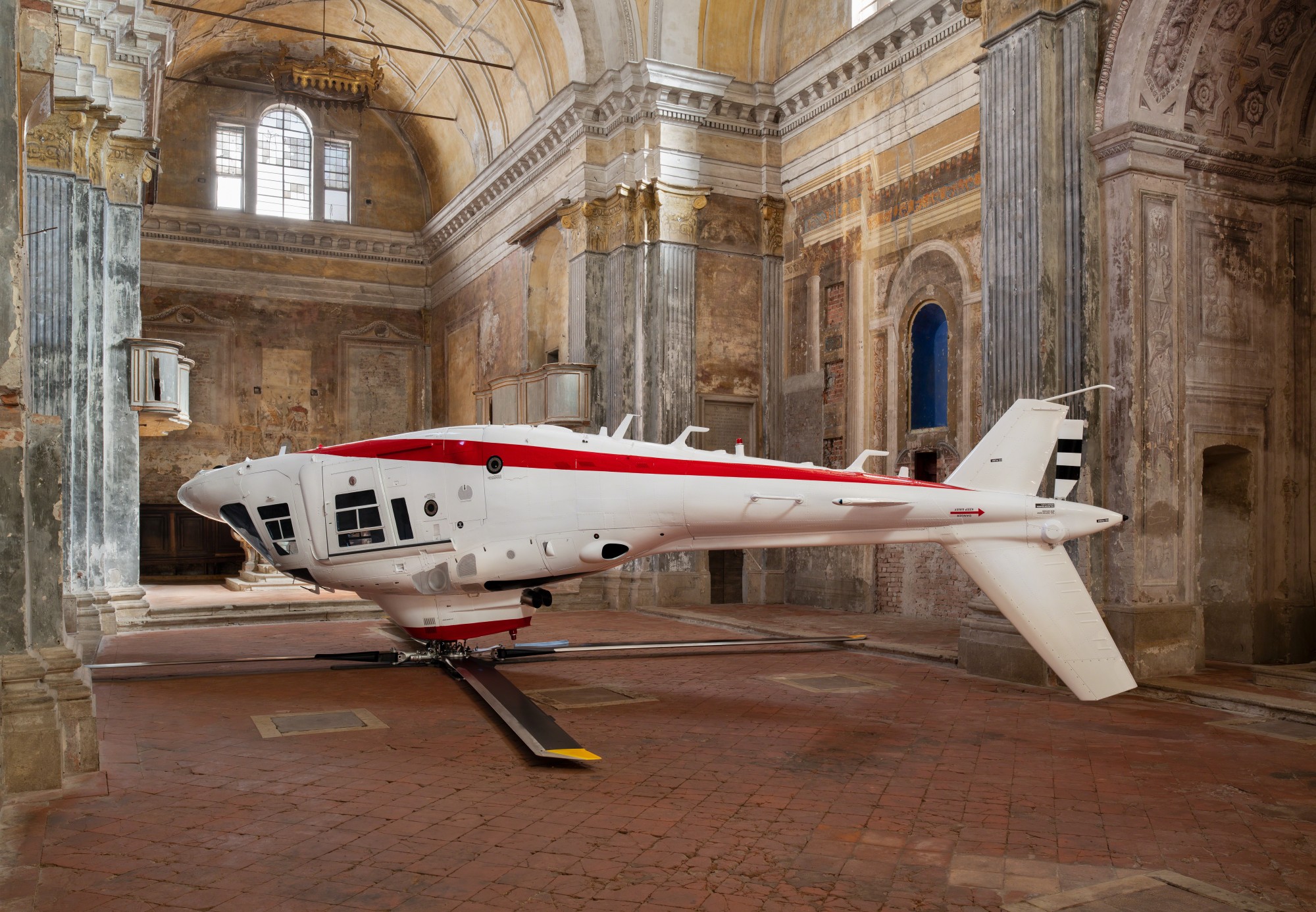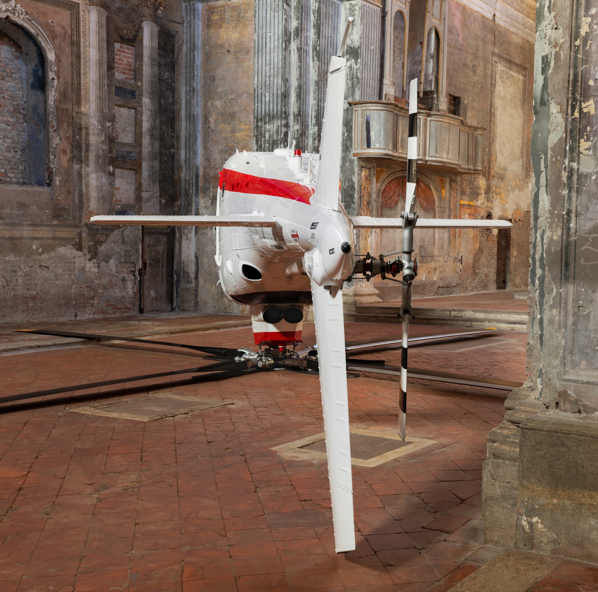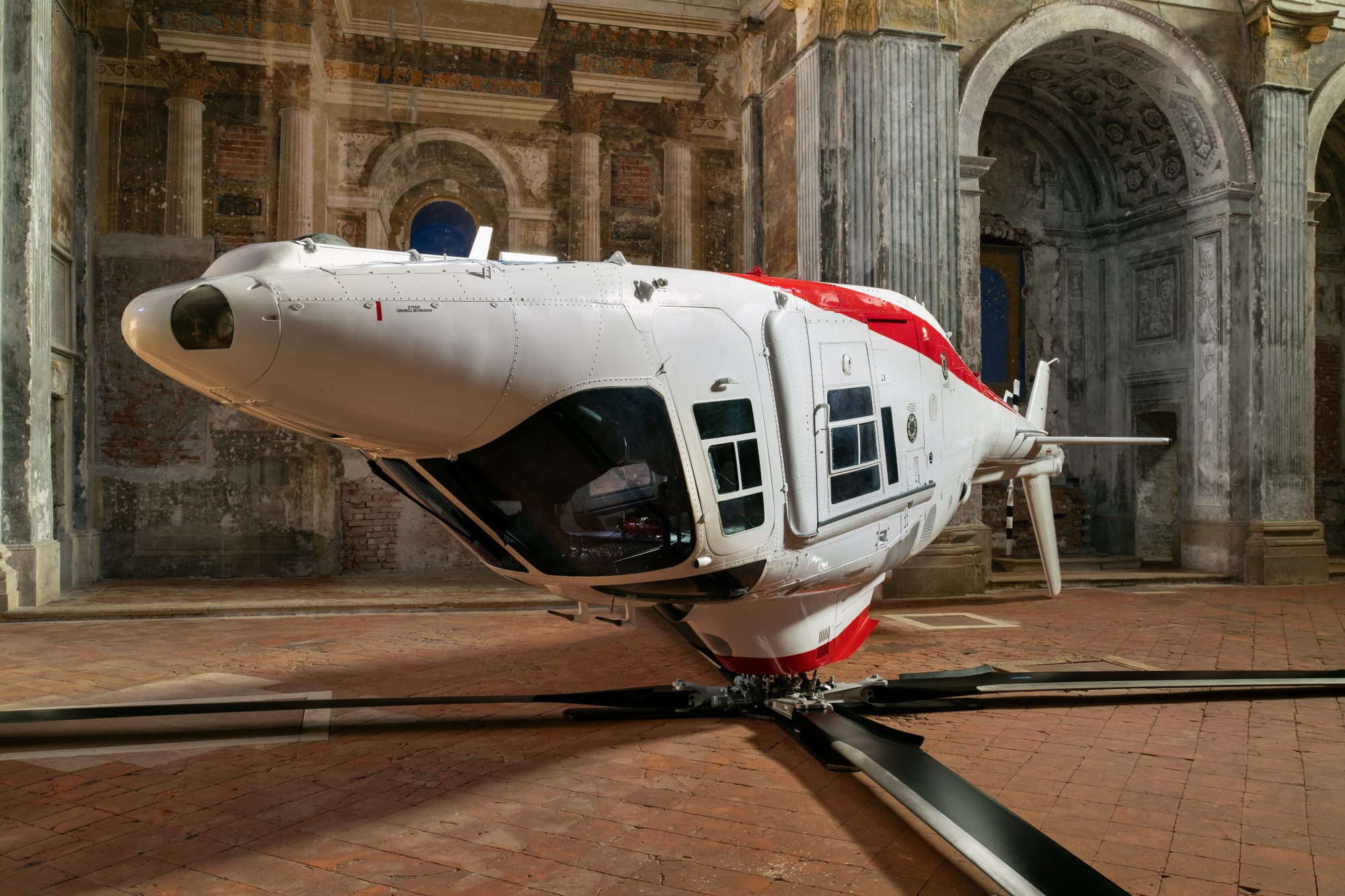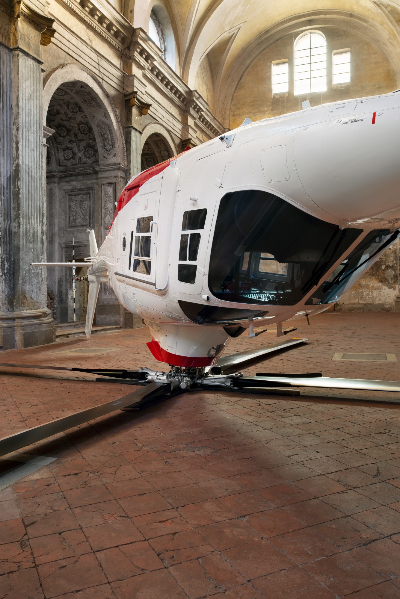 Form. The Creative Group collaborated with Paola Pivi on the creation of "A helicopter upside down", exhibited at San Carlo Cremona. For this project, Form Group leveraged its vast and diverse expertise, demonstrating versatility and ability to manage multiple technical and production aspects. The artwork consists of an Agusta 109 helicopter turned upside down - an intervention that subverts the perception of the object and amplifies its expressive potential.