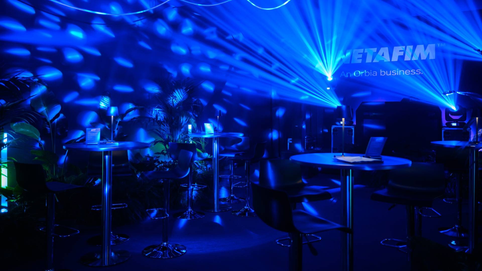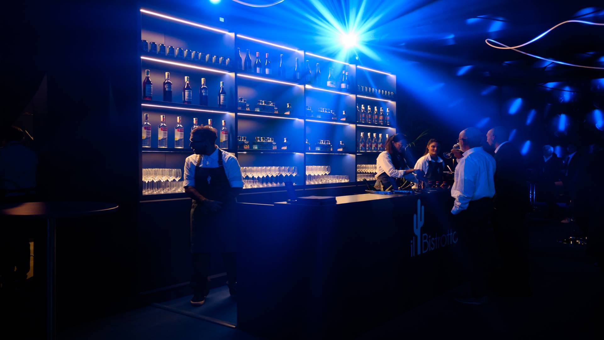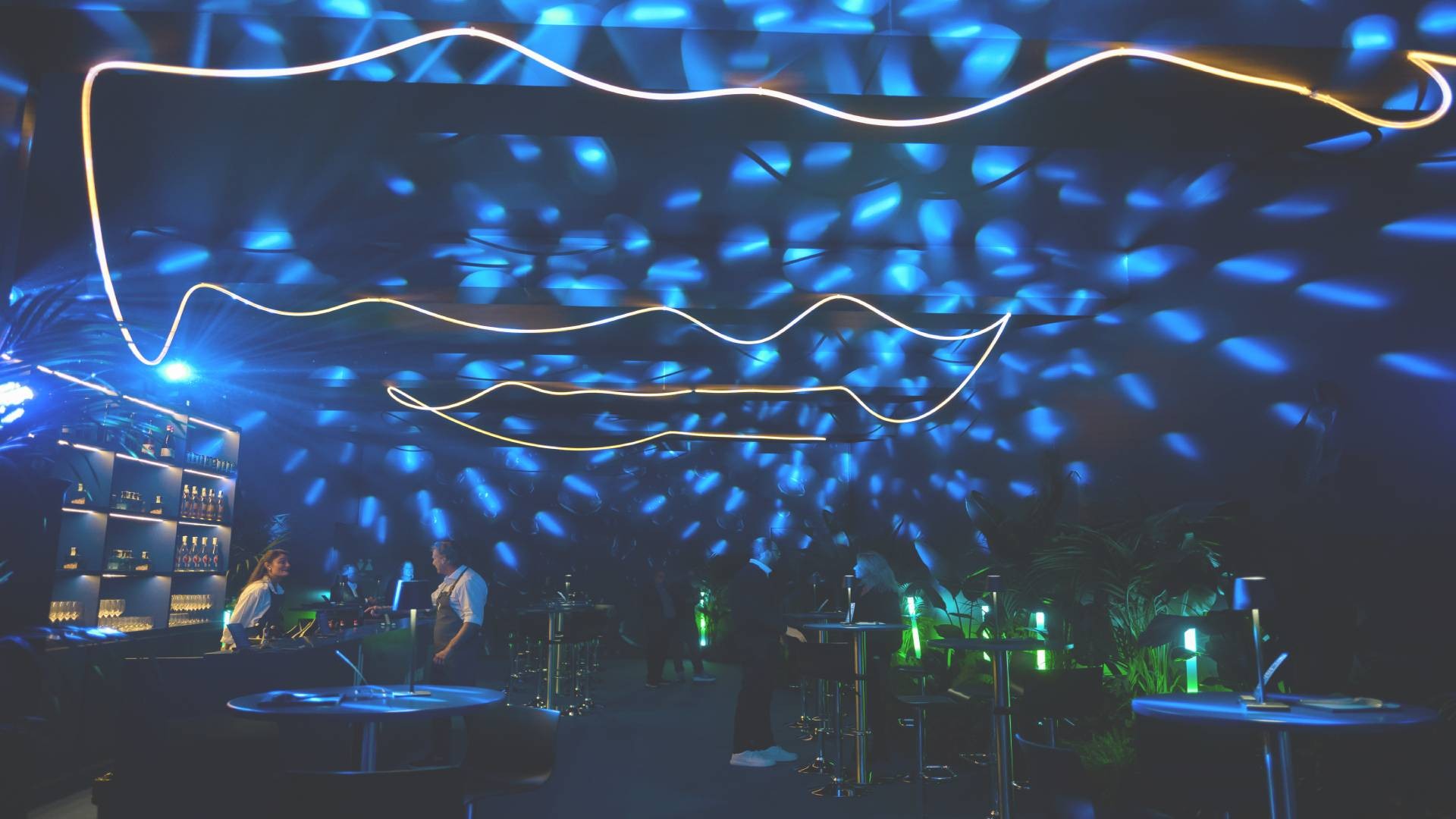 An immersive and suggestive event, characterized by a scenographic lighting with plays of lights that create a unique atmosphere. The spaces, enriched by natural elements such as plants and bright details, offer an elegant and welcoming environment. The lounge area and bar, with a modern and linear design, complete the experience, making the event an unforgettable moment for participants.