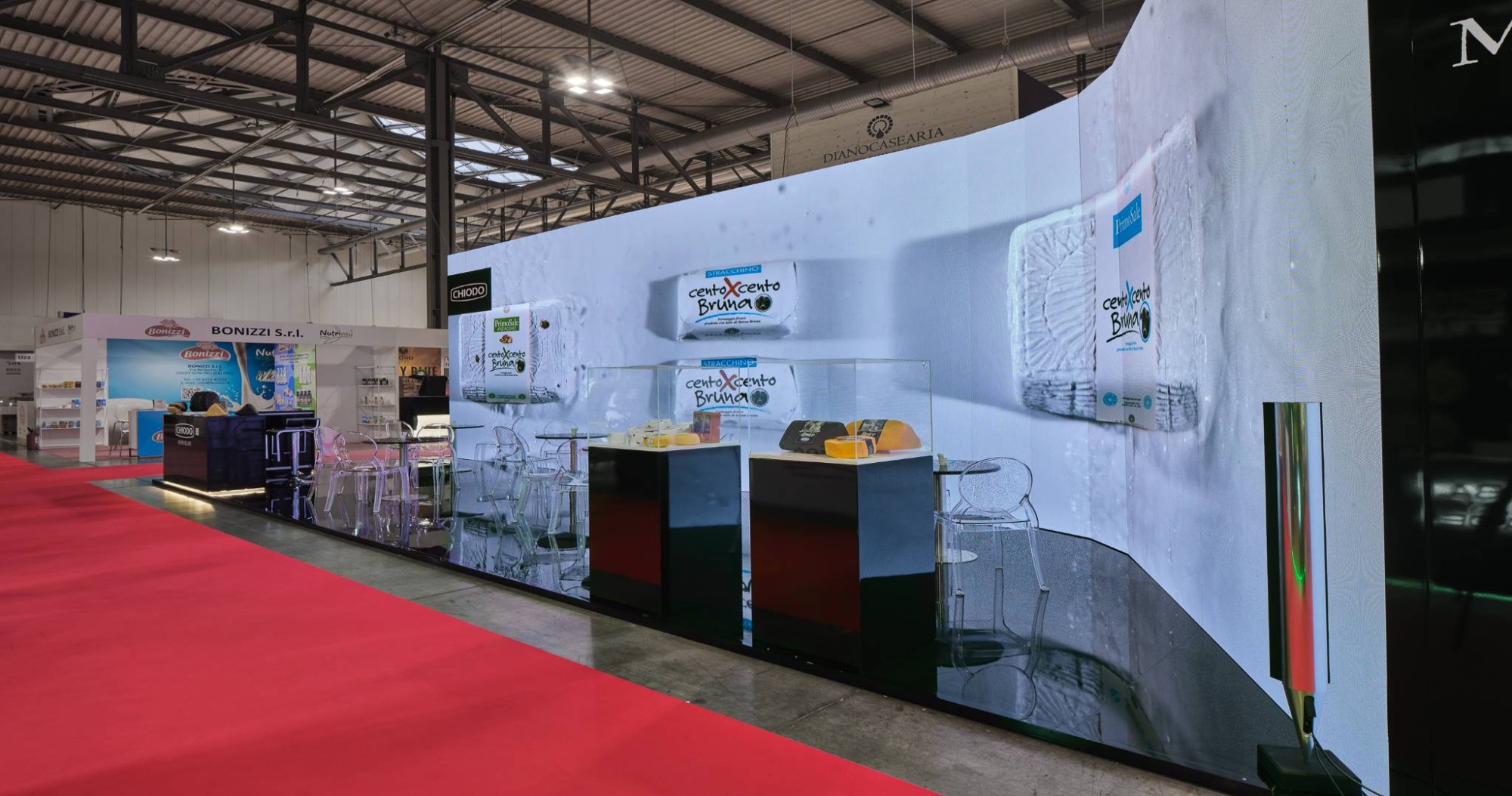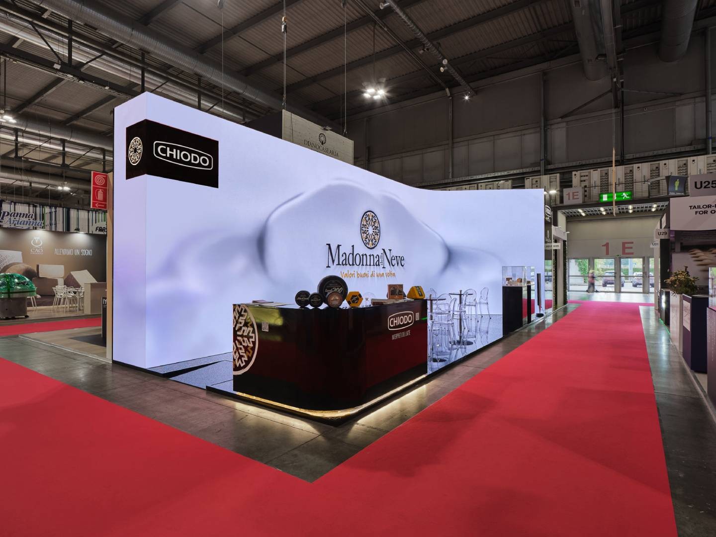 An elegant, high-impact space built around a curved LED wall and designed for video-first communication. To make a trade fair stand truly effective, we handle the entire video production in-house, crafting tailored content for events and exhibitions. This allows us to fully harness the potential of the LED wall, creating dynamic visual rhythms that enhance brand identity and deliver a strong “wow” effect.