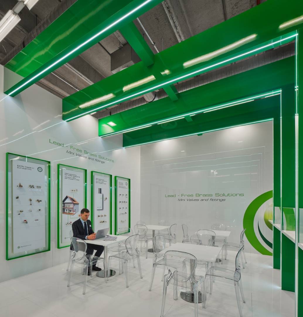 The stand showcases a clean and elegant design, conceived to create a clear and professional visual impact. A large LED wall positioned behind the reception displays dynamic content that highlights the technical features of the product. Lacquered finishes and the brand’s iconic green give the space a strong, harmonious, and instantly recognizable identity.