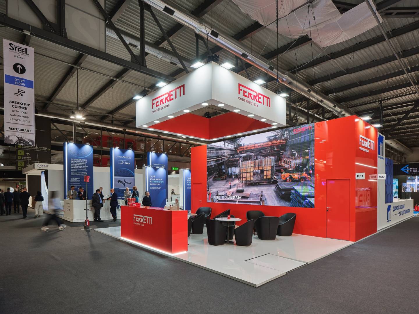 A design example that highlights the vibrant contrast between white and red, creating a perfect balance between elegance and dynamism. The space welcomes visitors with an impressive LED wall behind the reception that illuminates and tells the brand’s story, while the central hanging fixture with spotlights brings the environment to life with captivating light effects. Created by FORM. The Creative Group for the Made in Steel fair in Milan, it represents the perfect blend of innovation, craftsmanship, and strong visual impact.