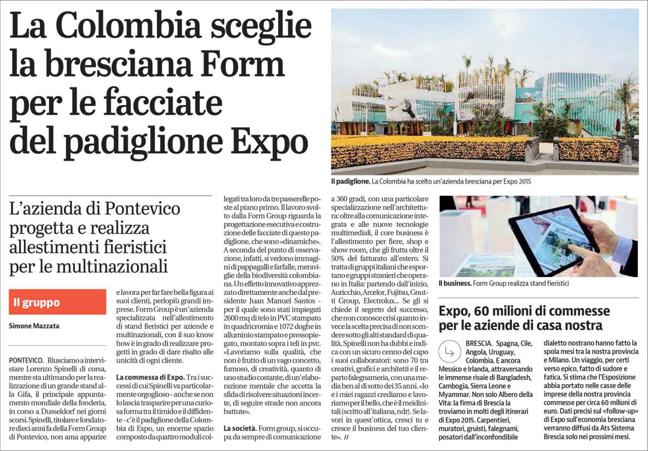 Our interview about the success of the Colombia pavilion at Expo 2015 was published in the Giornale di Brescia on June 21st. We were responsible for the design and construction of the innovative dynamic effect that changes depending on the viewing angle, highlighting the wonders of Colombian biodiversity—a feature greatly appreciated by President Juan Manuel Santos.