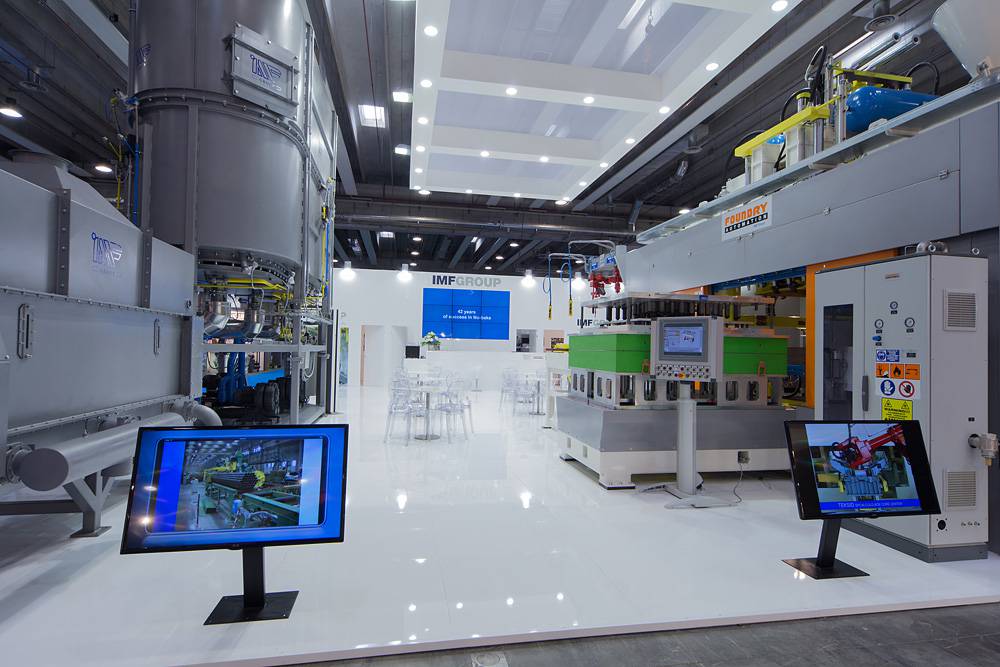 Form succeeded in this goal by giving space to the machines, making them accessible from all sides without obstructions, and adding a touch of innovation and interactivity thanks to the presence of video walls, totems, and TV screens around the entire perimeter of the stand.