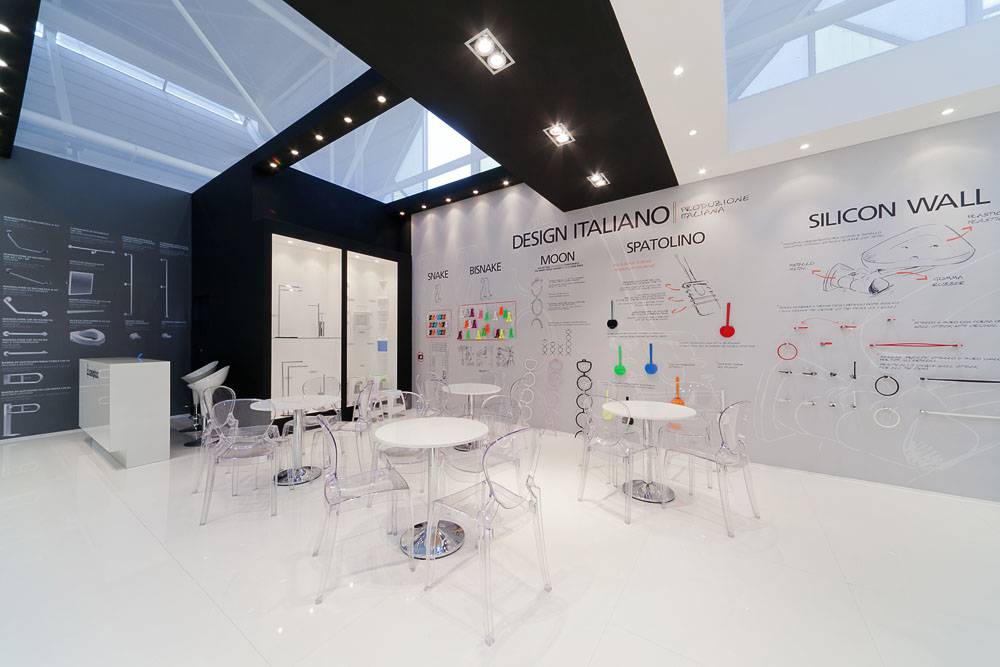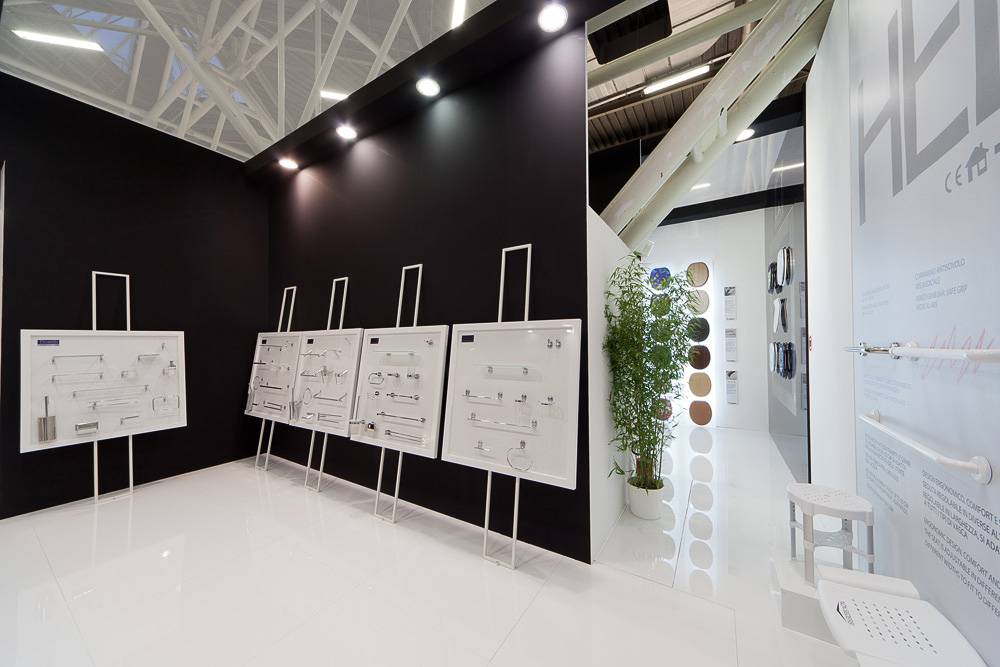 Saniplast, a company specialized in the design and production of toilet seats and accessories and complements for bathroom furnishings, entrusted Form with the realization of their stand setup, requesting particular care in creating product displays both wall-mounted and freestanding.